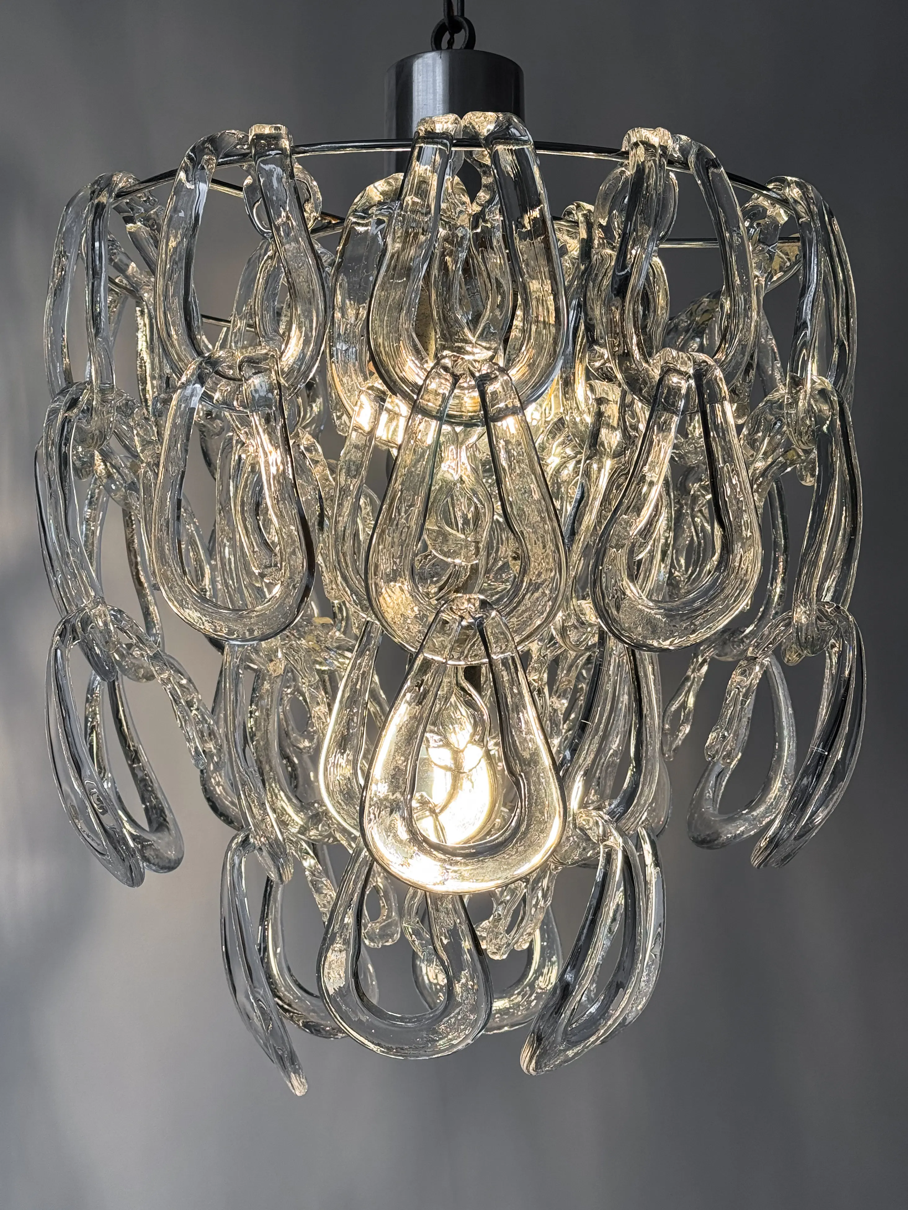 Handblown vintage Murano glass chandelier by Angelo Mangiarotti for Vistosi. Made in the 1970's Italy. 57 handblown modular glass hooks that can be built in multiple ways. A true centrepiece for your home. In the pictures we have assembled it in 3 different ways to demonstrate. Chrome frame with 3 x E27 lightbulb. Each handblown glass piece is in great condition. Has been cleaned, inspected and tested by Mendera.