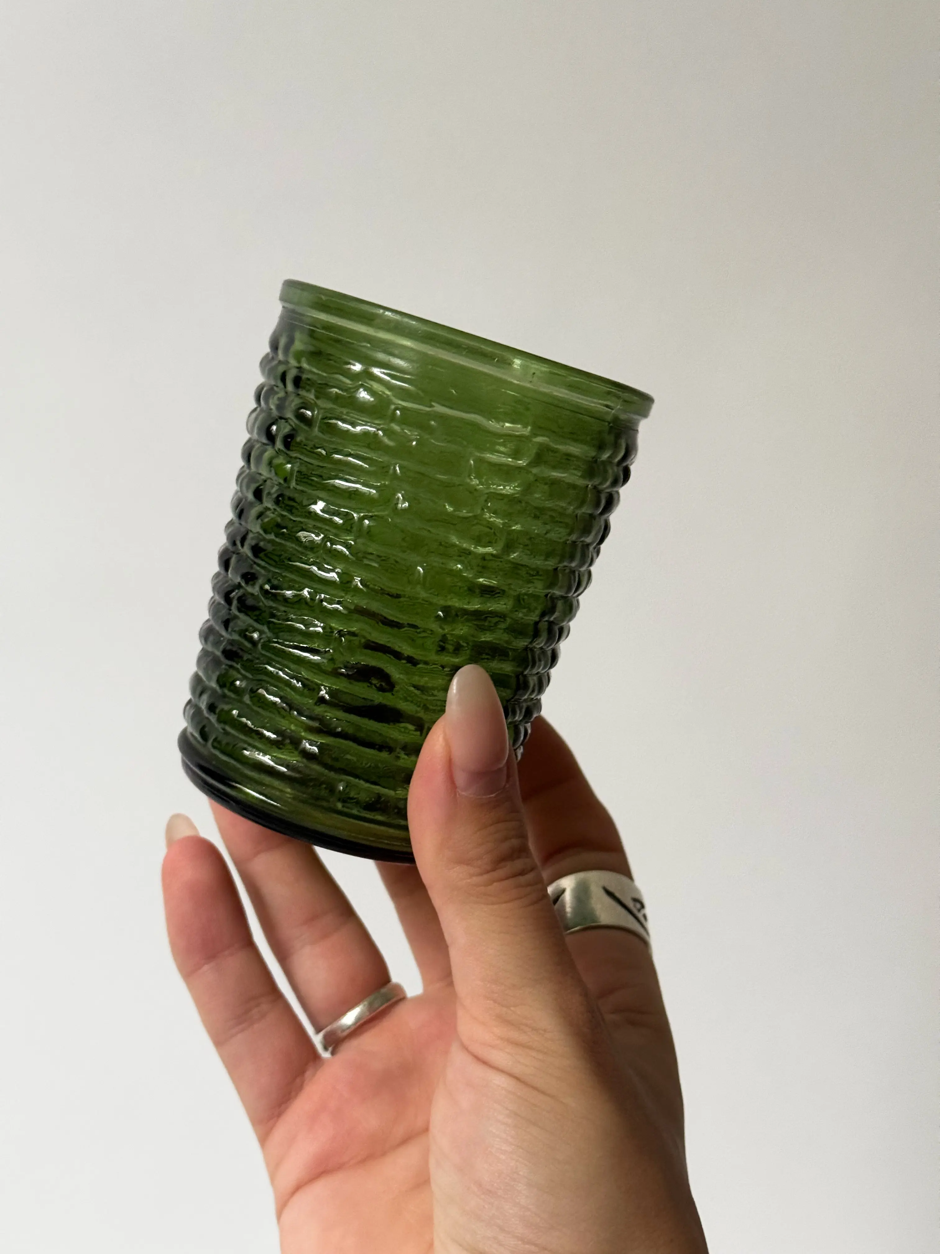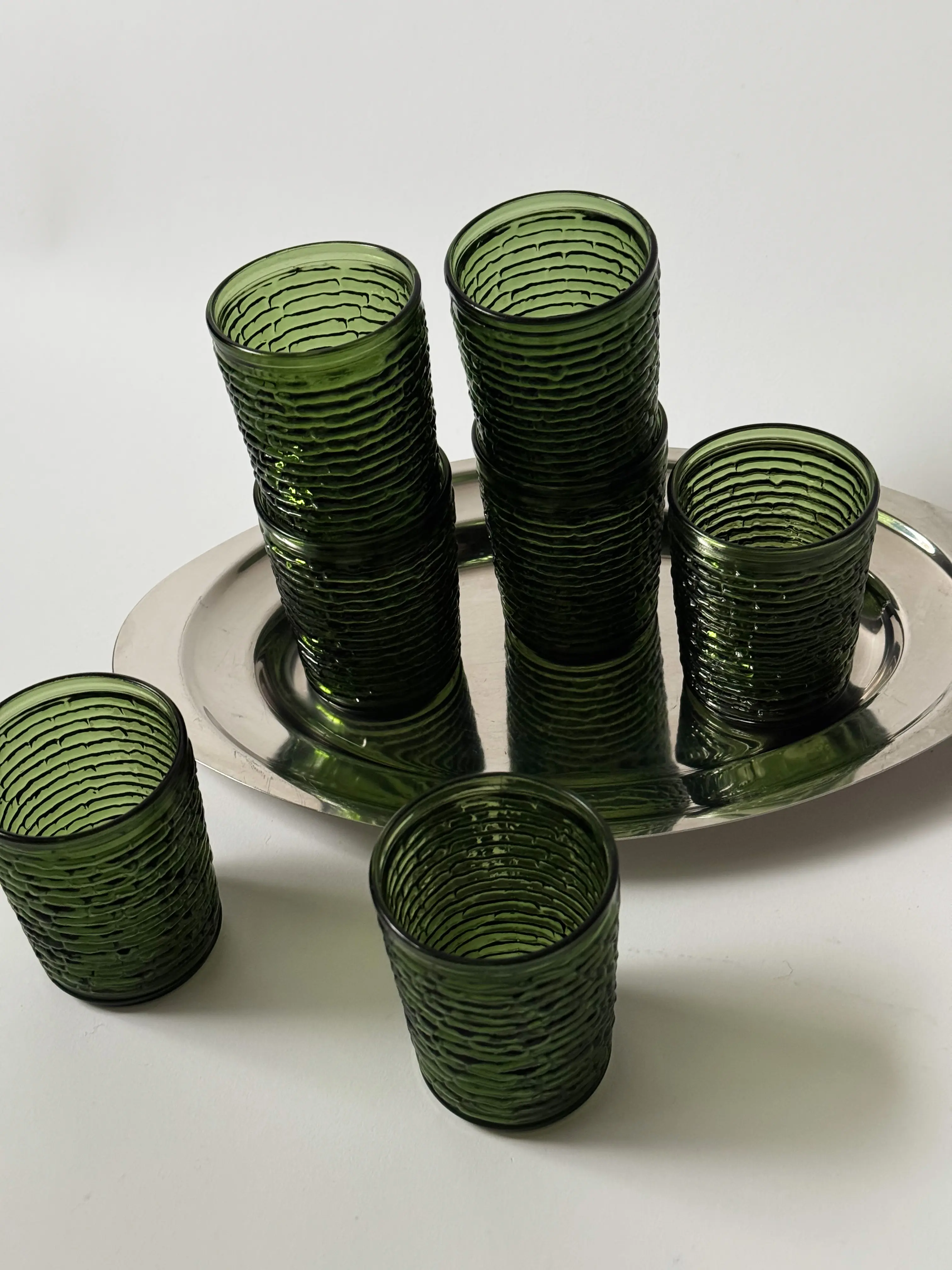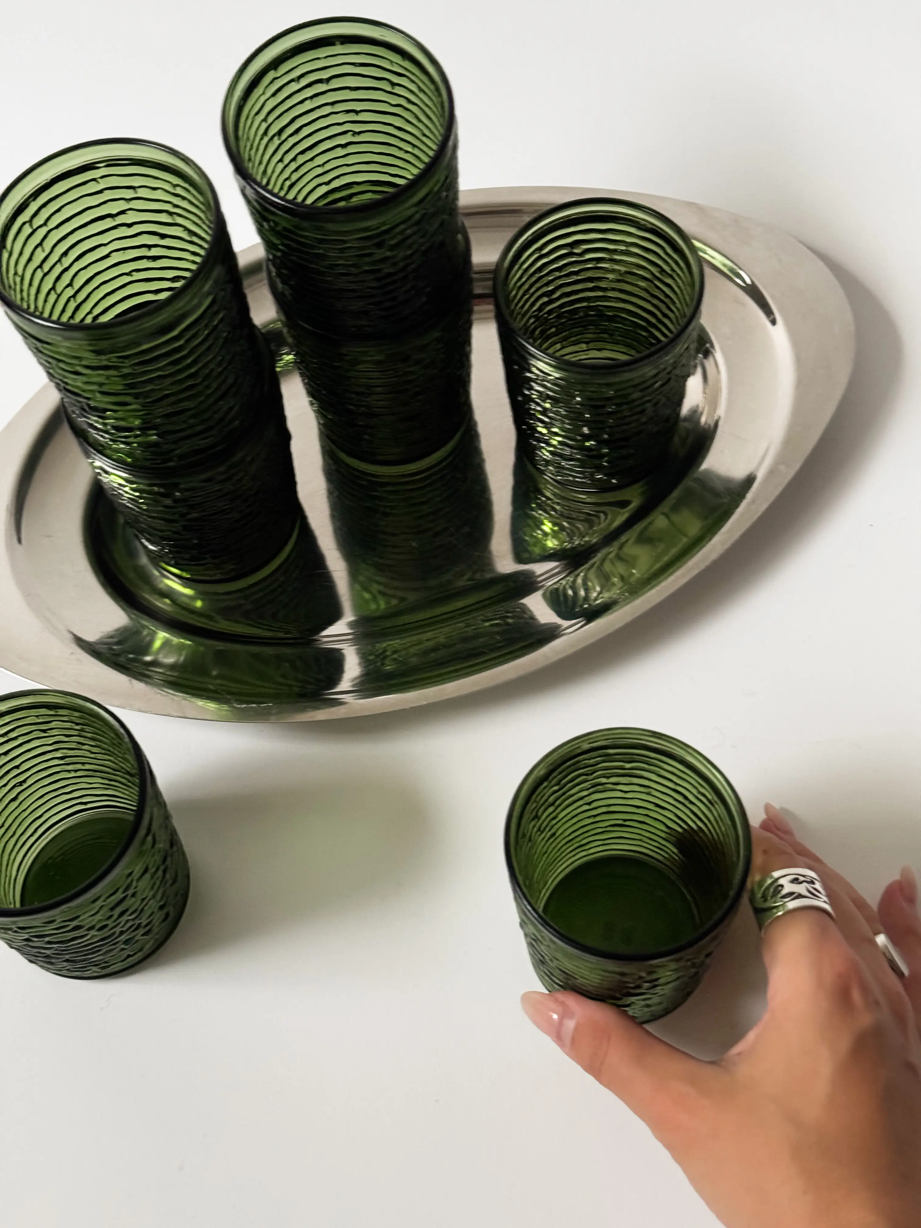 Set of seven green water glasses by Karhulan lasi, made in Finland. In great vintage condition. Has been cleaned and inspected by Mendera.
