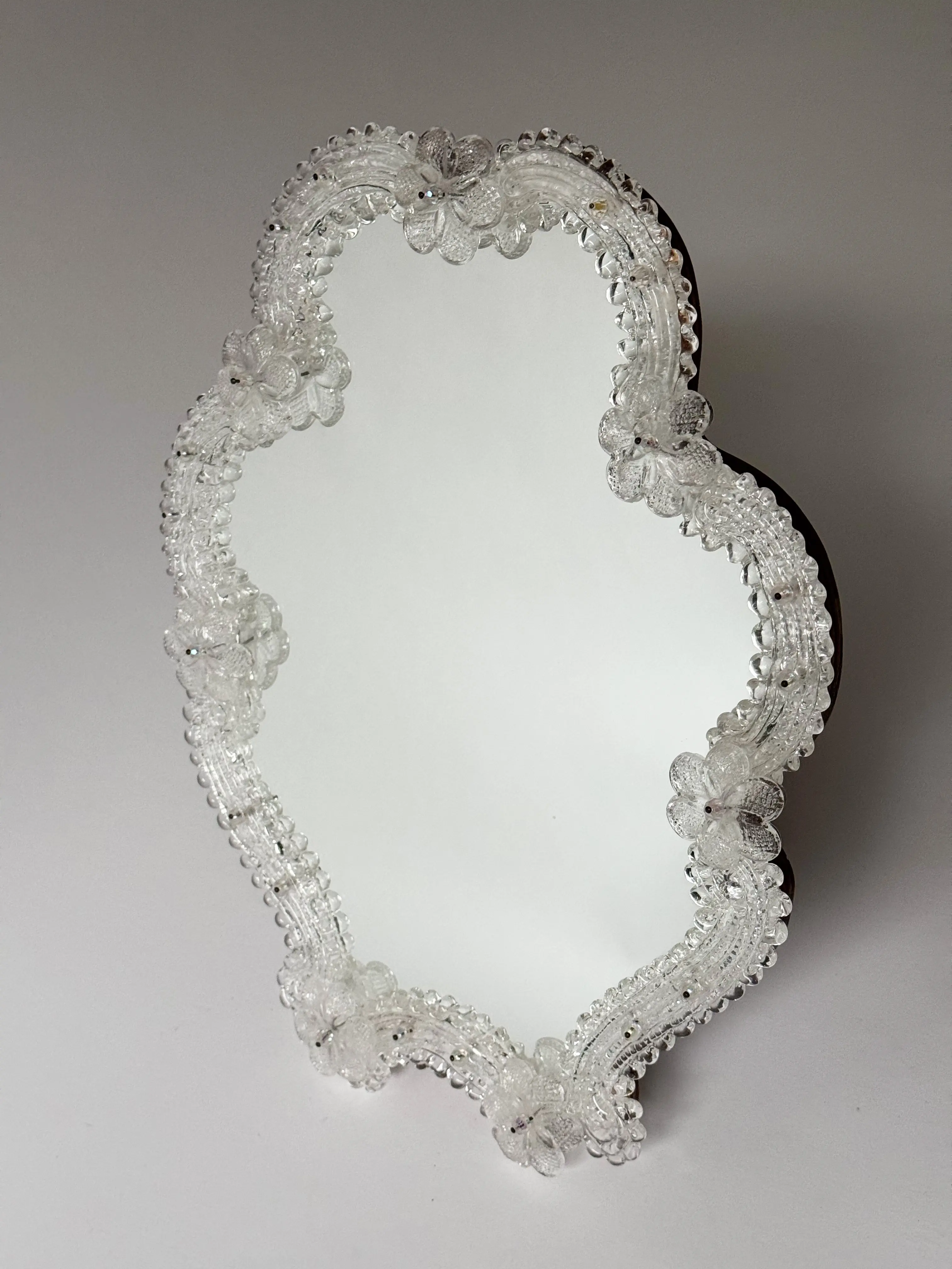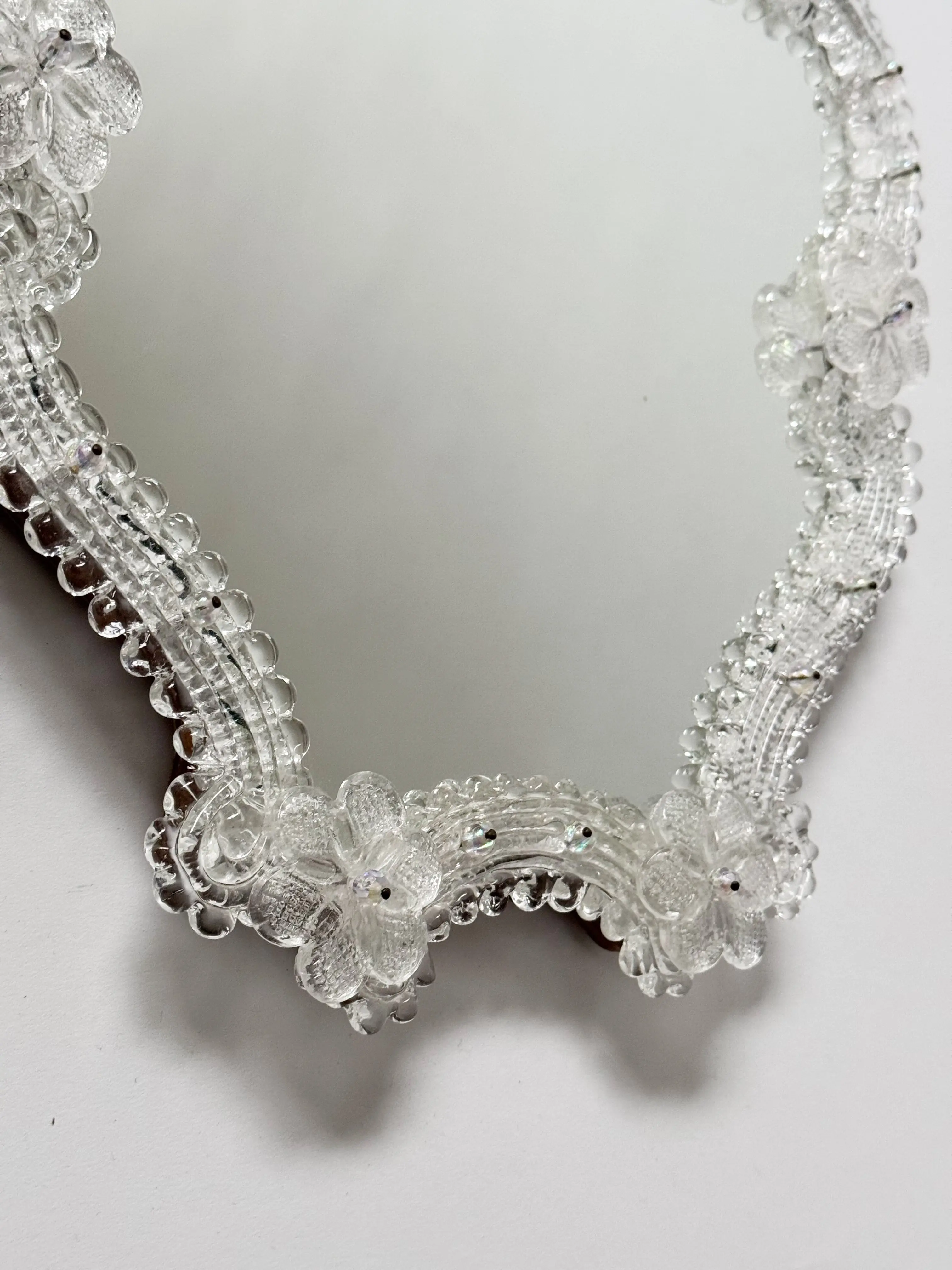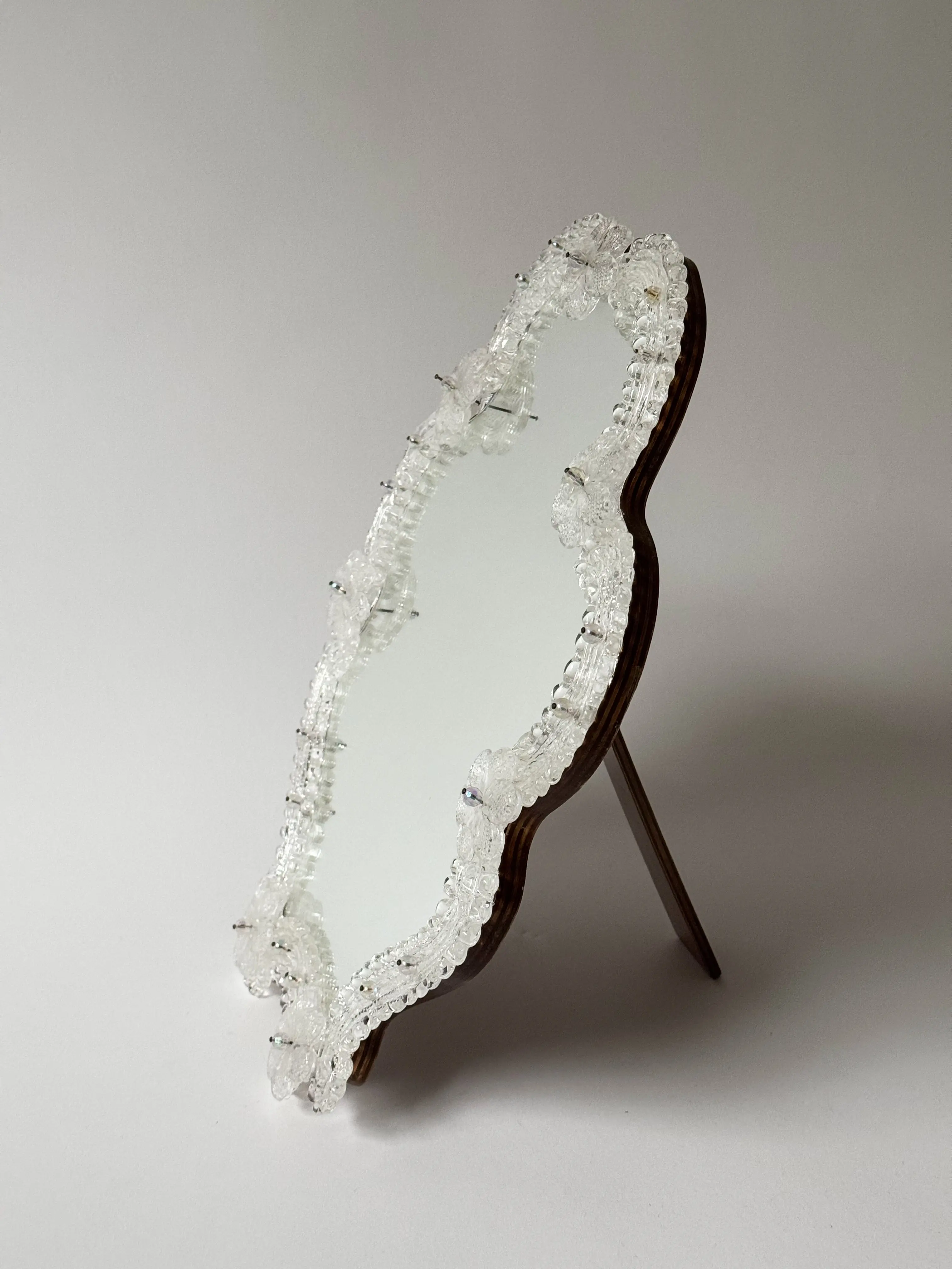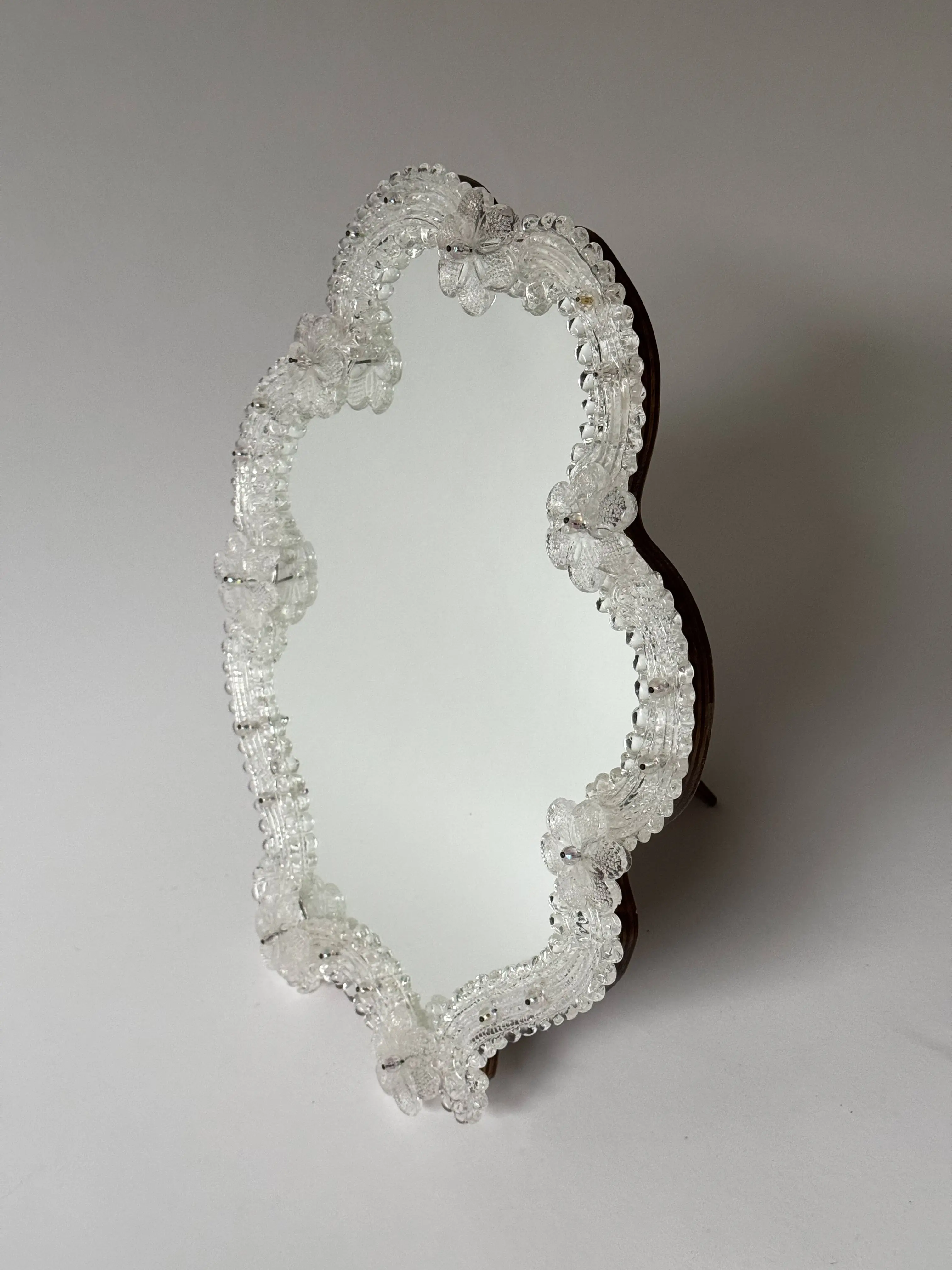 Handmade Murano glass make-up mirror from the 1960's. Original Murano label intact. Made in Italy. Glass frame with gorgeous floral details. In great condition! Has been cleaned and inspected by Mendera. For table use only (no hook).