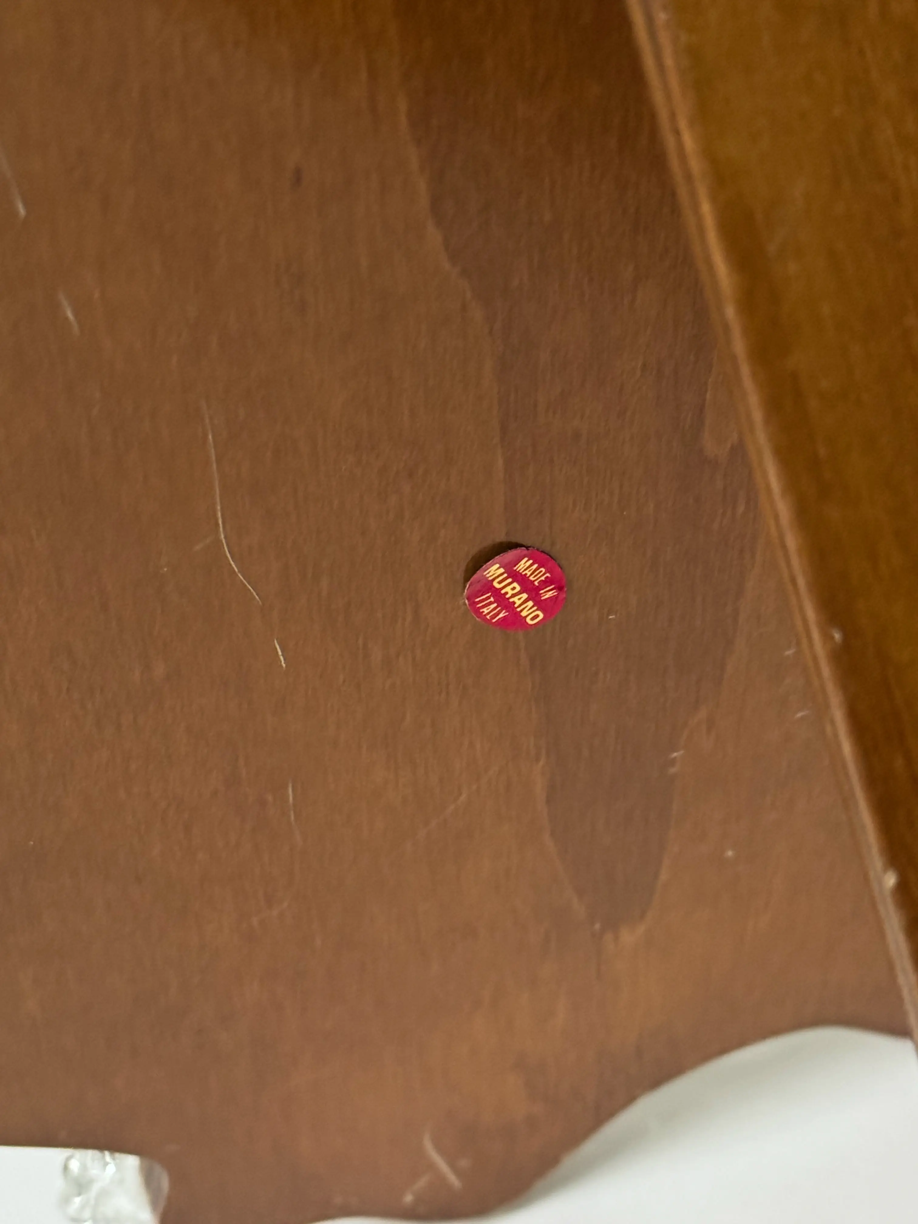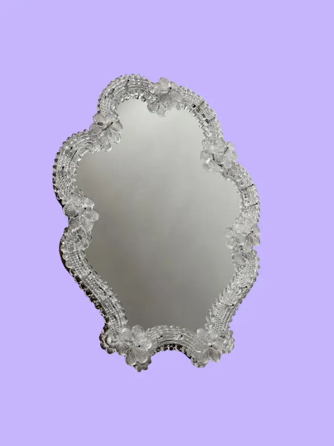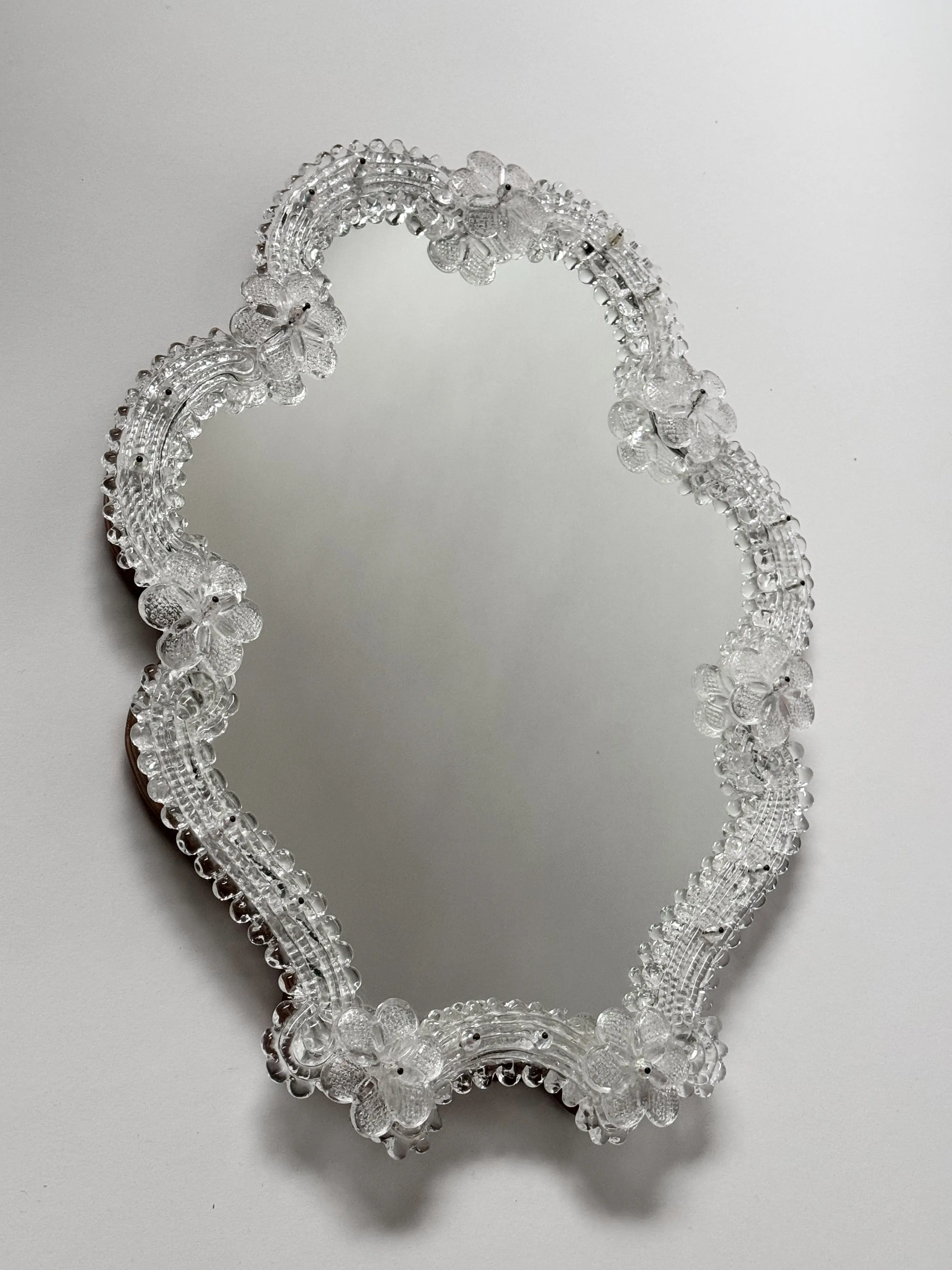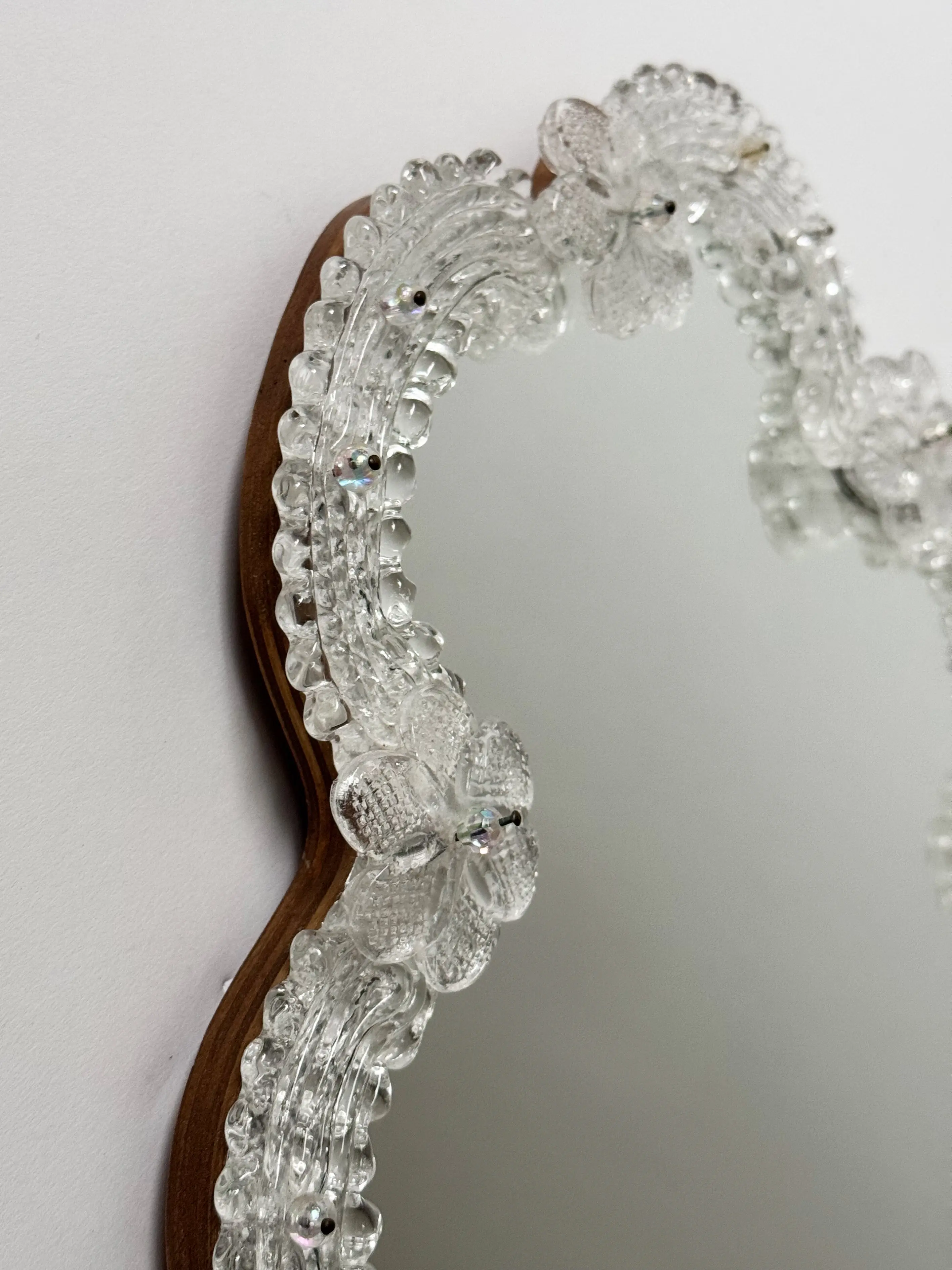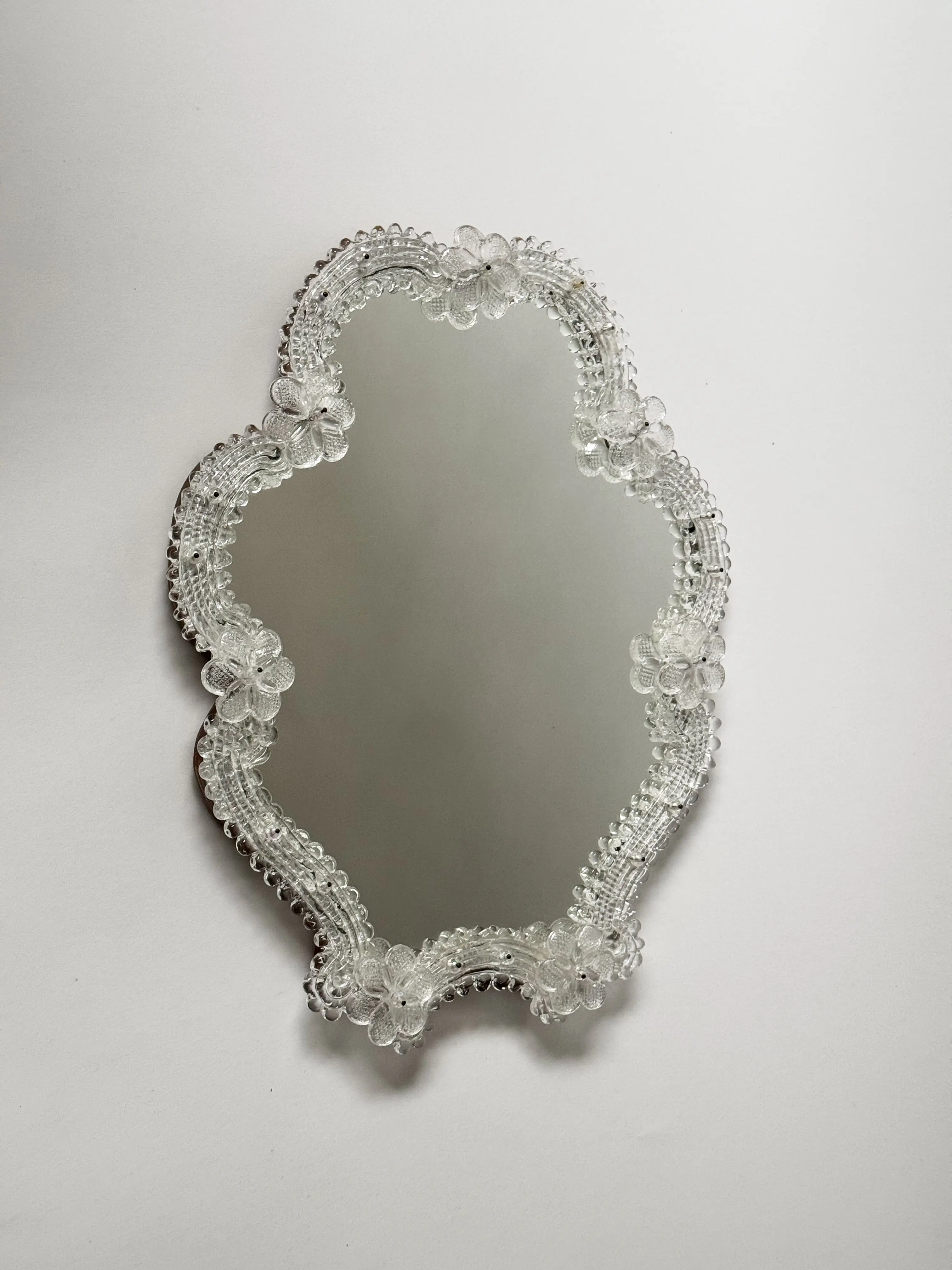 Handmade Murano glass make-up mirror from the 1960's. Original Murano label intact. Made in Italy. Glass frame with gorgeous floral details. In great condition! Has been cleaned and inspected by Mendera. For table use only (no hook).