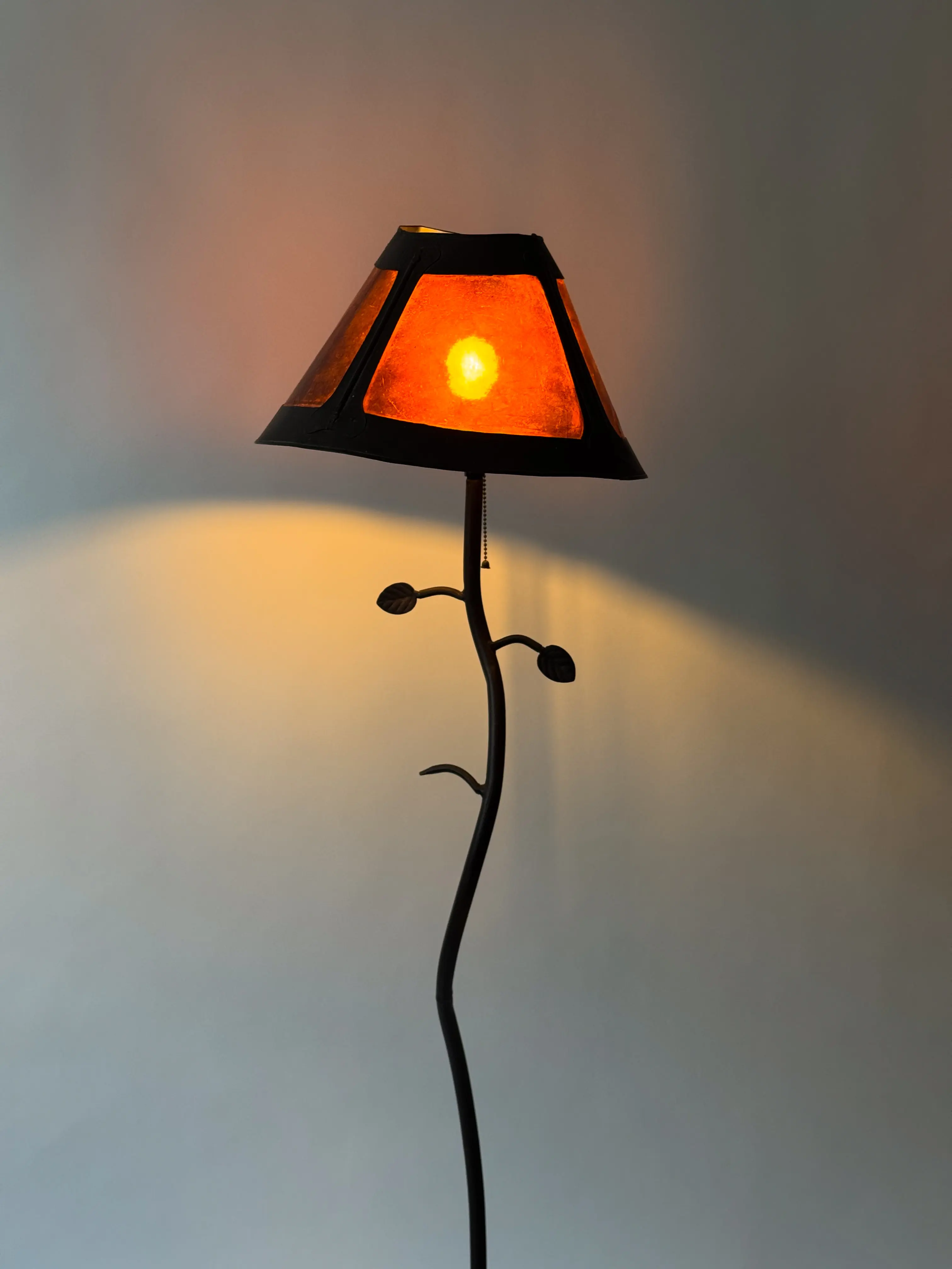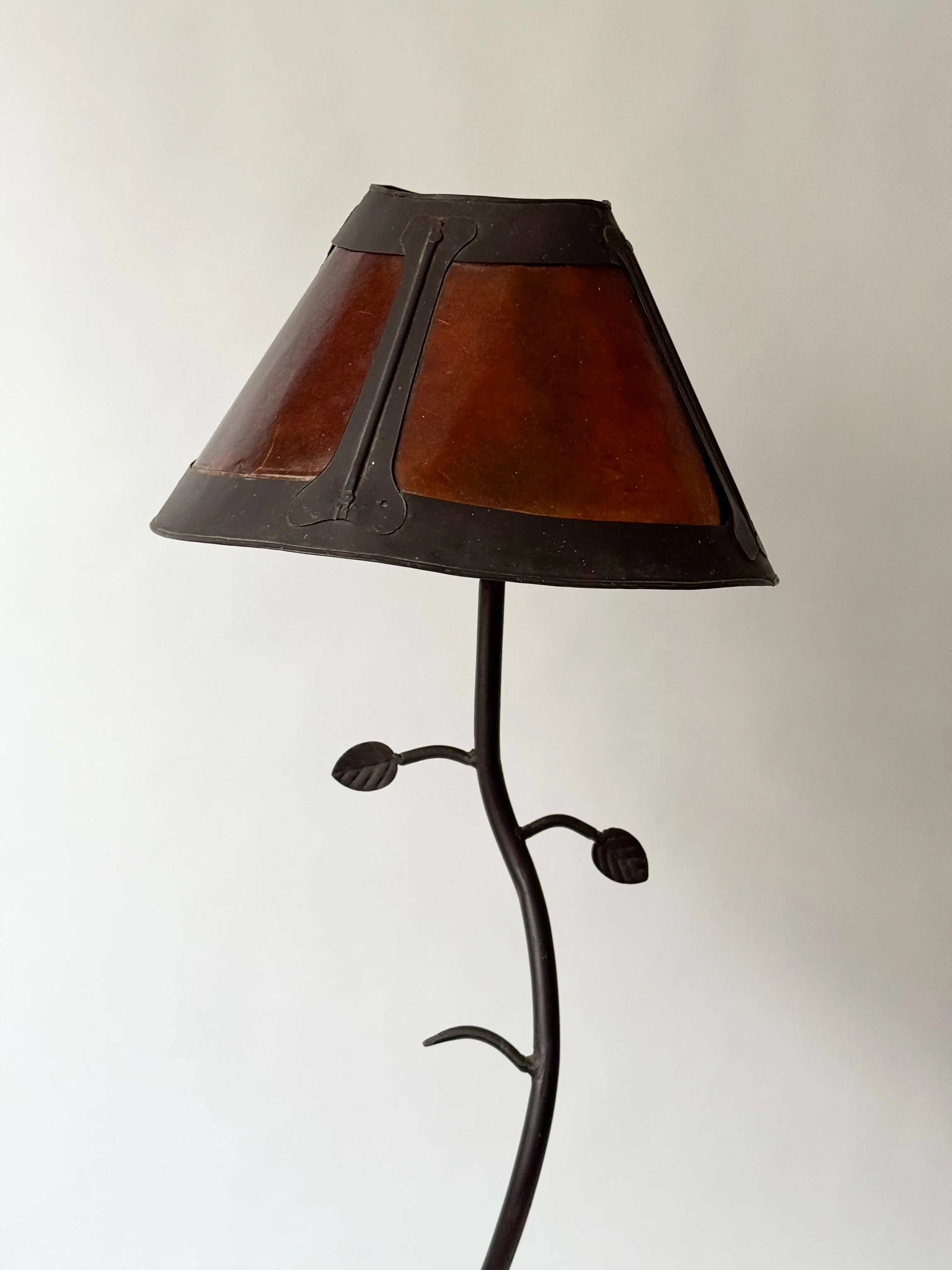 One of a kind vintage floor lamp in wrought iron and dark amber lampshade. Unique artisan work. Dating back to the 1960's Italy. Stunning leaf and swirl details on stem. Gives a lovely warm light to the space. In great vintage condition with renewed plug. Has also been cleaned and inspected by Mendera.