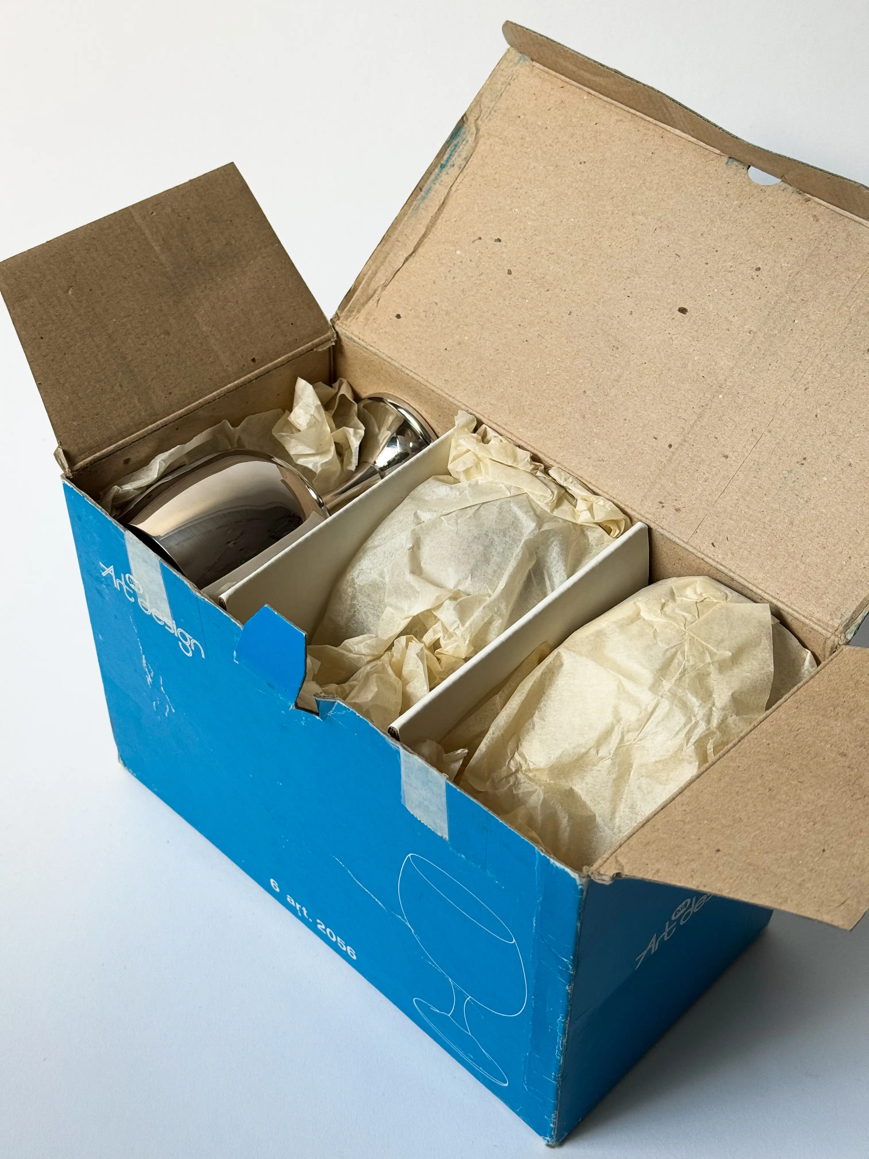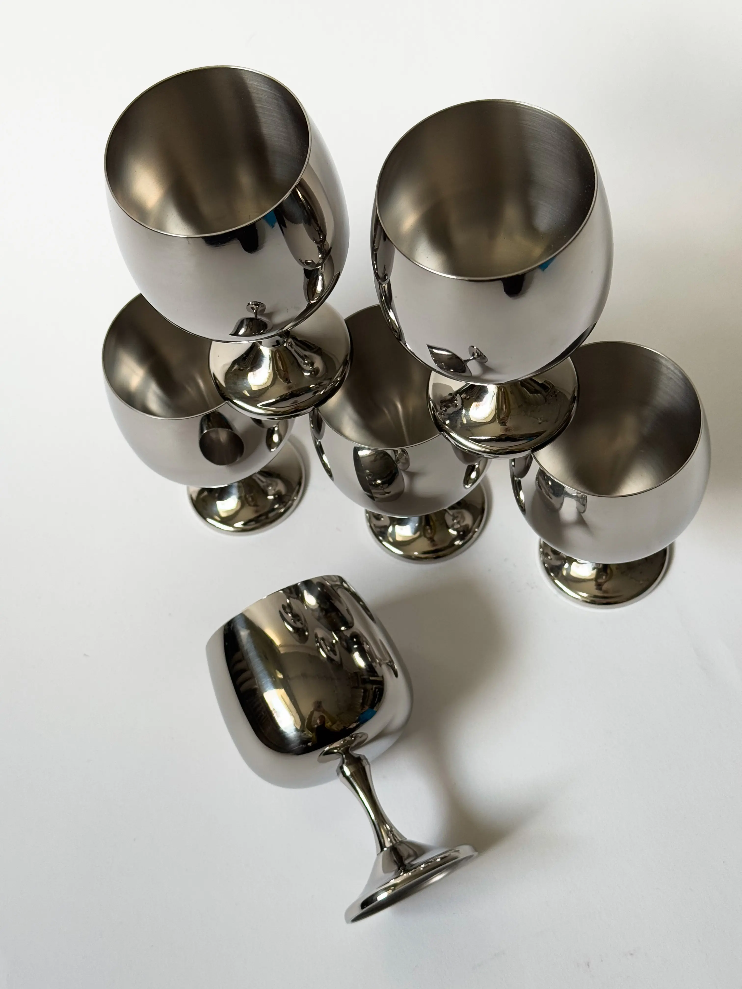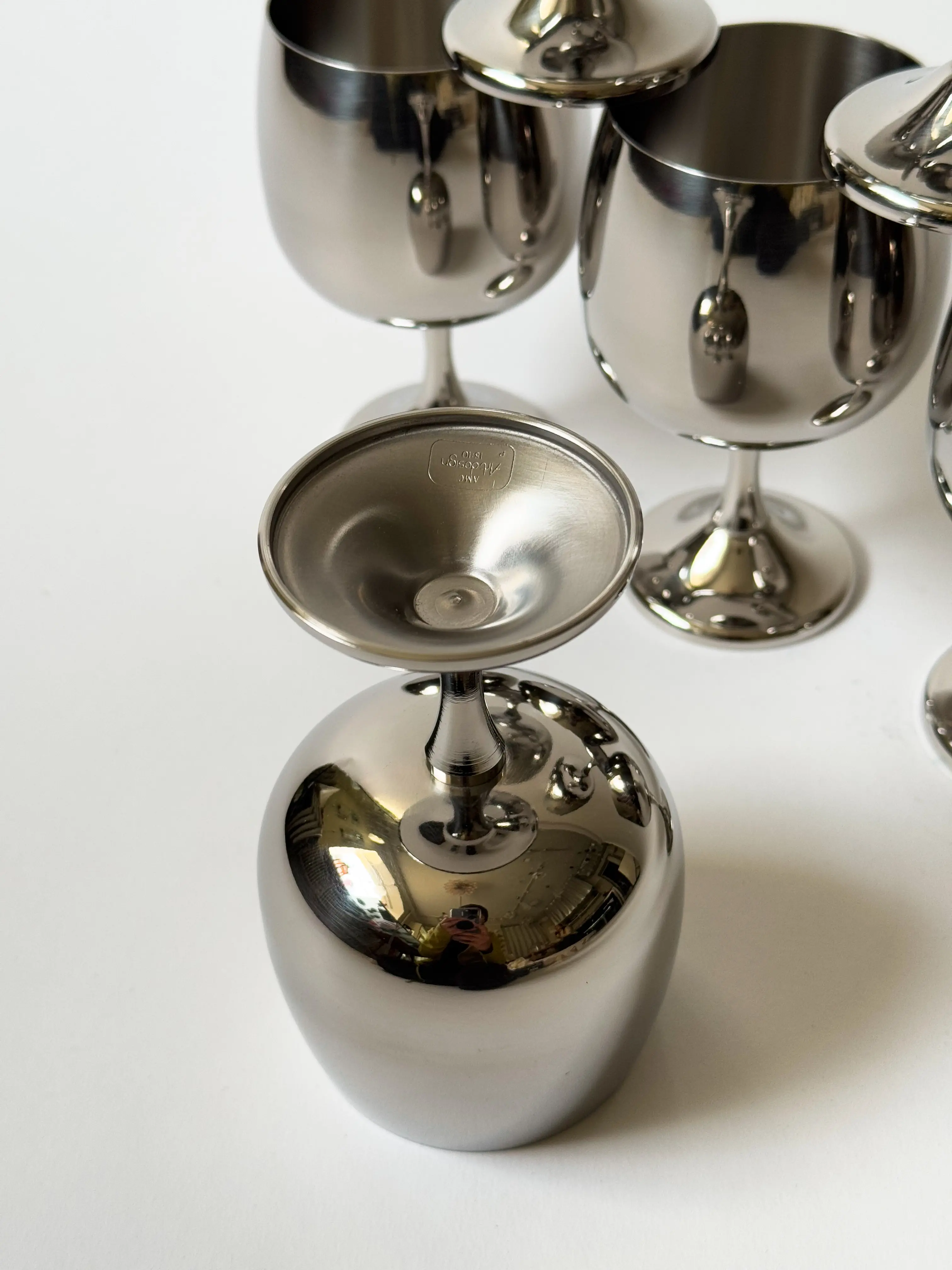 Stunning set of 6 AMC Art Design big wine cups in original box. Stainless steel, made in Italy. Makers label at the bottom of each cup. High quality make. In unused condition. Each cup still protected in plastic. Have been inspected by Mendera. Sold as a set.