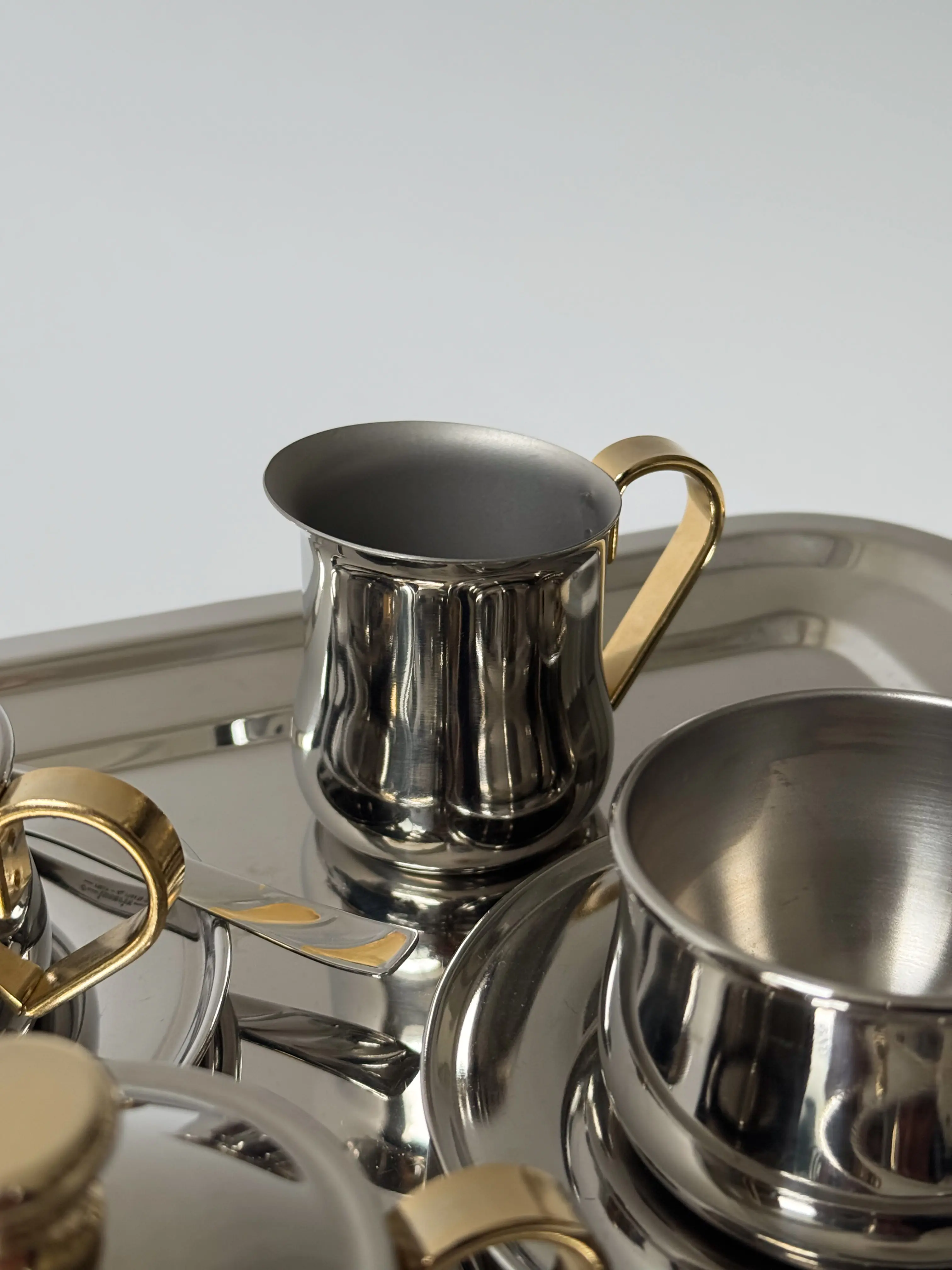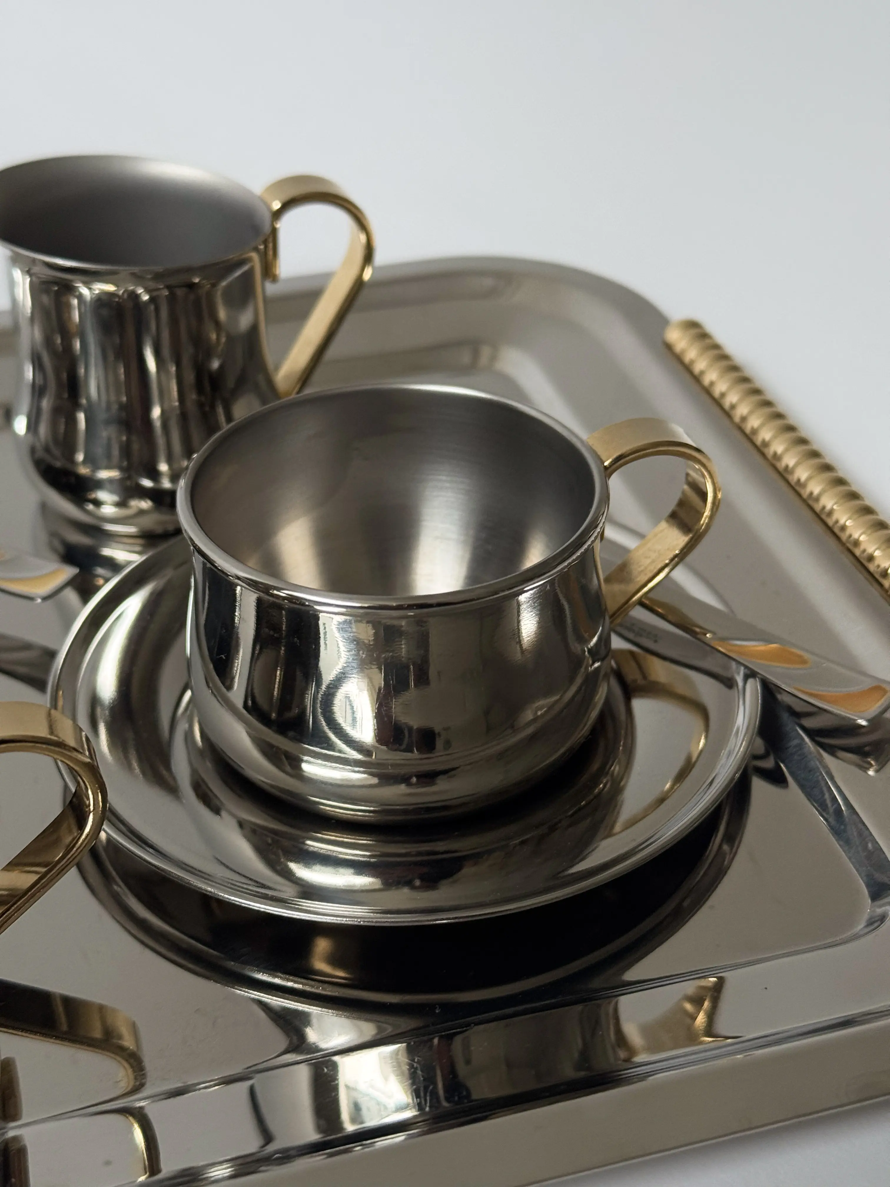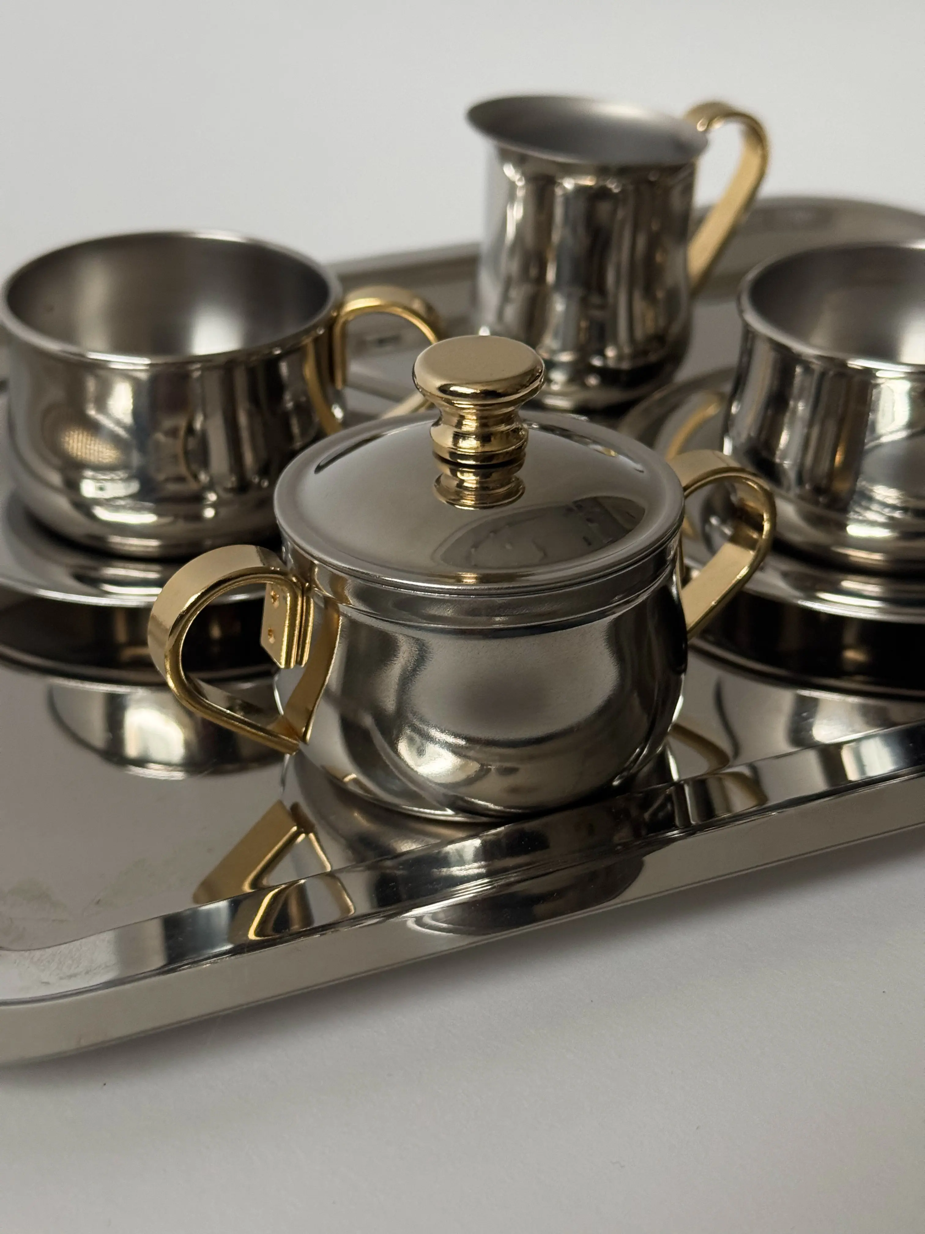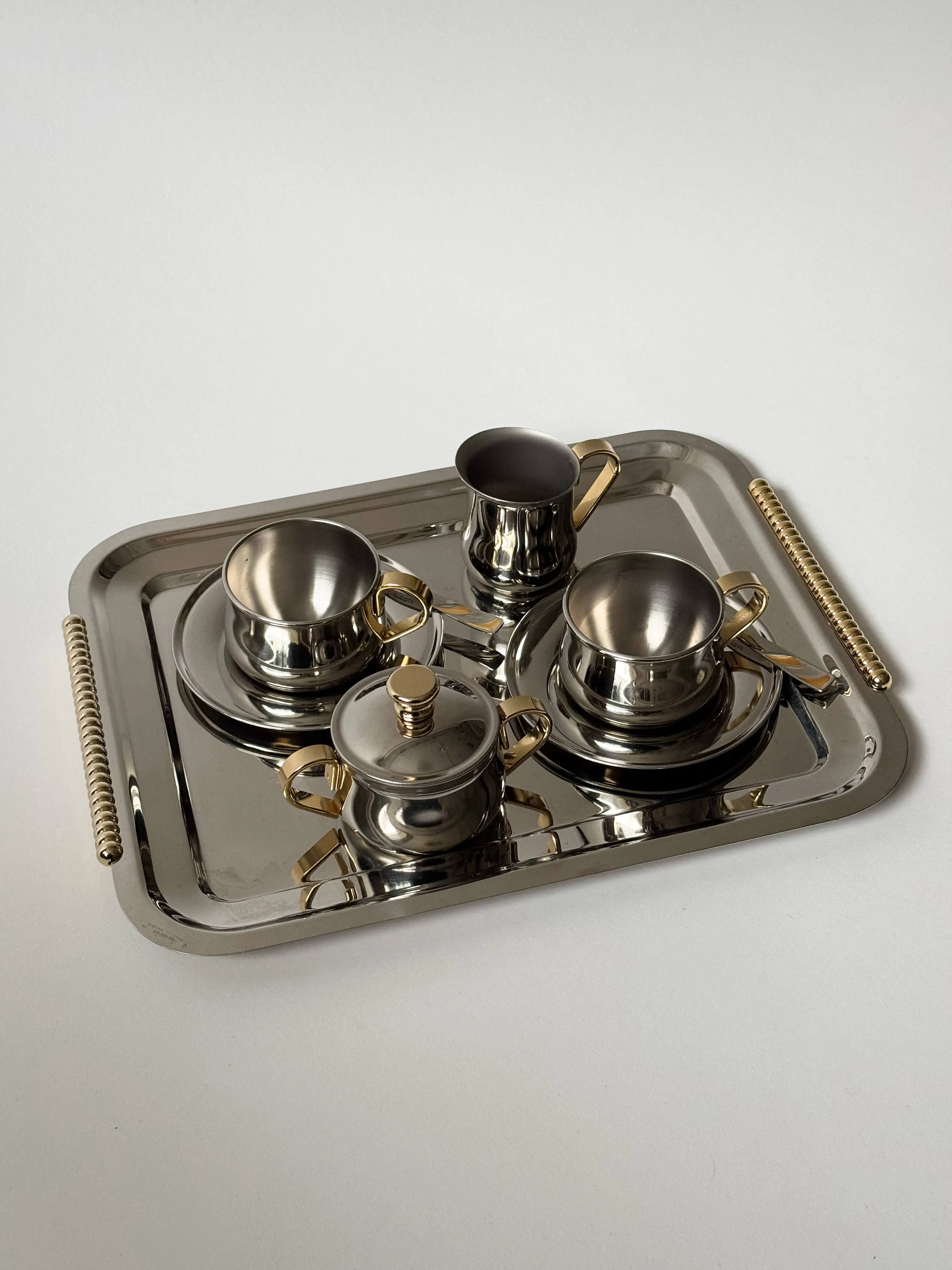 Vintage Italian espresso breakfast set. Stainless steel with golden details. Set contains: 2 x espresso cups with thermal lining, 2 x plate, 1 x sugar jar, 1 x milk jug and 1 x tray. Great vintage condition. Has been cleaned and inspected by Mendera.