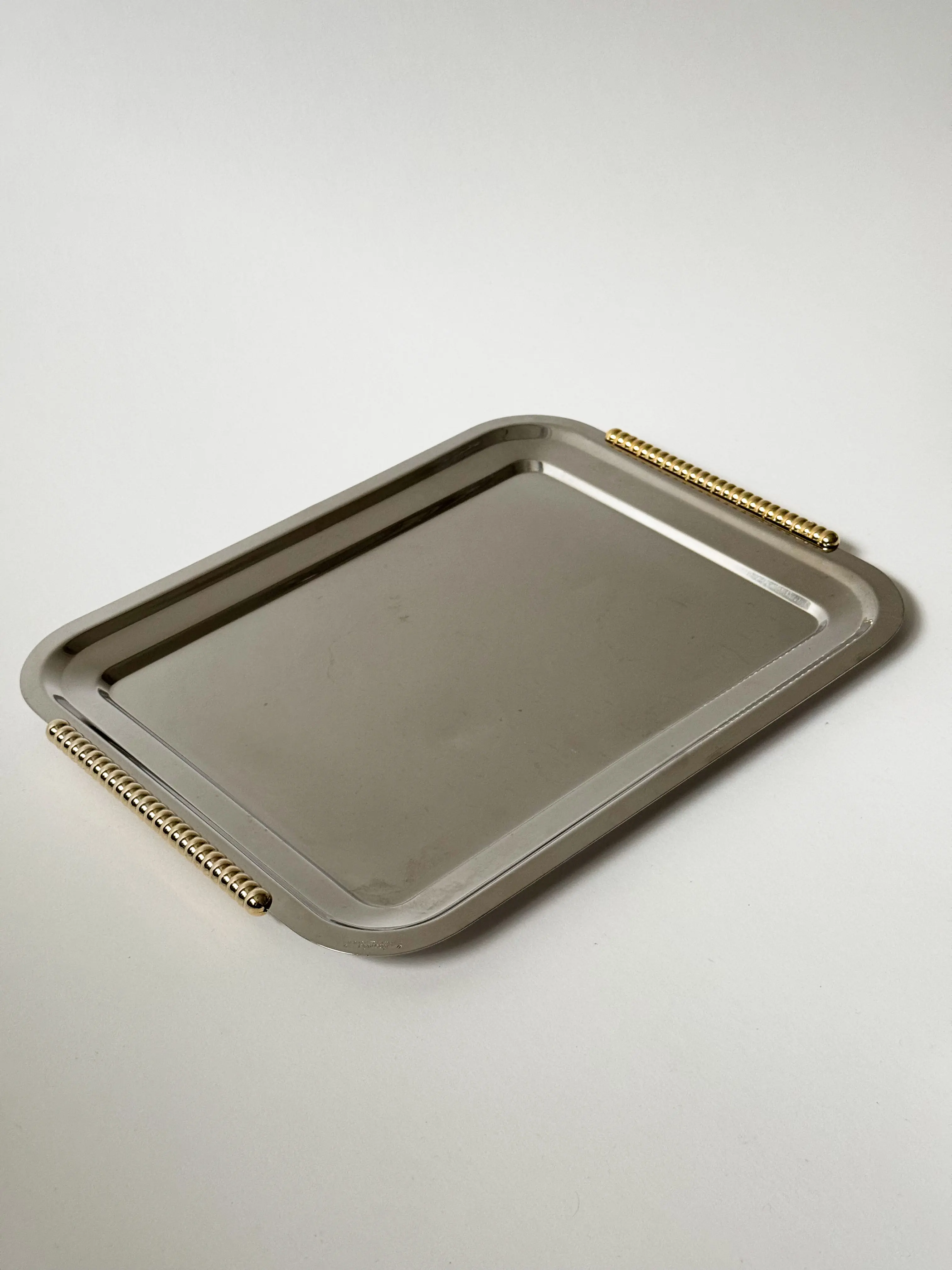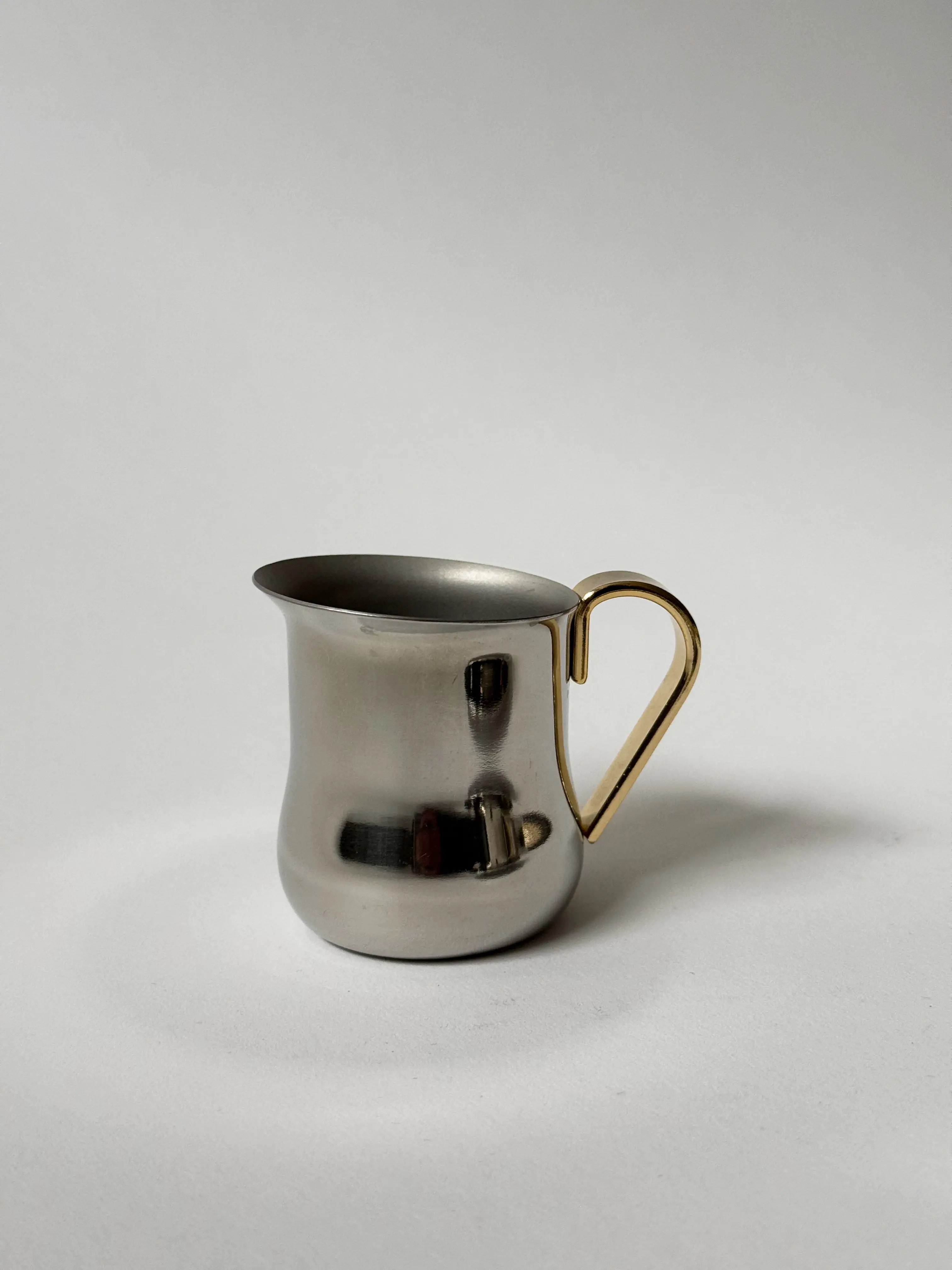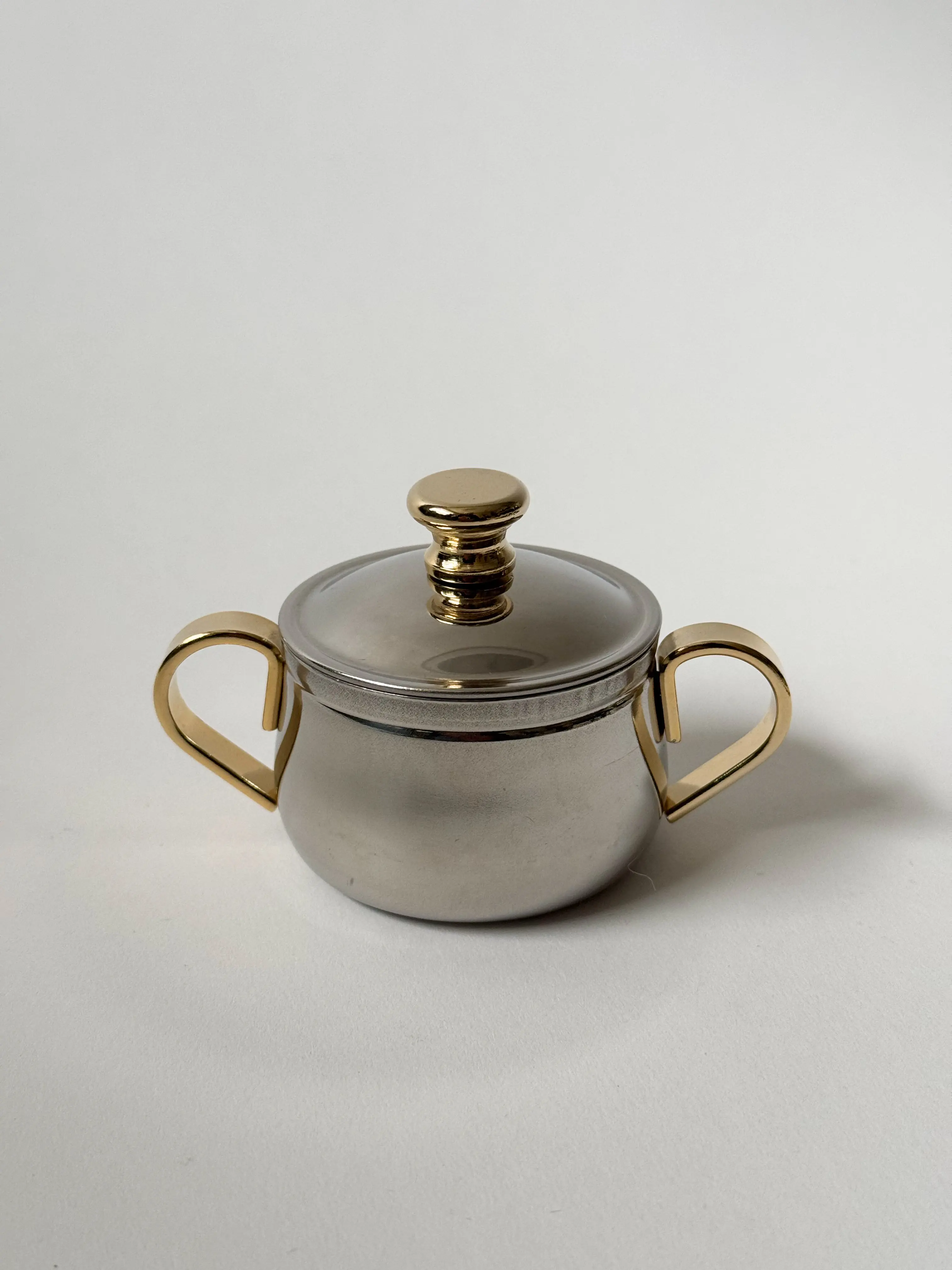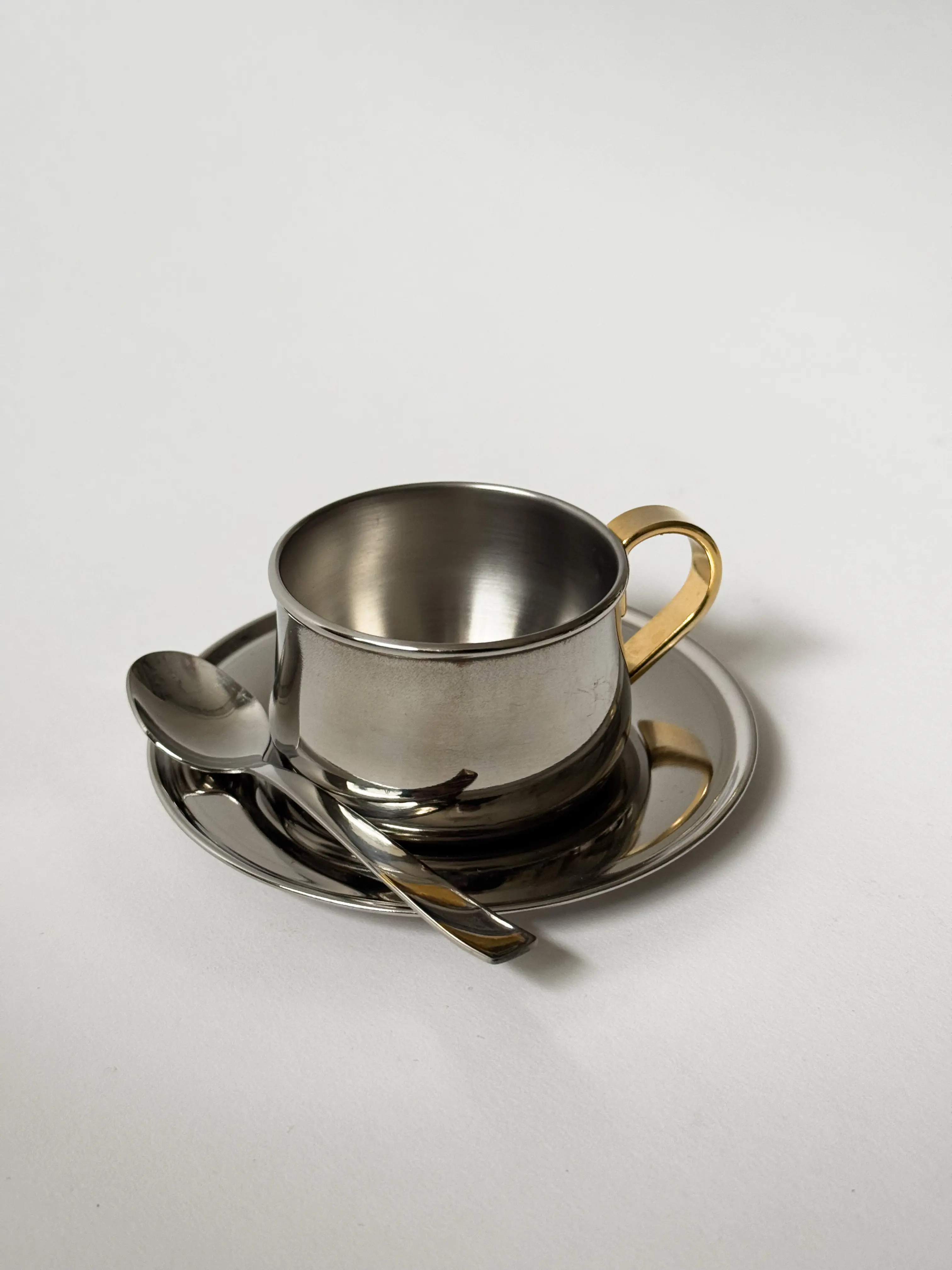 Vintage Italian espresso breakfast set. Stainless steel with golden details. Set contains: 2 x espresso cups with thermal lining, 2 x plate, 1 x sugar jar, 1 x milk jug and 1 x tray. Great vintage condition. Has been cleaned and inspected by Mendera.