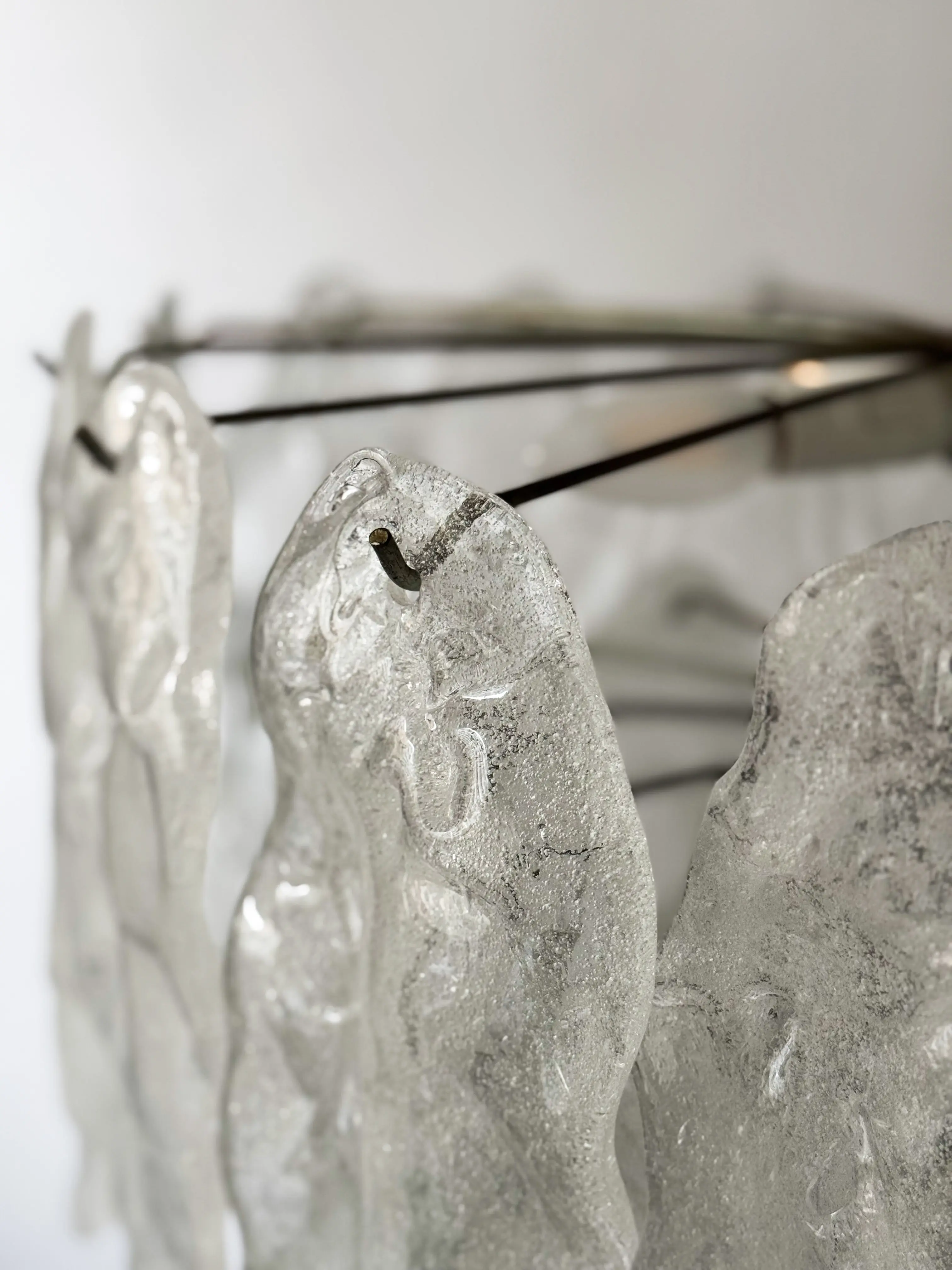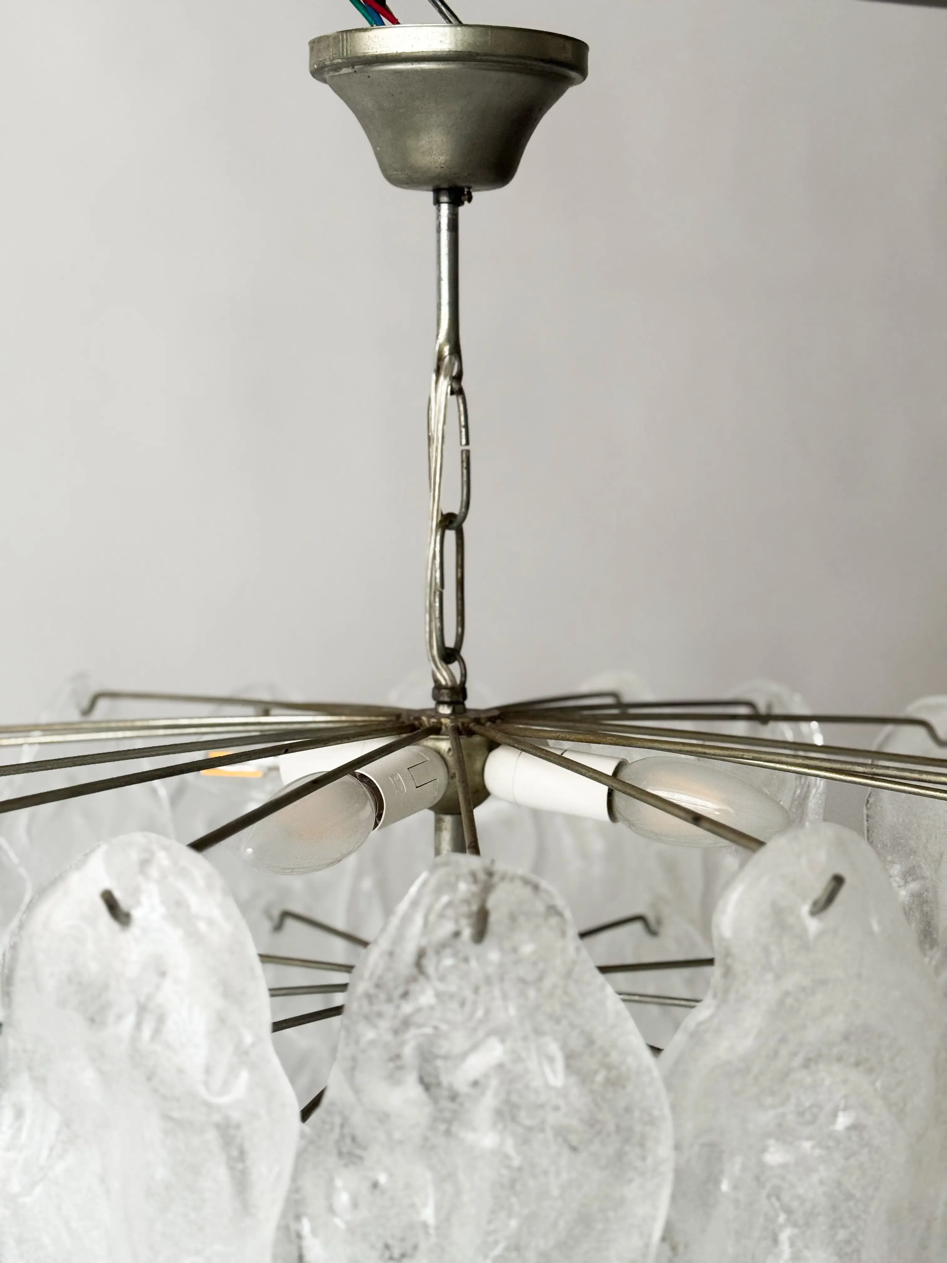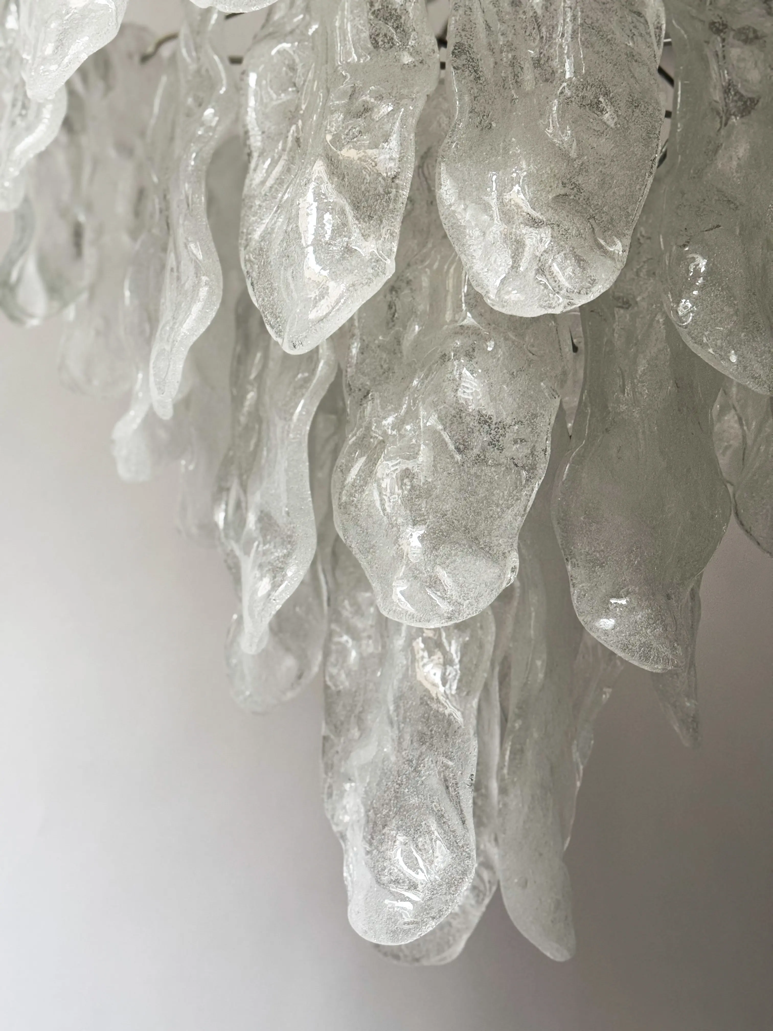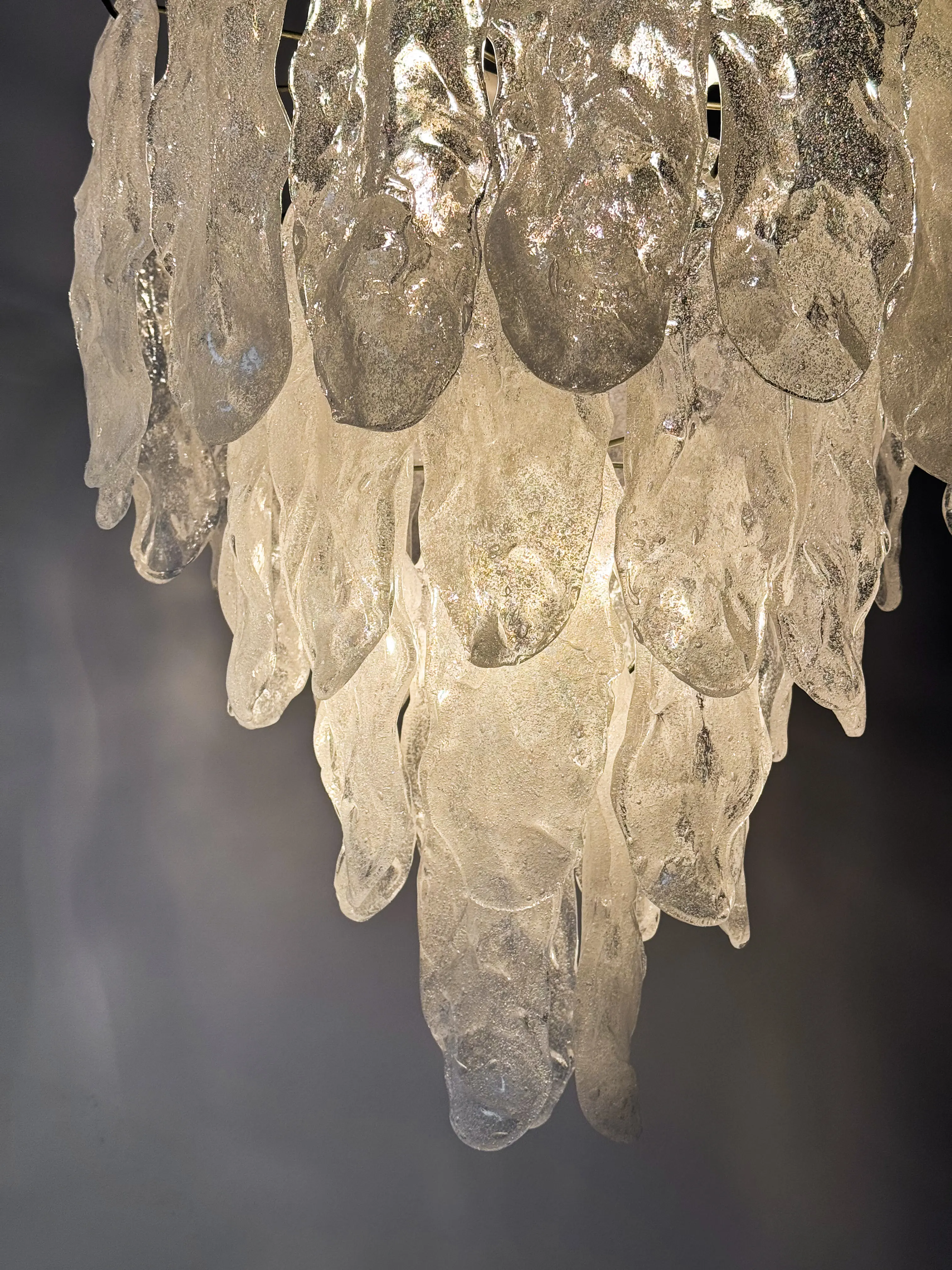 Large and impressive vintage Fiamma chandelier by Mazzega. Handblown Murano glass, made in Italy. 4 tiers, 37 thick glass pieces. Renewed wiring. Has also been cleaned, tested and inspected by Mendera.