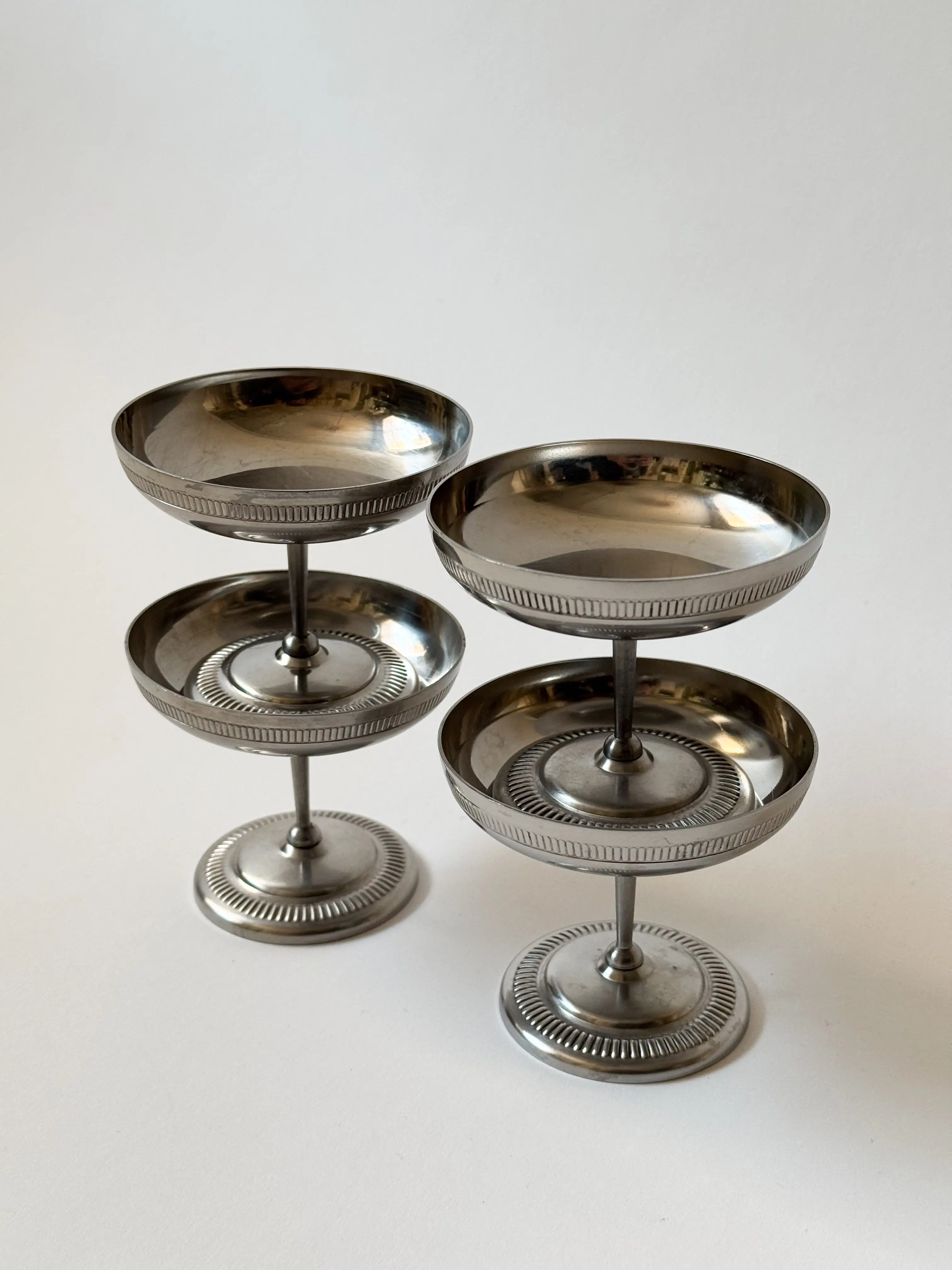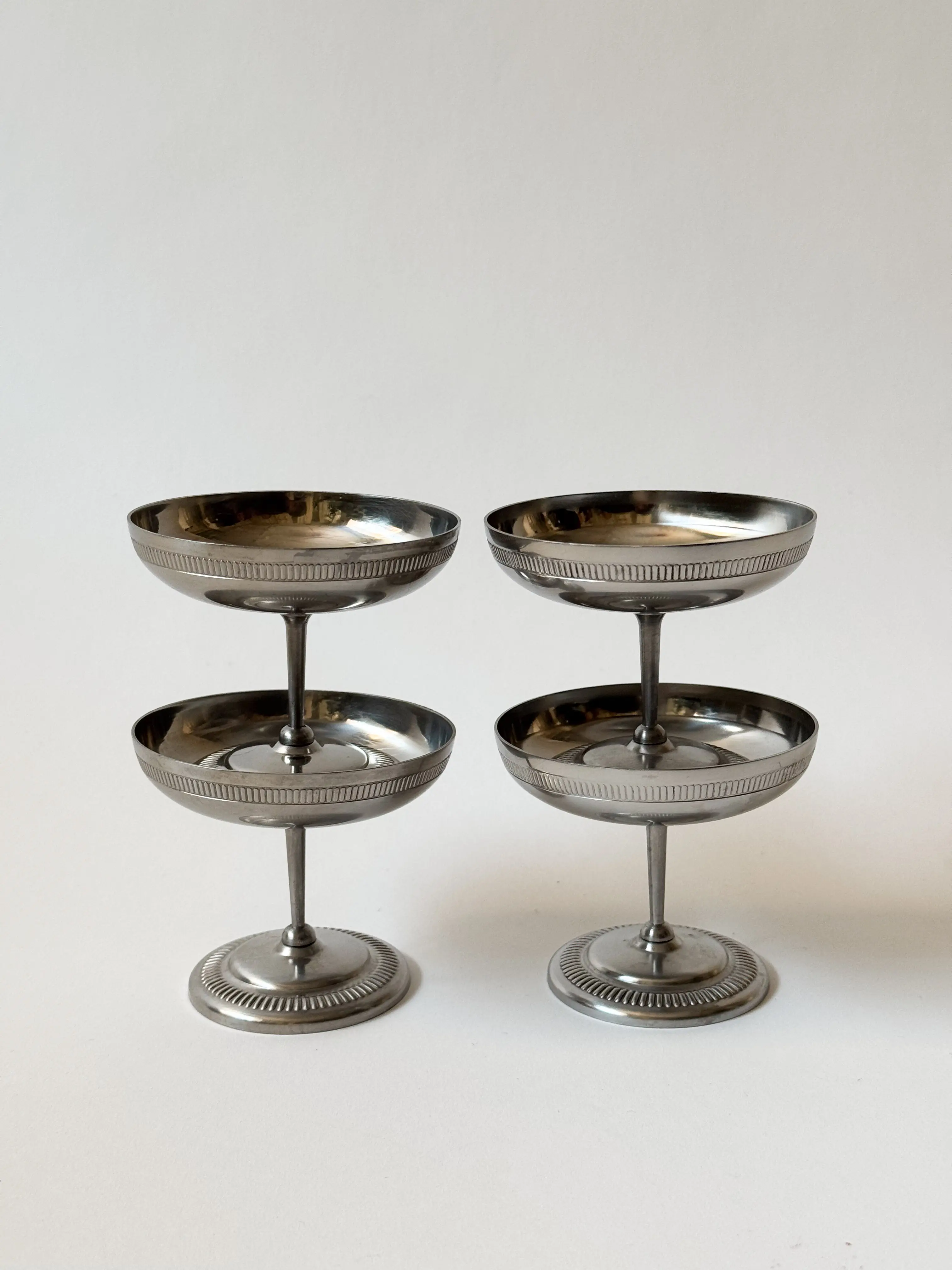 Set of 4 vintage gelato cups in stainless steel. Beautiful decorative pattern on cup and foot. In great vintage condition with faint signs of age. Has been cleaned and inspected by Mendera. Sold as a set of 4.