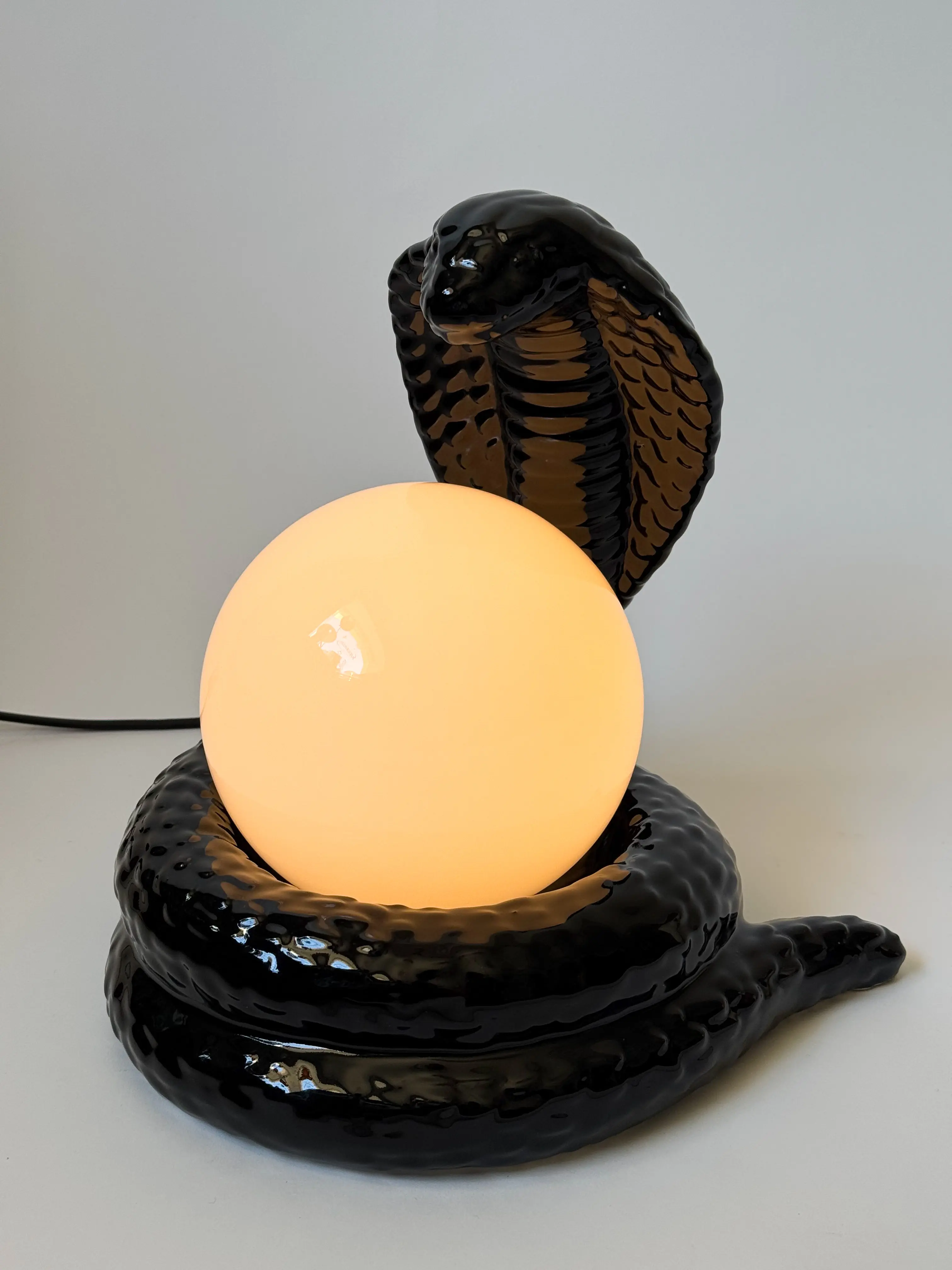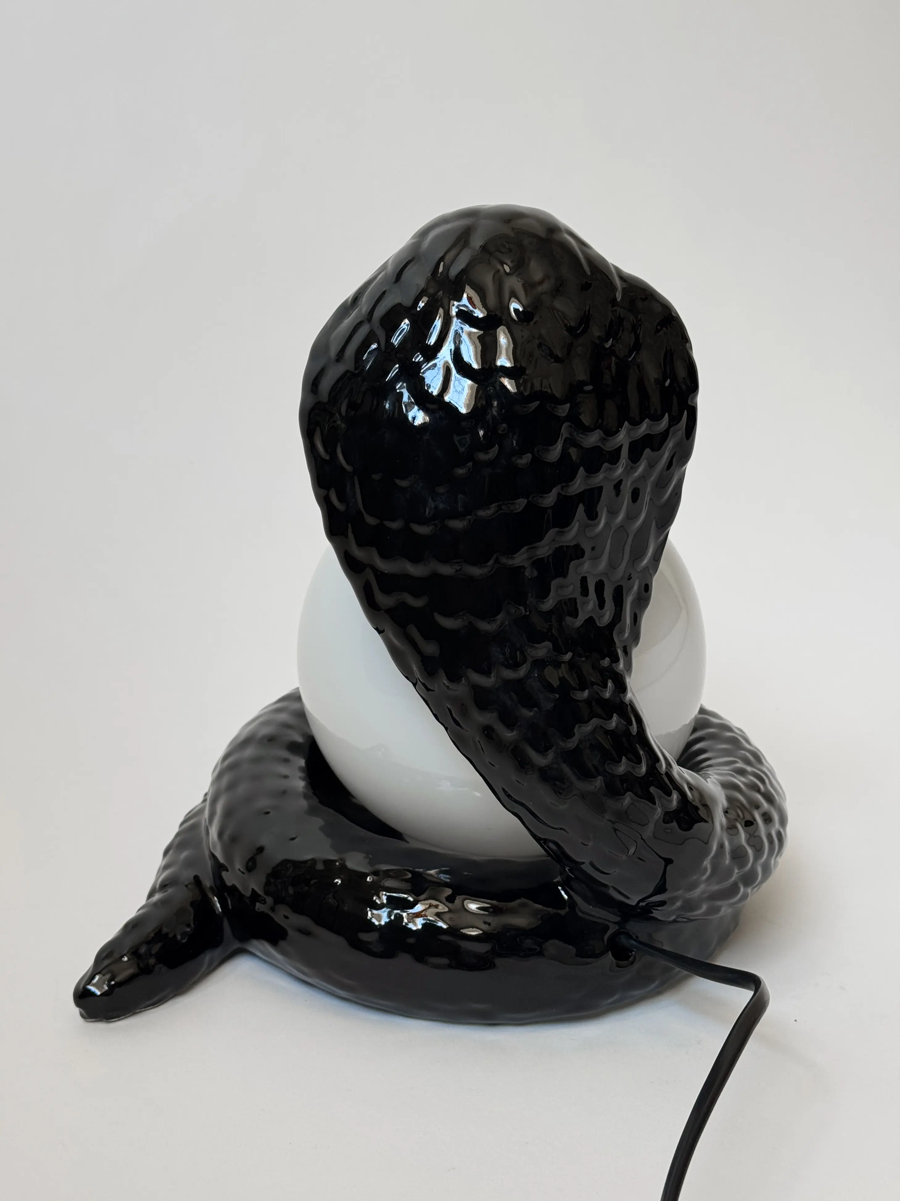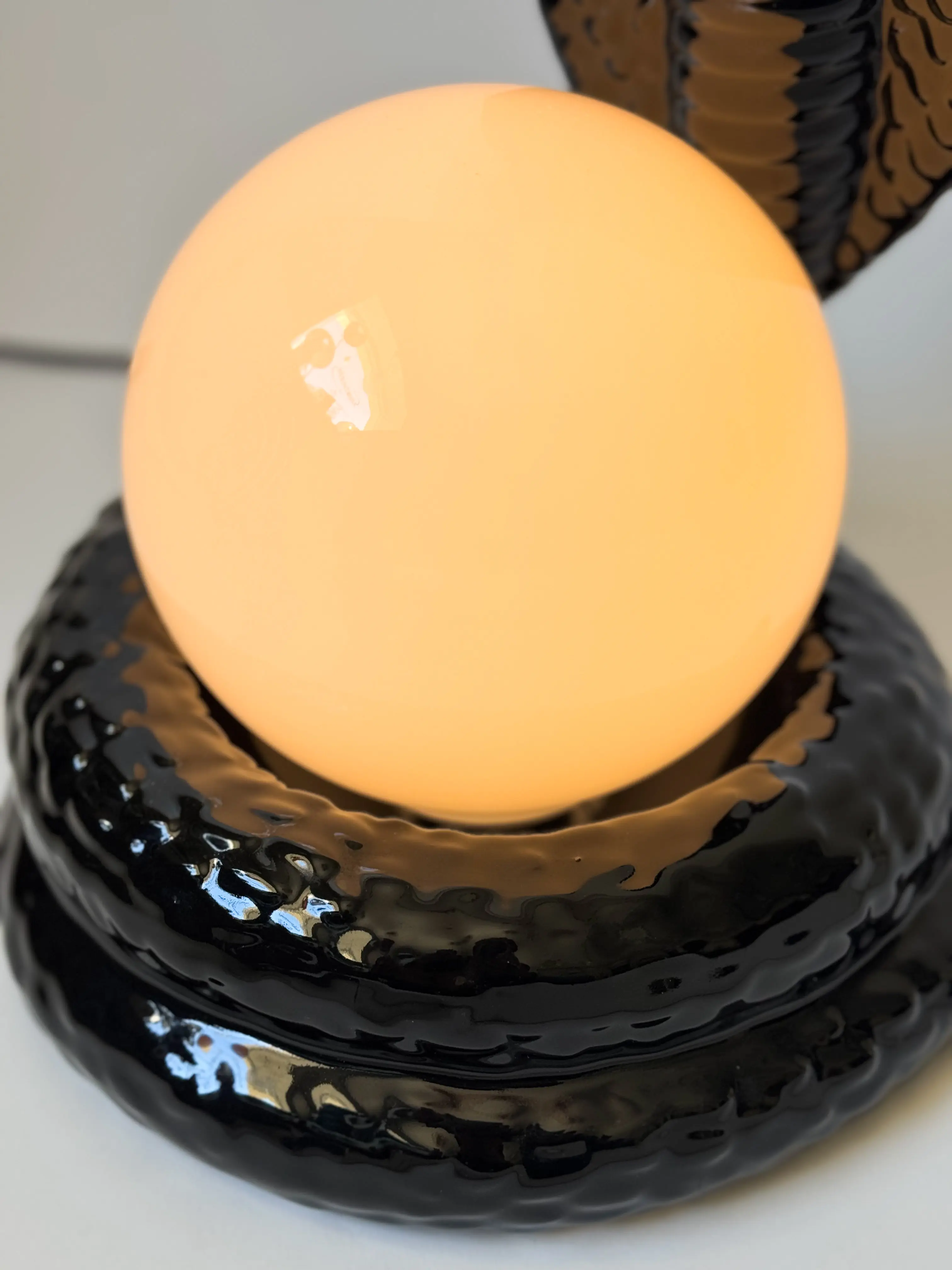 Large vintage cobra table lamp from the 1980's. Black glazed ceramic and glass sphere. In great vintage condition. Has been cleaned, tested and inspected by Mendera. Takes 1 x E14 lightbulb.