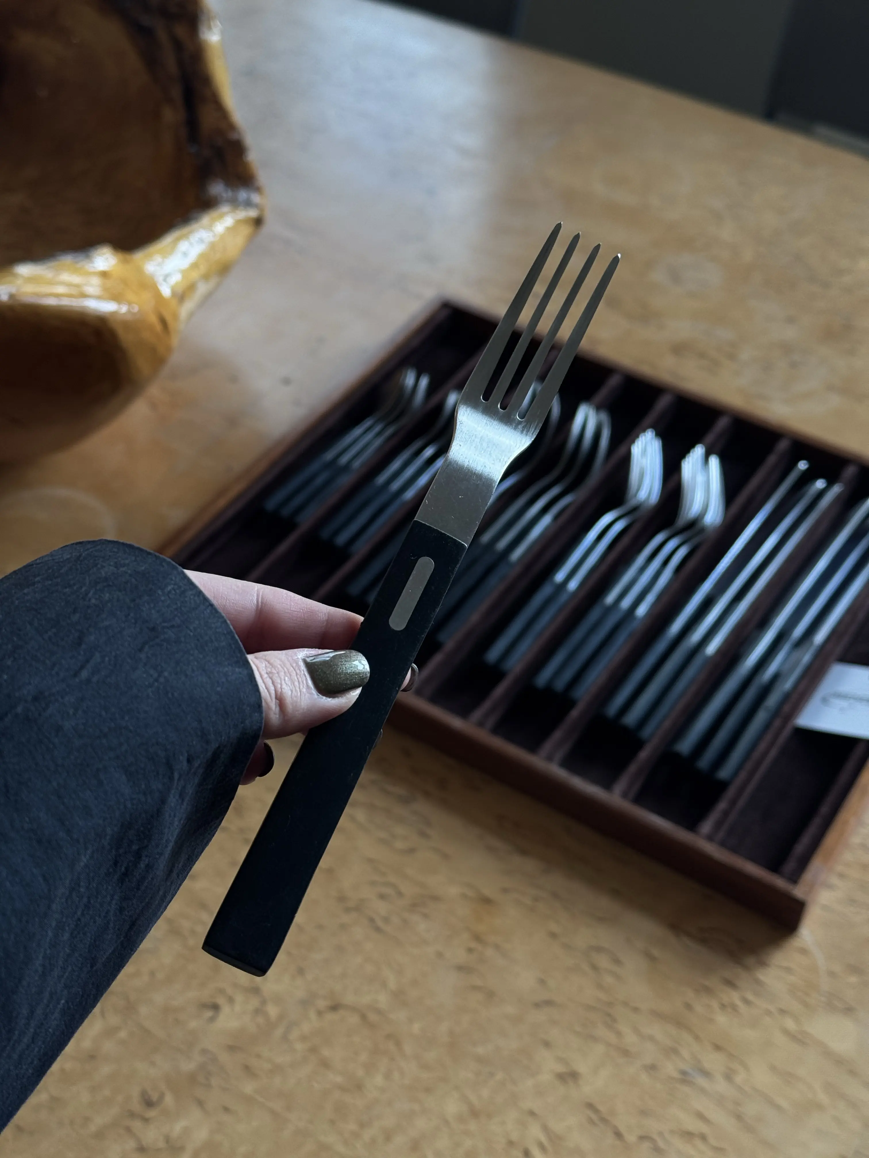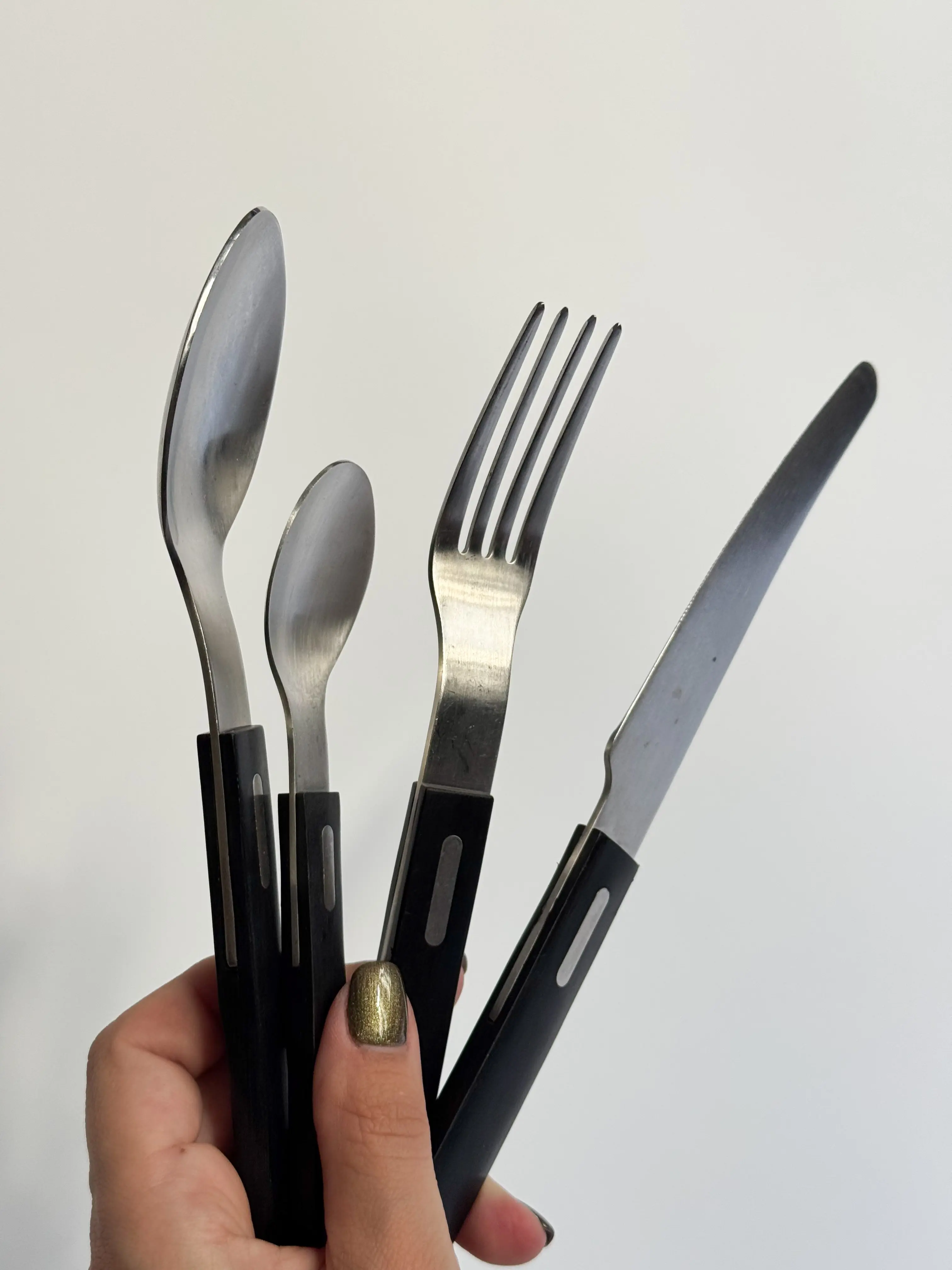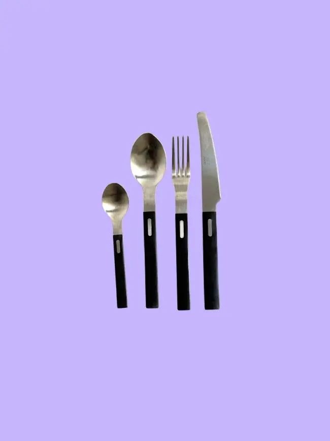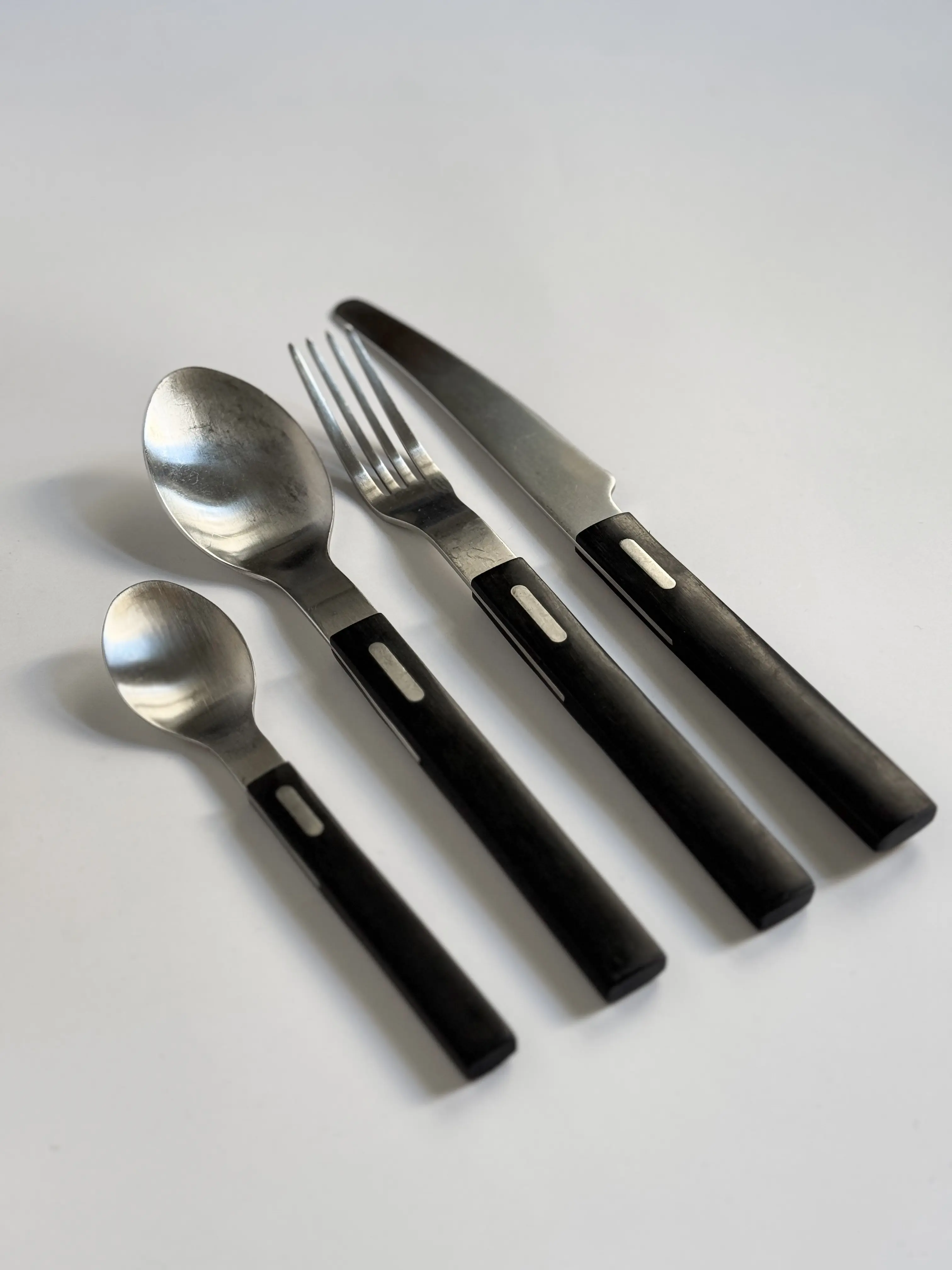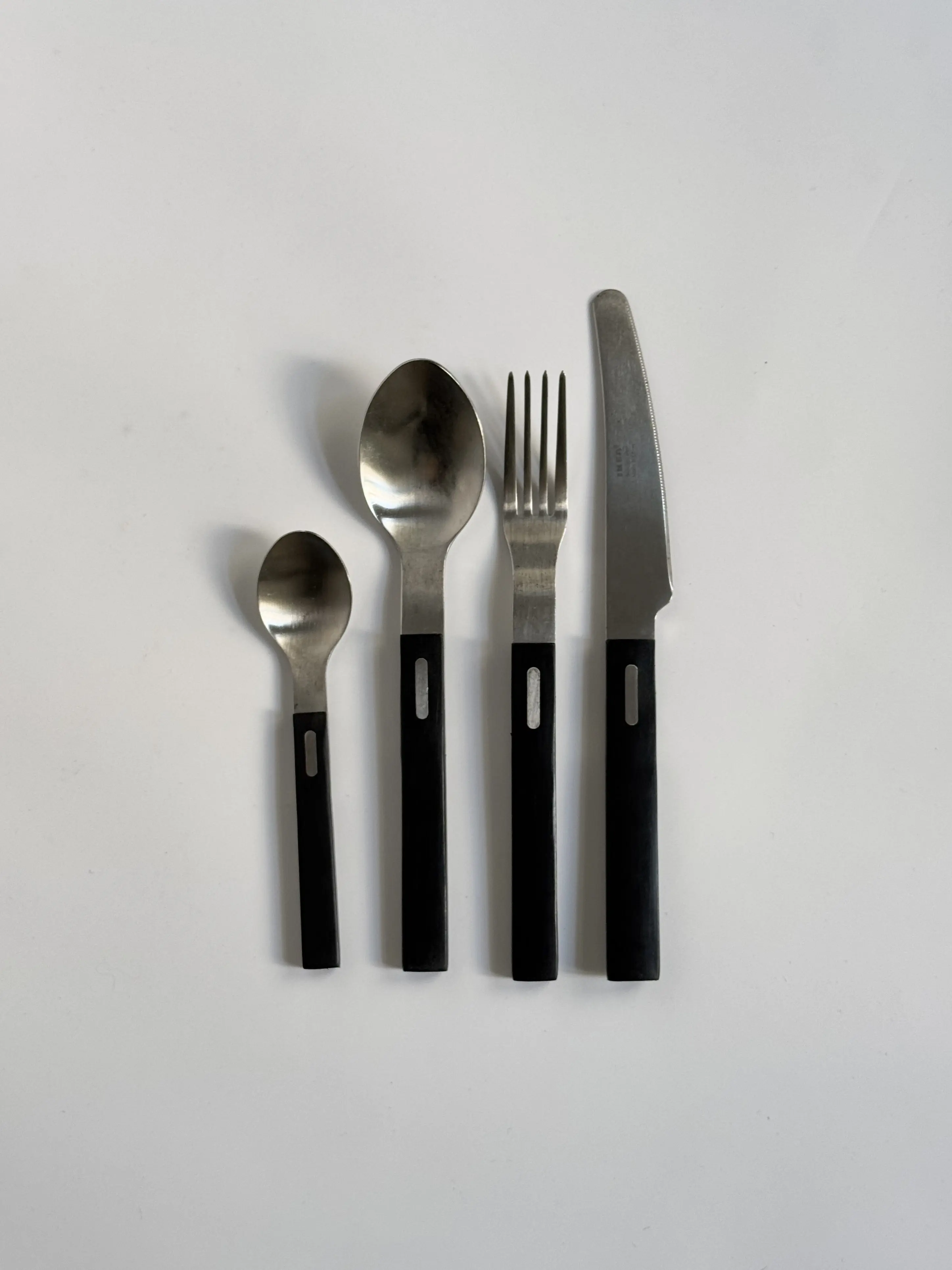 Vintage Sigil cutlery set by Olle Gylland for Ikea. Complete set of 6 forks, 6 knives, 6 spoons and 6 tea spoons, 24 pieces in total. Stainless steel and plastic. In good overall vintage condition with some signs of wear. Have been cleaned and inspected by Mendera.
