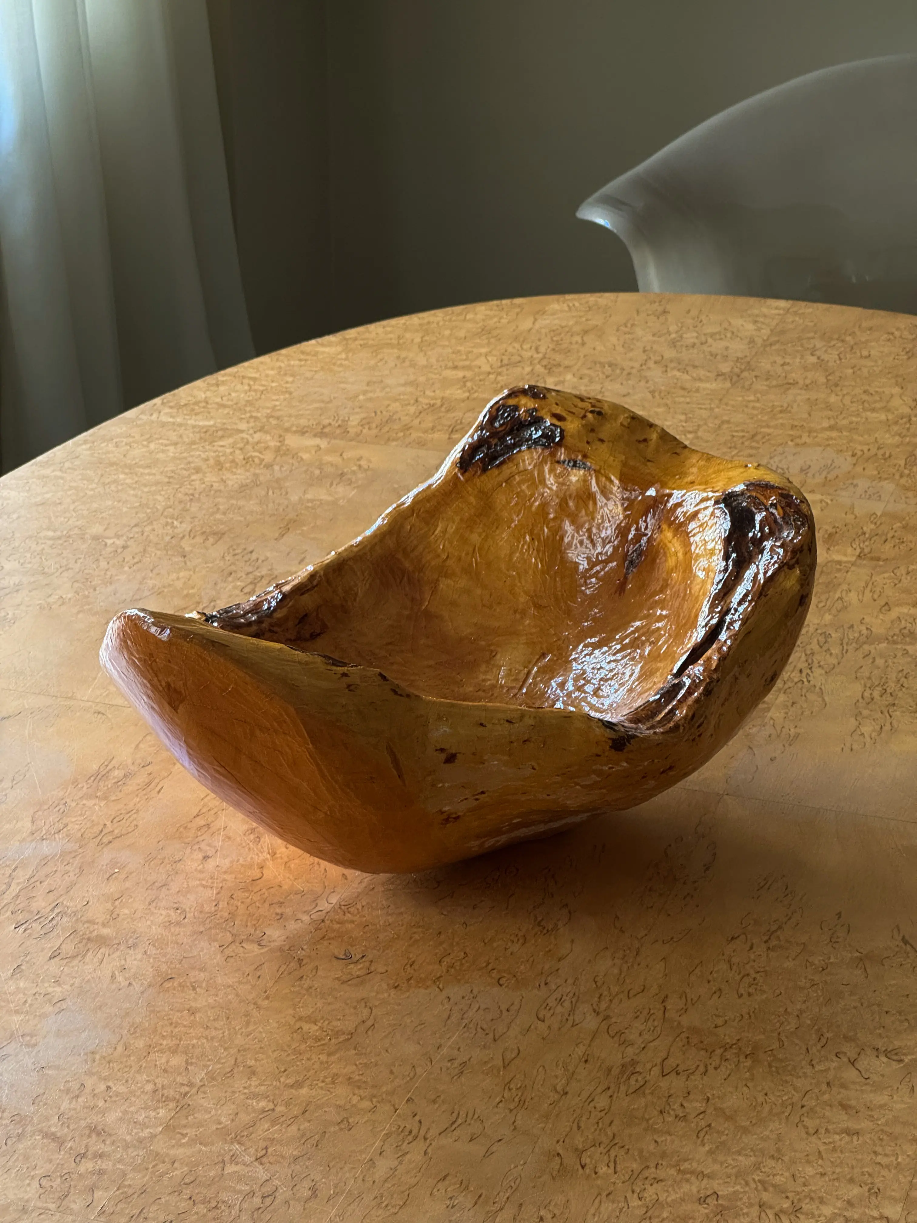 Large handmade sculptural burl wood bowl. Solid wood in high gloss lacquer finish. Beautiful centrepiece. In good vintage condition. Has been cleaned and inspected by Mendera.