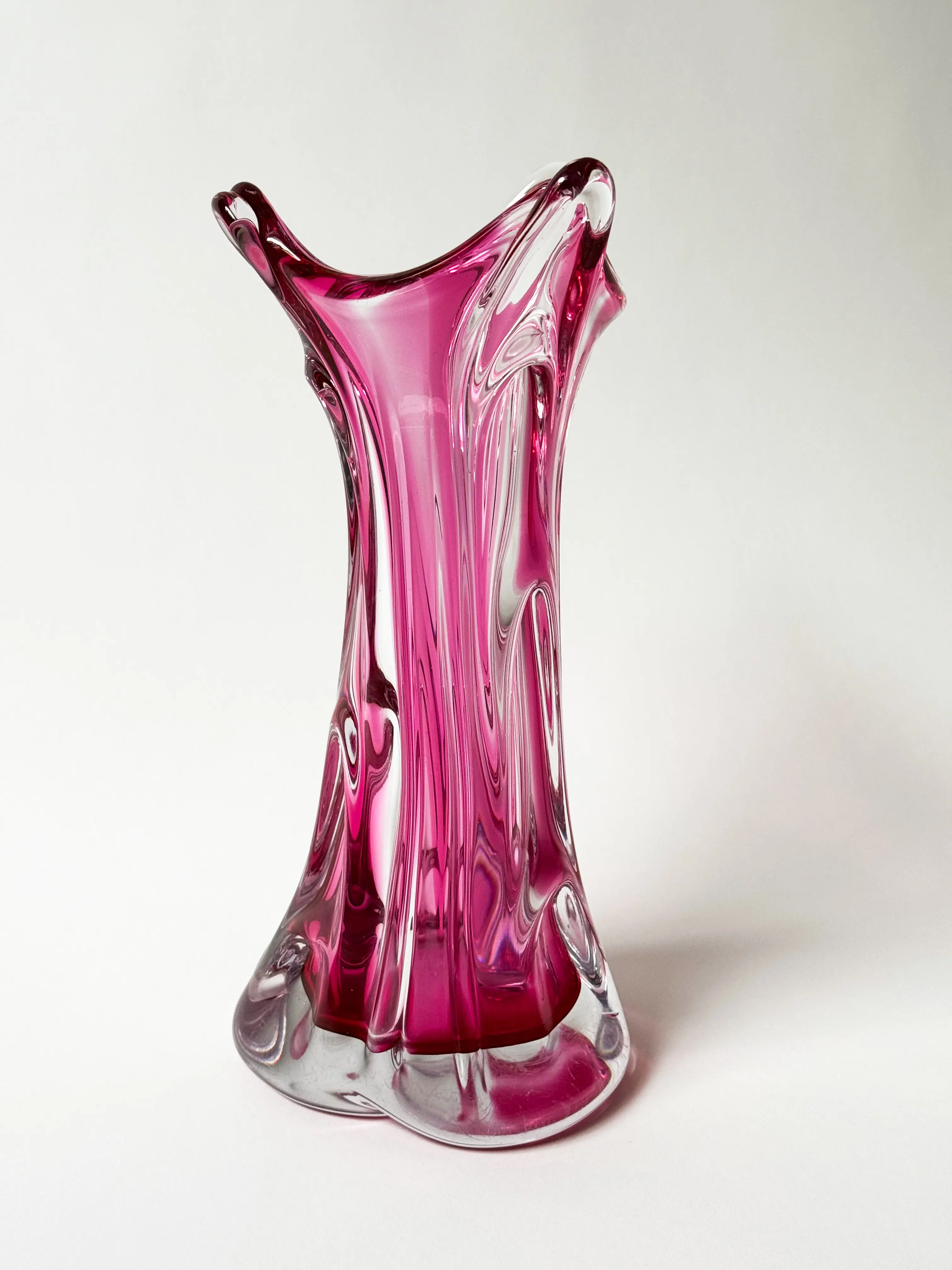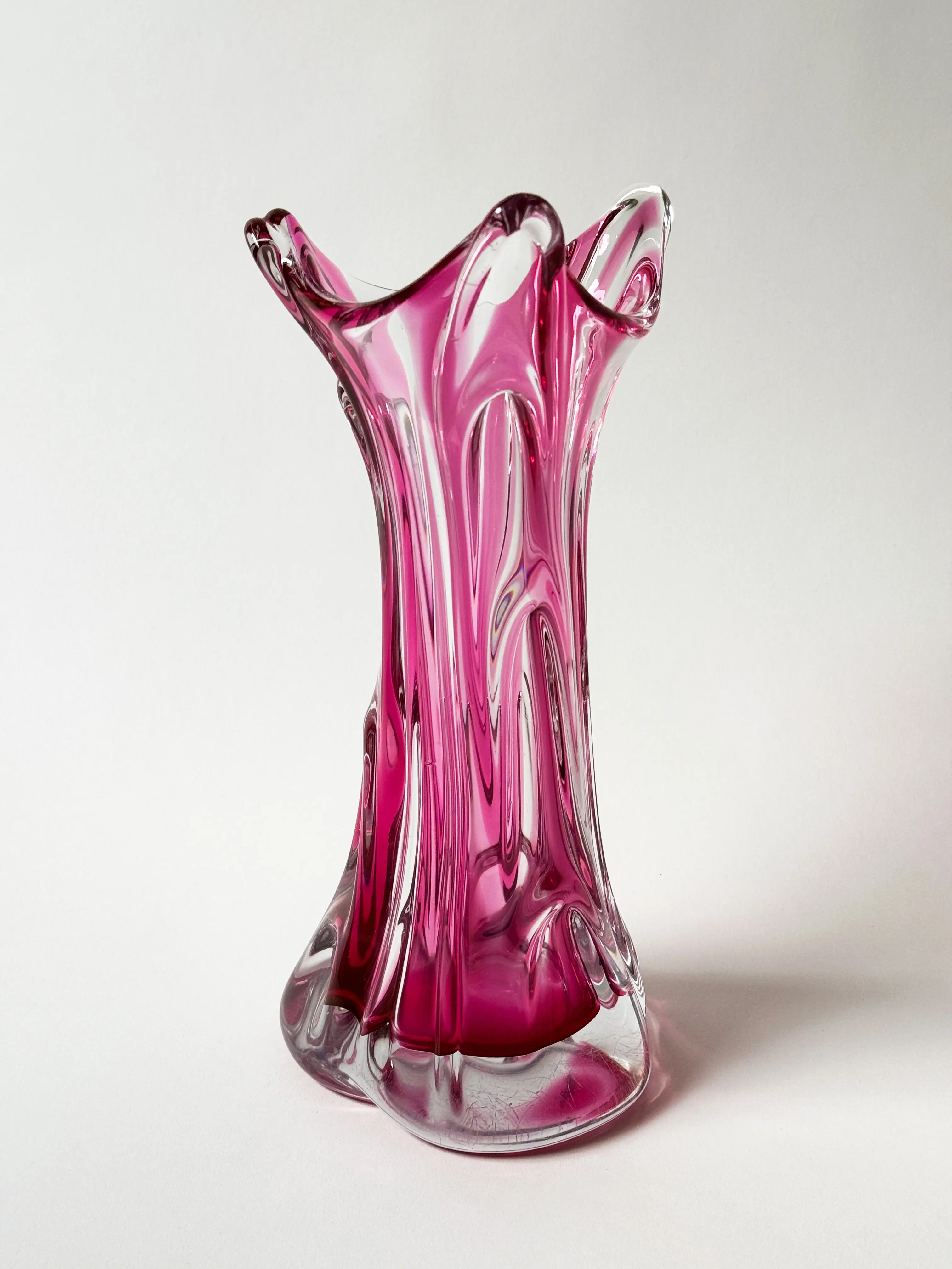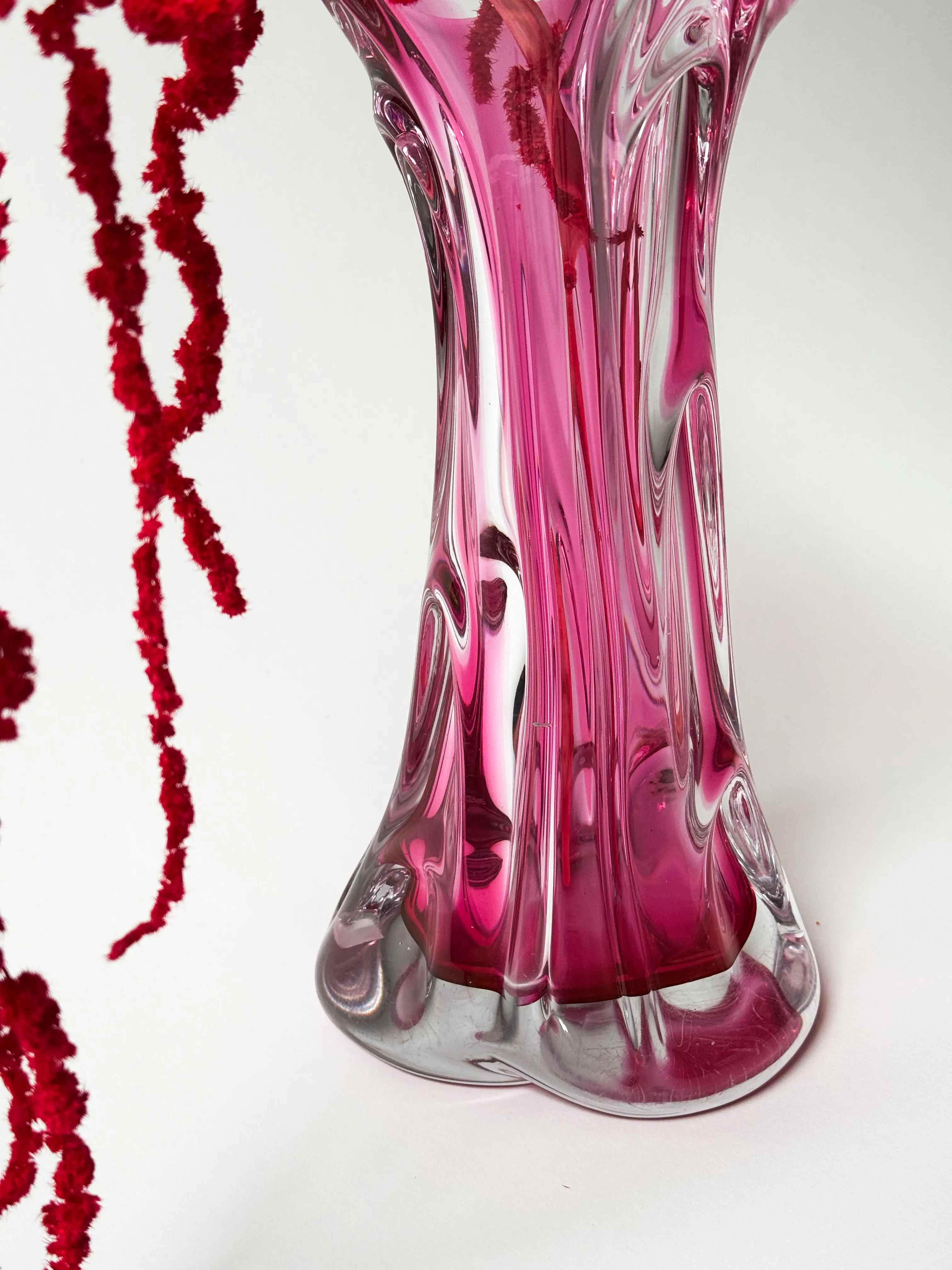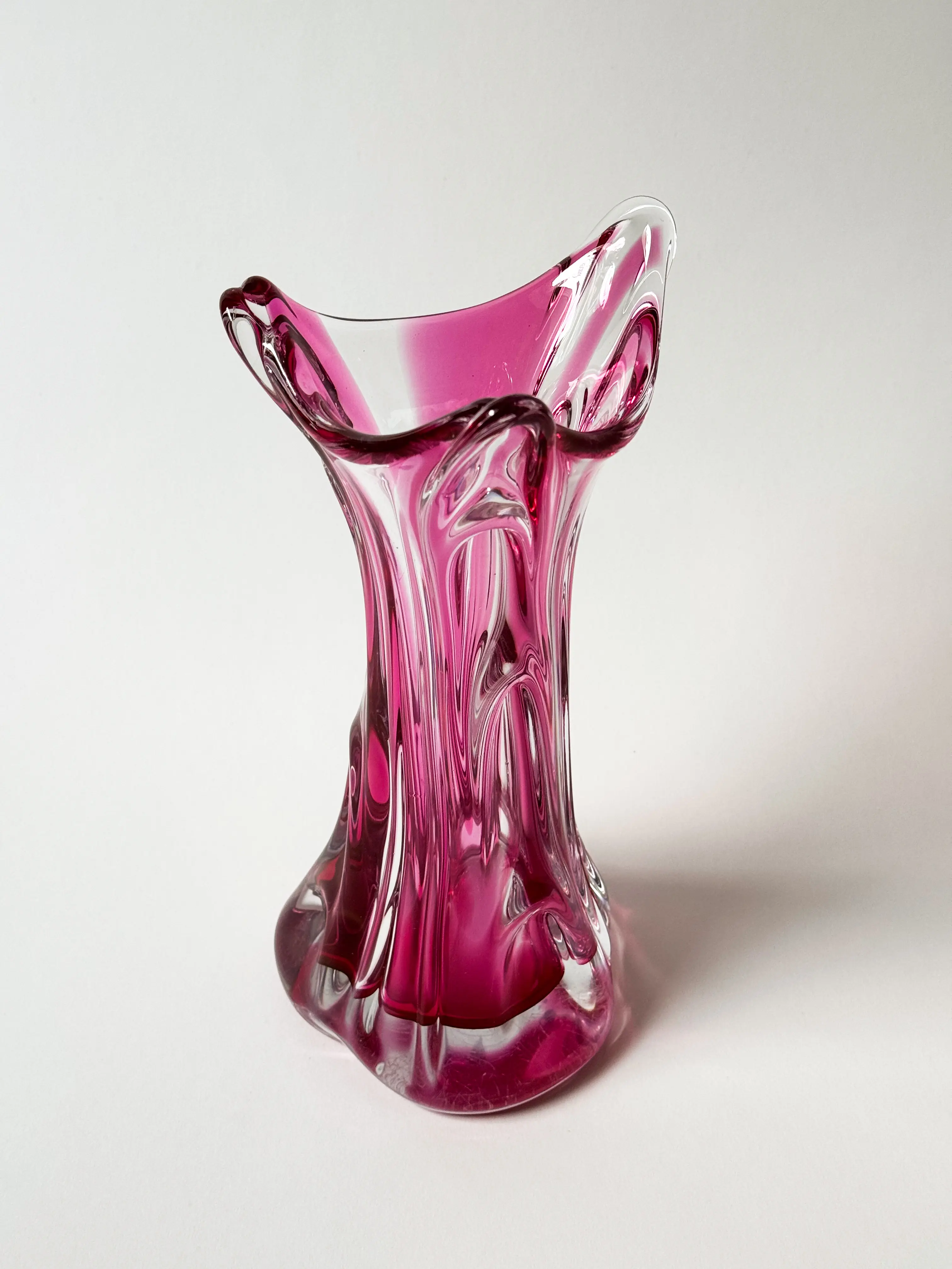 Stunning handblown vintage vase in thick pick and clear glass. Beautiful irregular shape, like liquid. Has been cleaned and inspected by Mendera. Has surface scratches at the bottom, otherwise in great vintage condition.