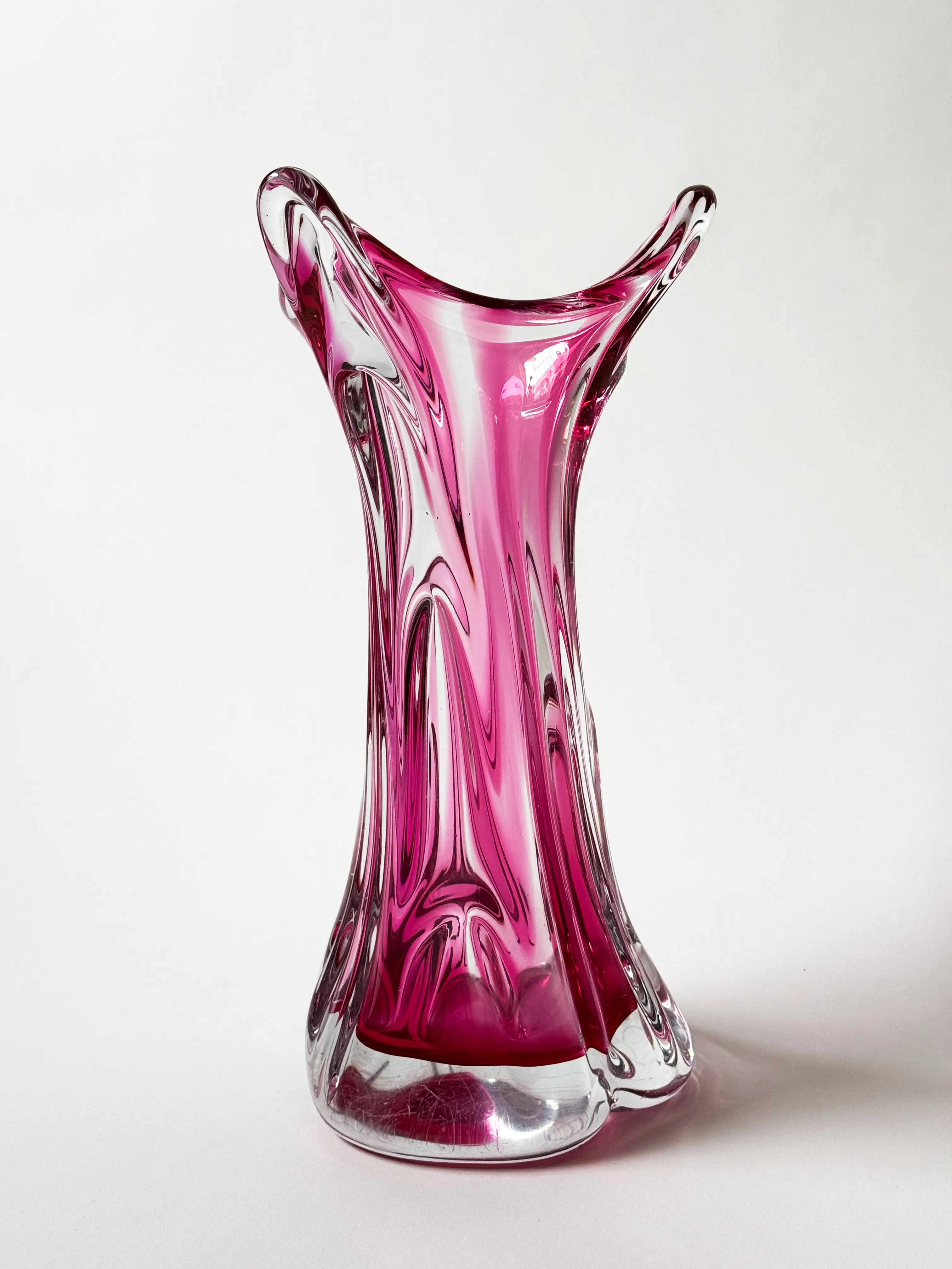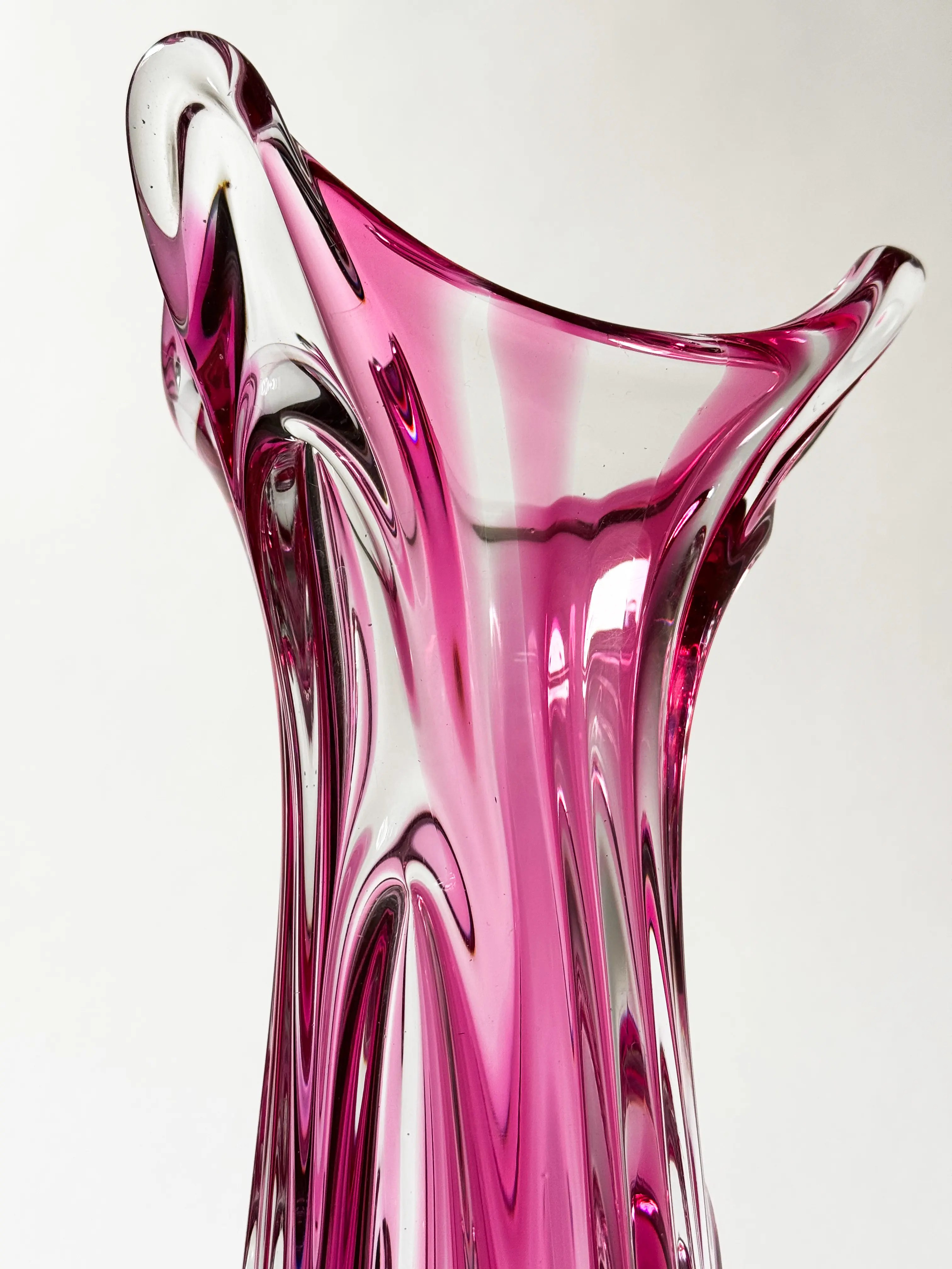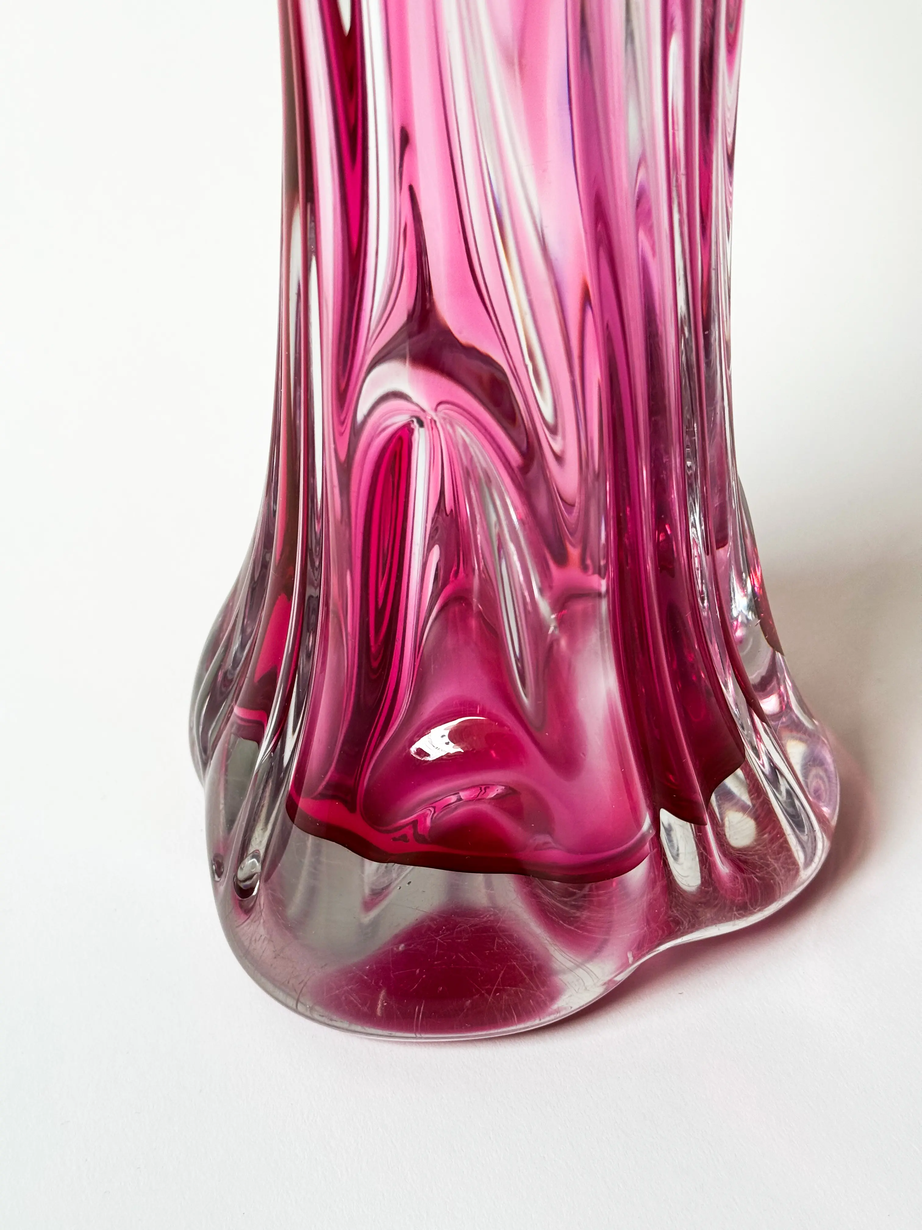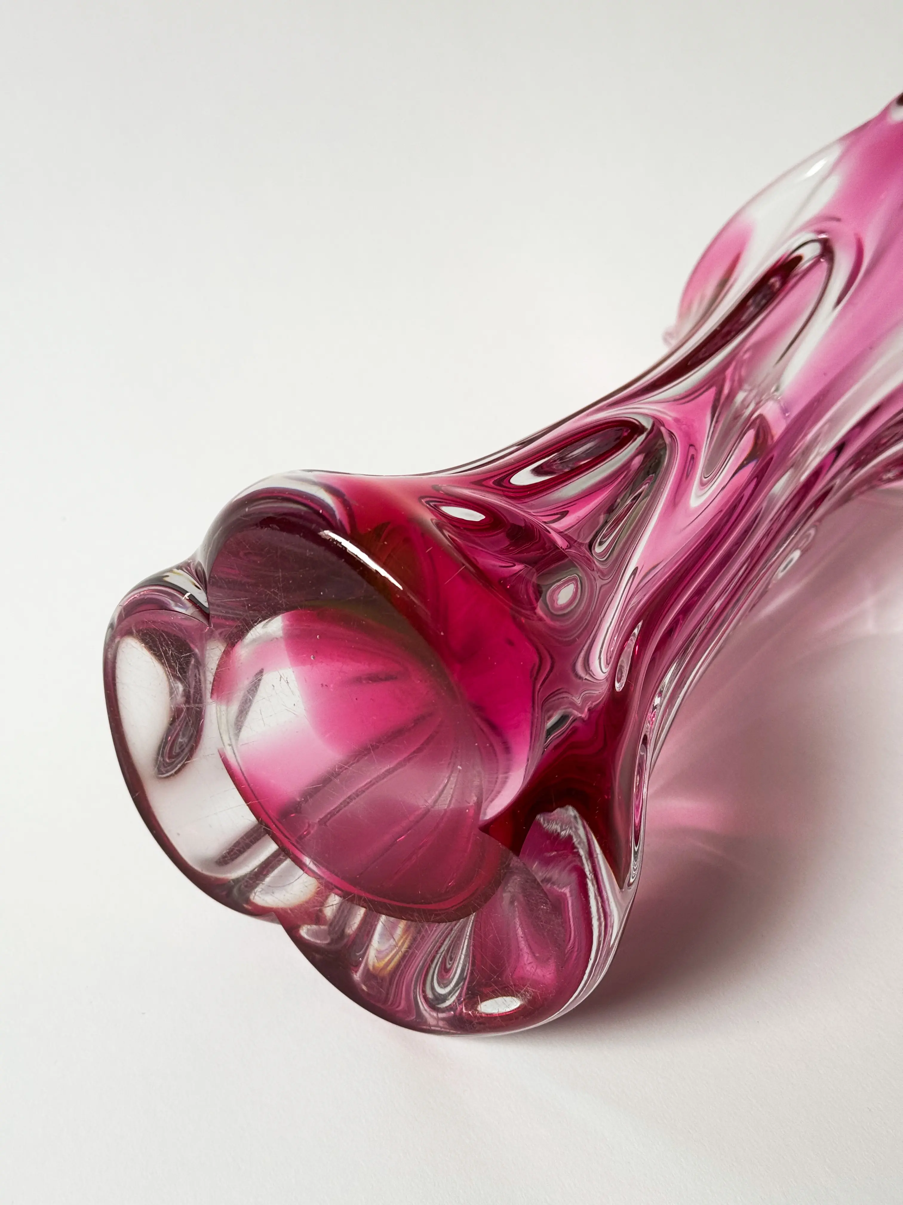 Stunning handblown vintage vase in thick pick and clear glass. Beautiful irregular shape, like liquid. Has been cleaned and inspected by Mendera. Has surface scratches at the bottom, otherwise in great vintage condition.