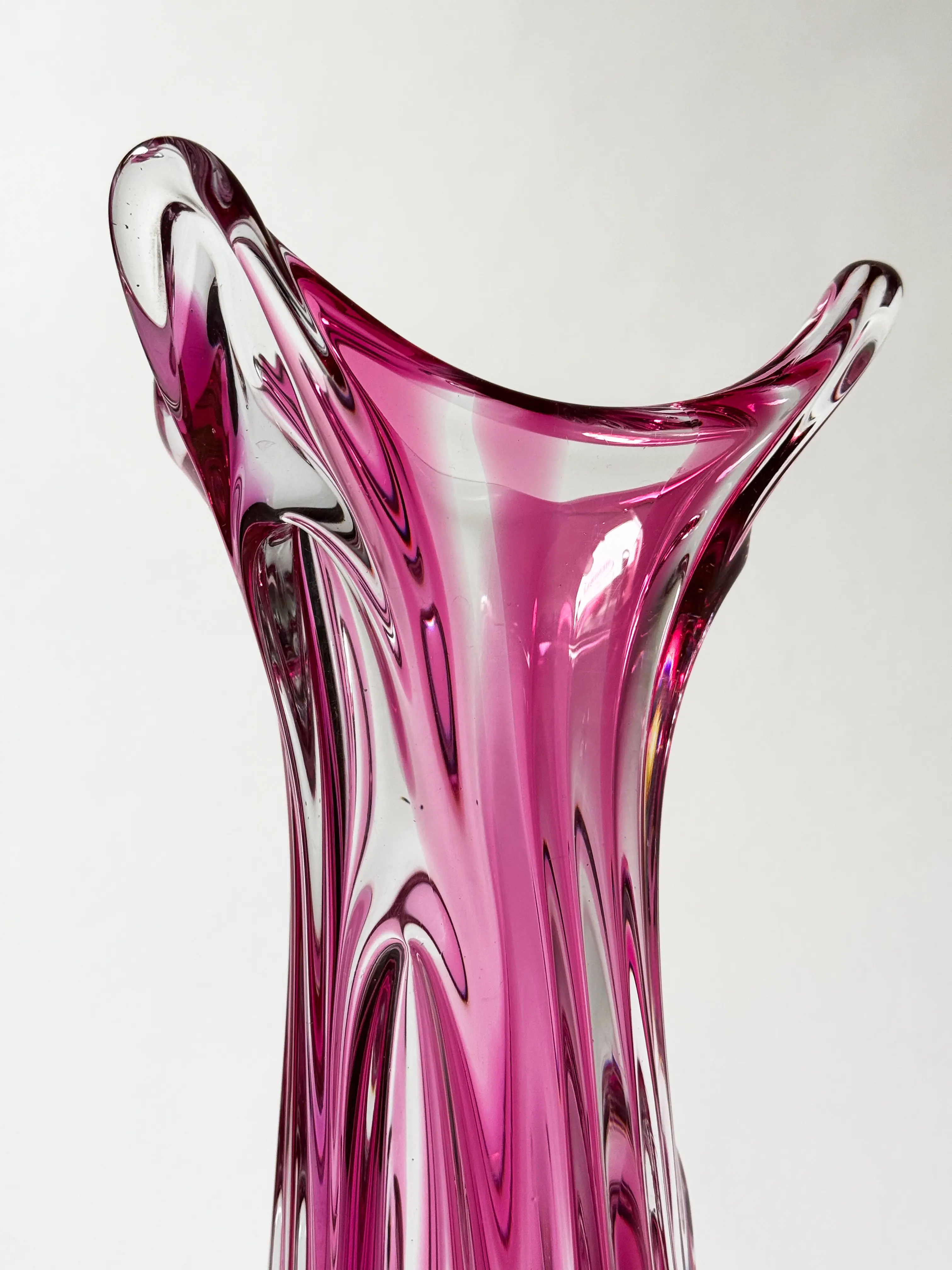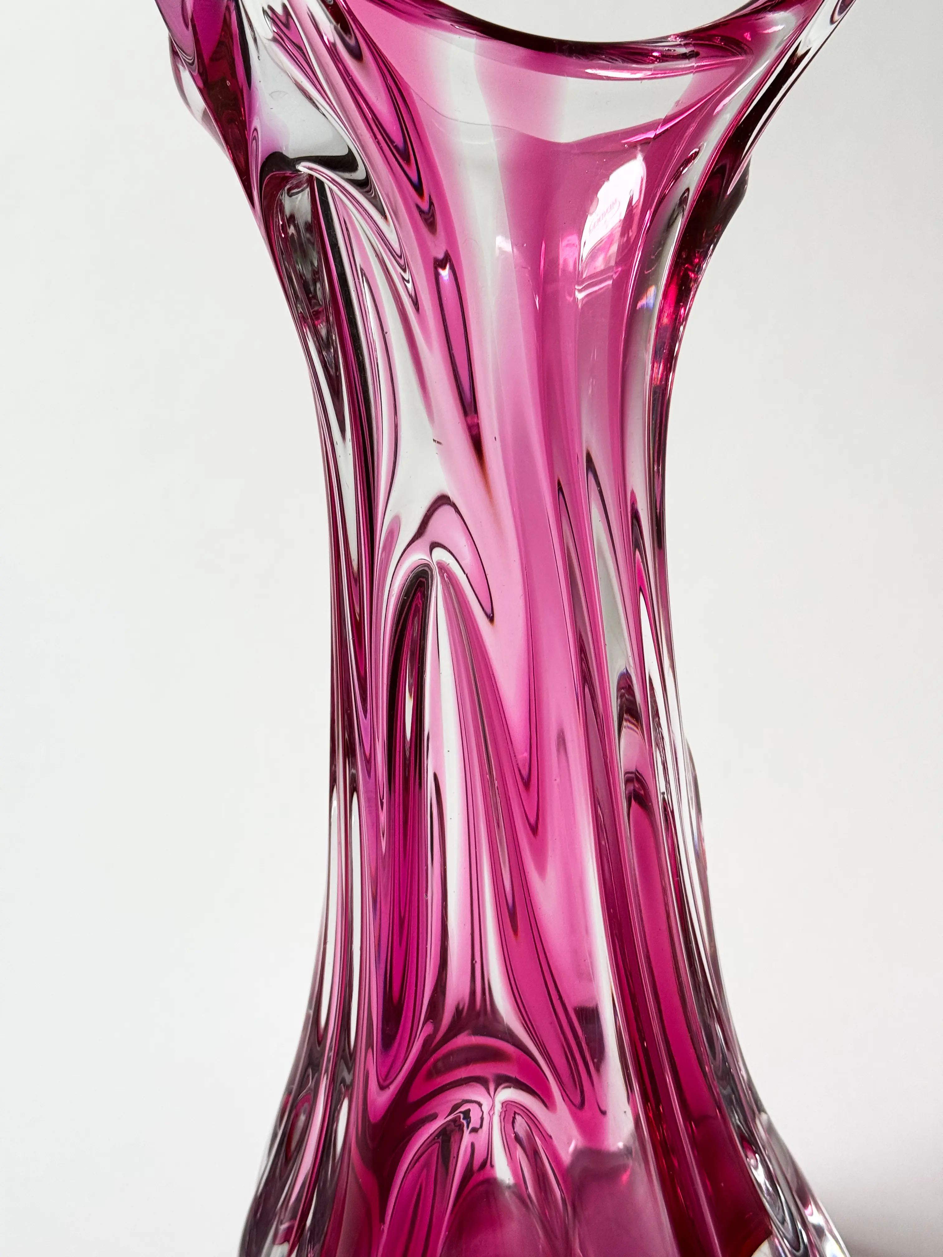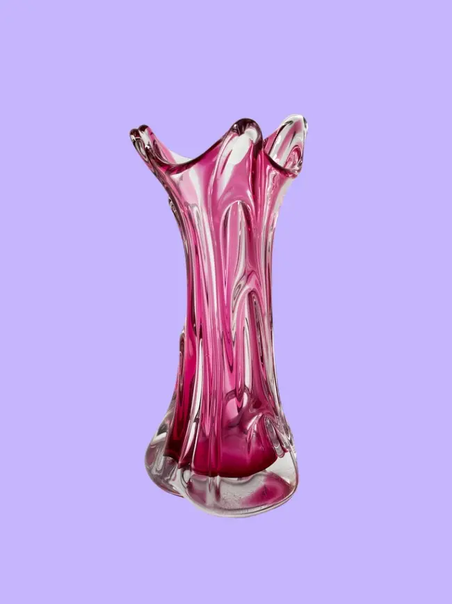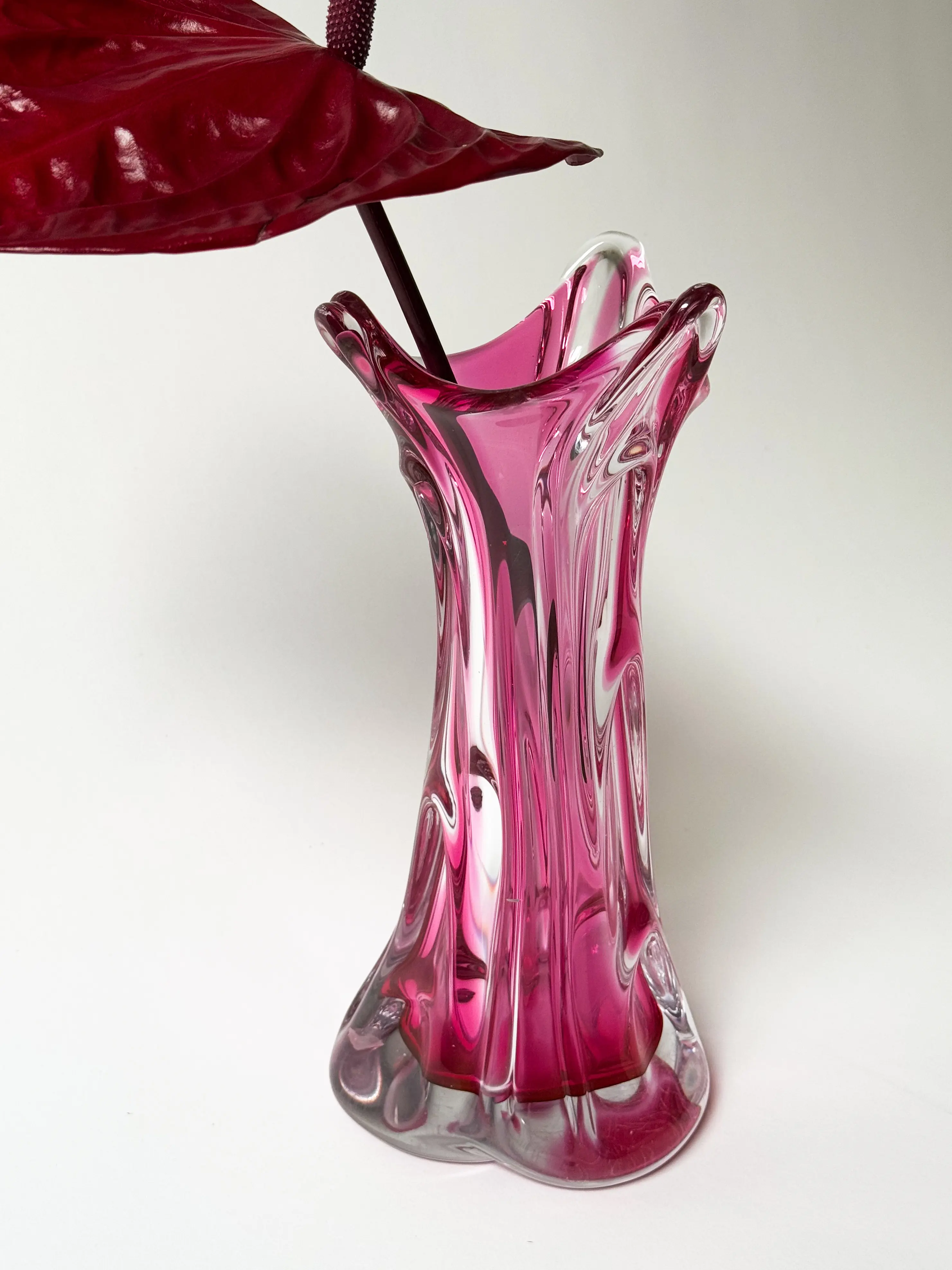 Stunning handblown vintage vase in thick pick and clear glass. Beautiful irregular shape, like liquid. Has been cleaned and inspected by Mendera. Has surface scratches at the bottom, otherwise in great vintage condition.