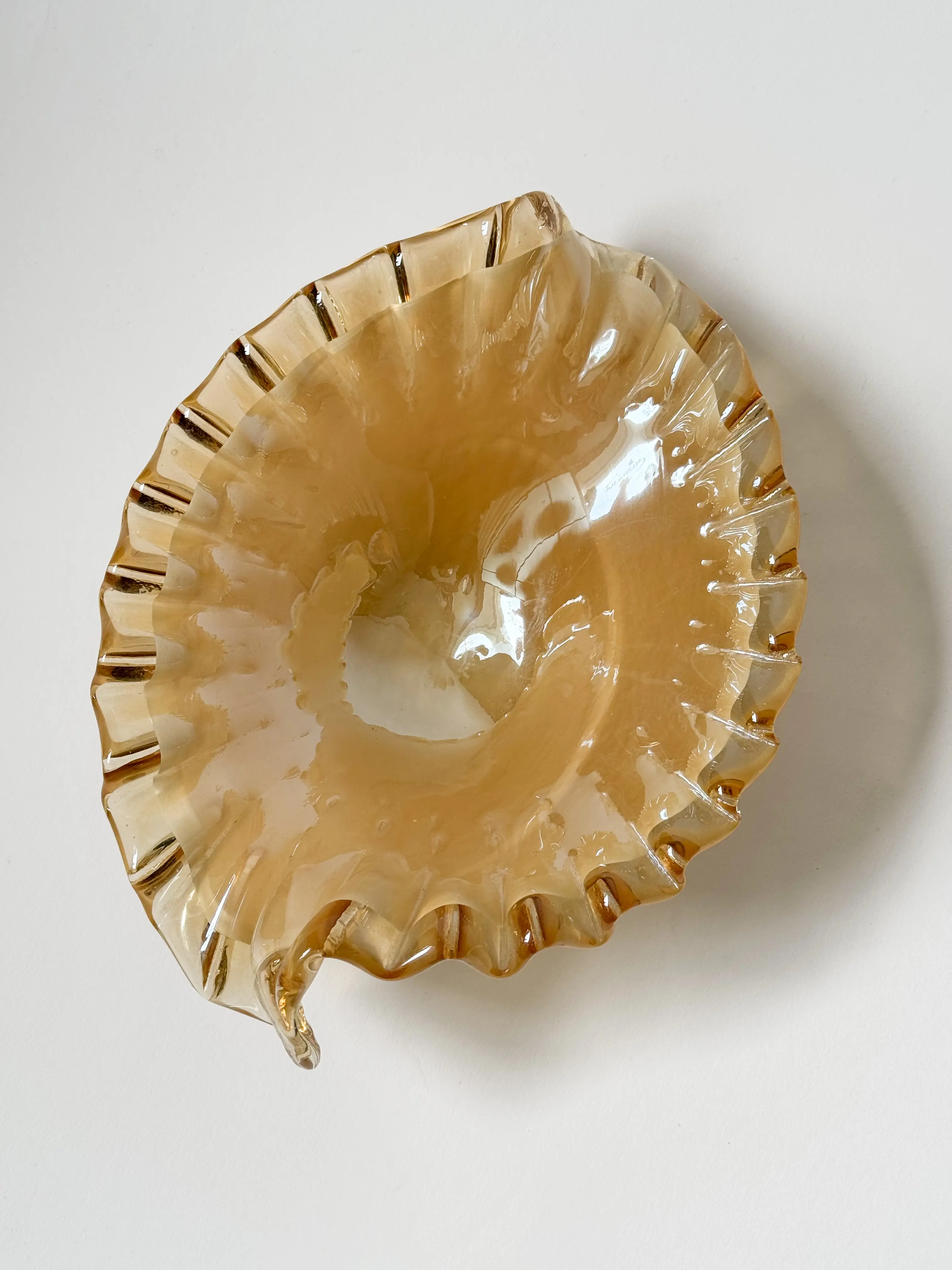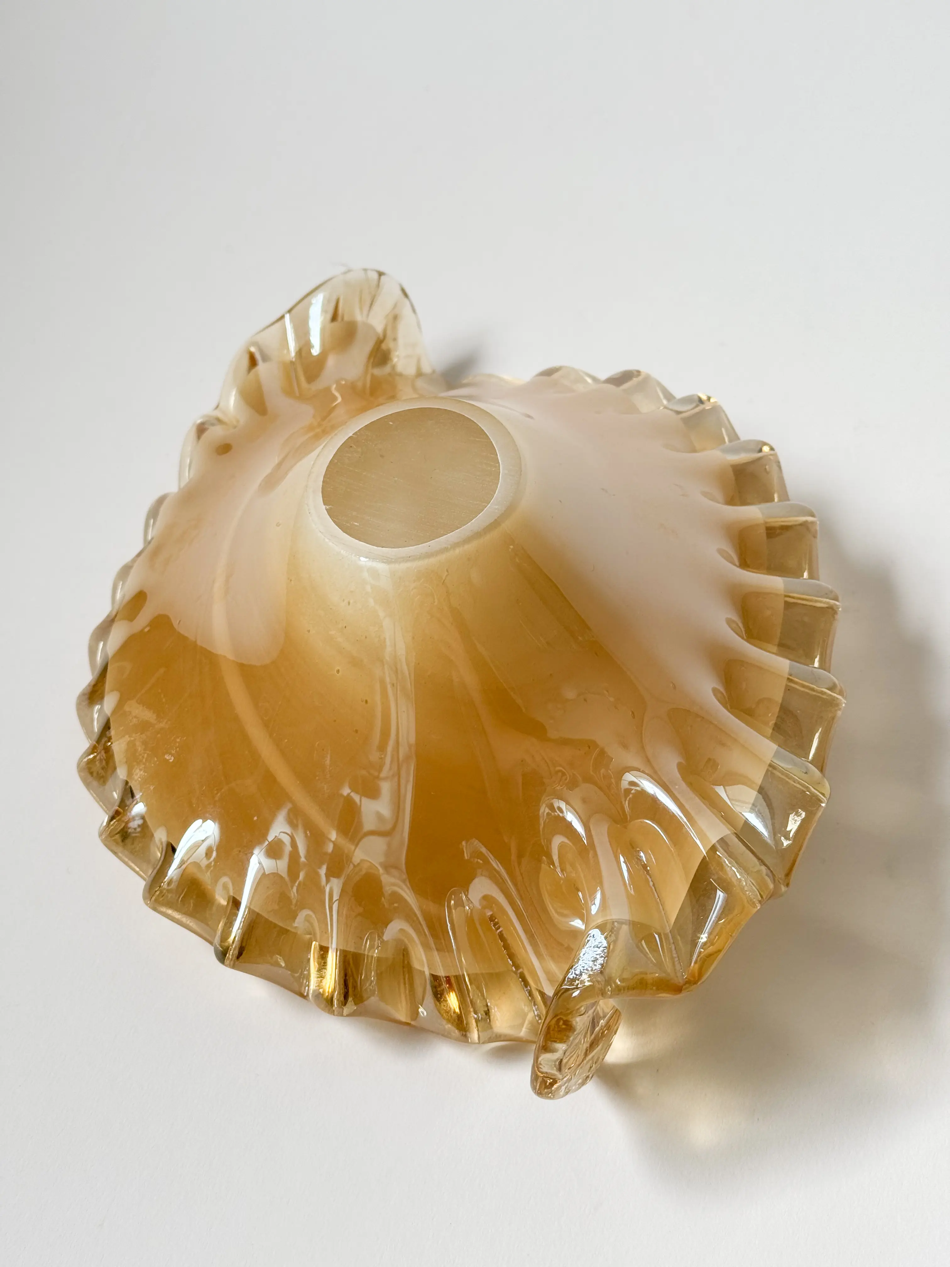 Handblown vintage bowl in peachy lustre glass with a ribbed rim. In excellent condition. Has been cleaned and inspected by Mendera.