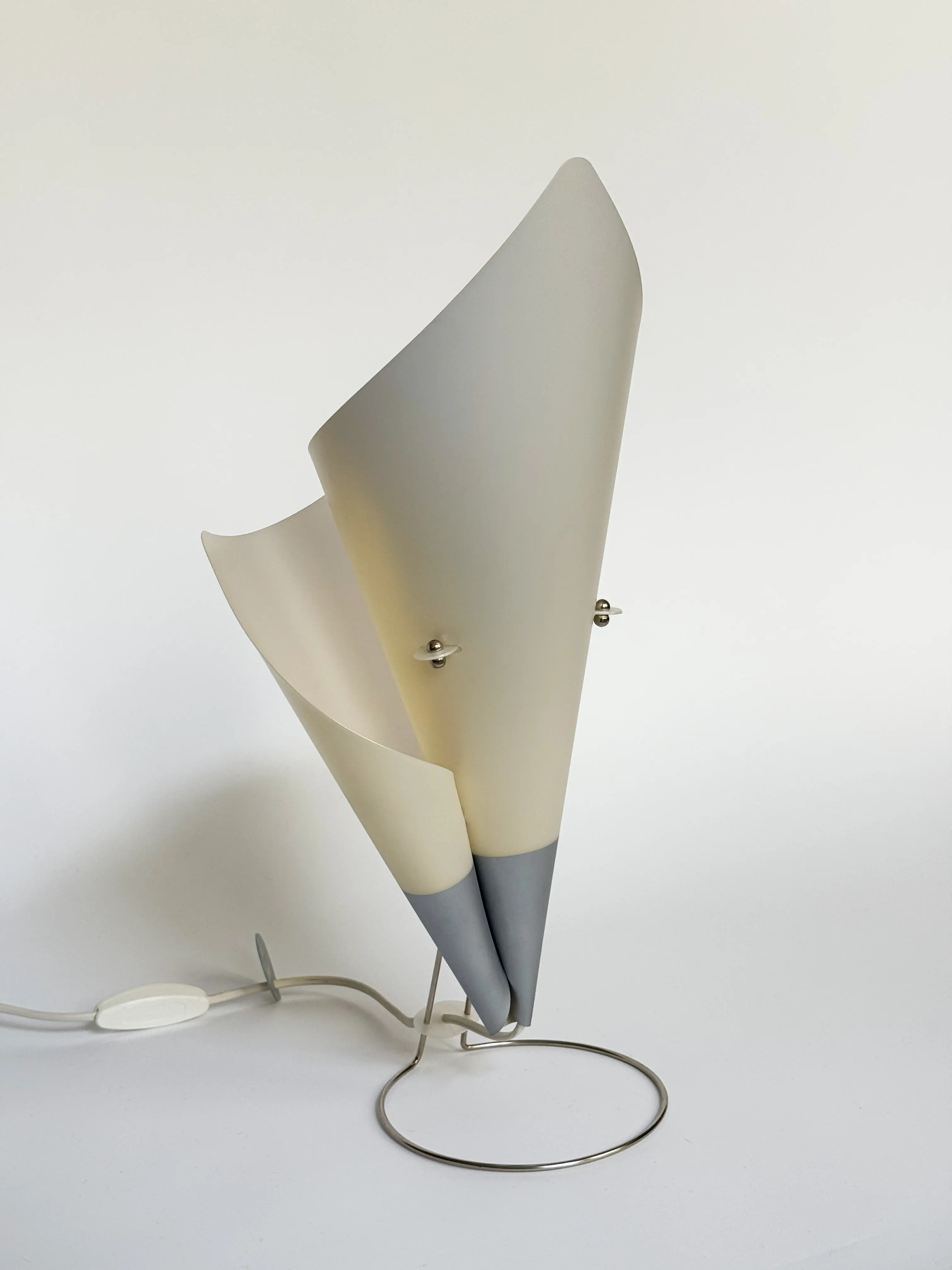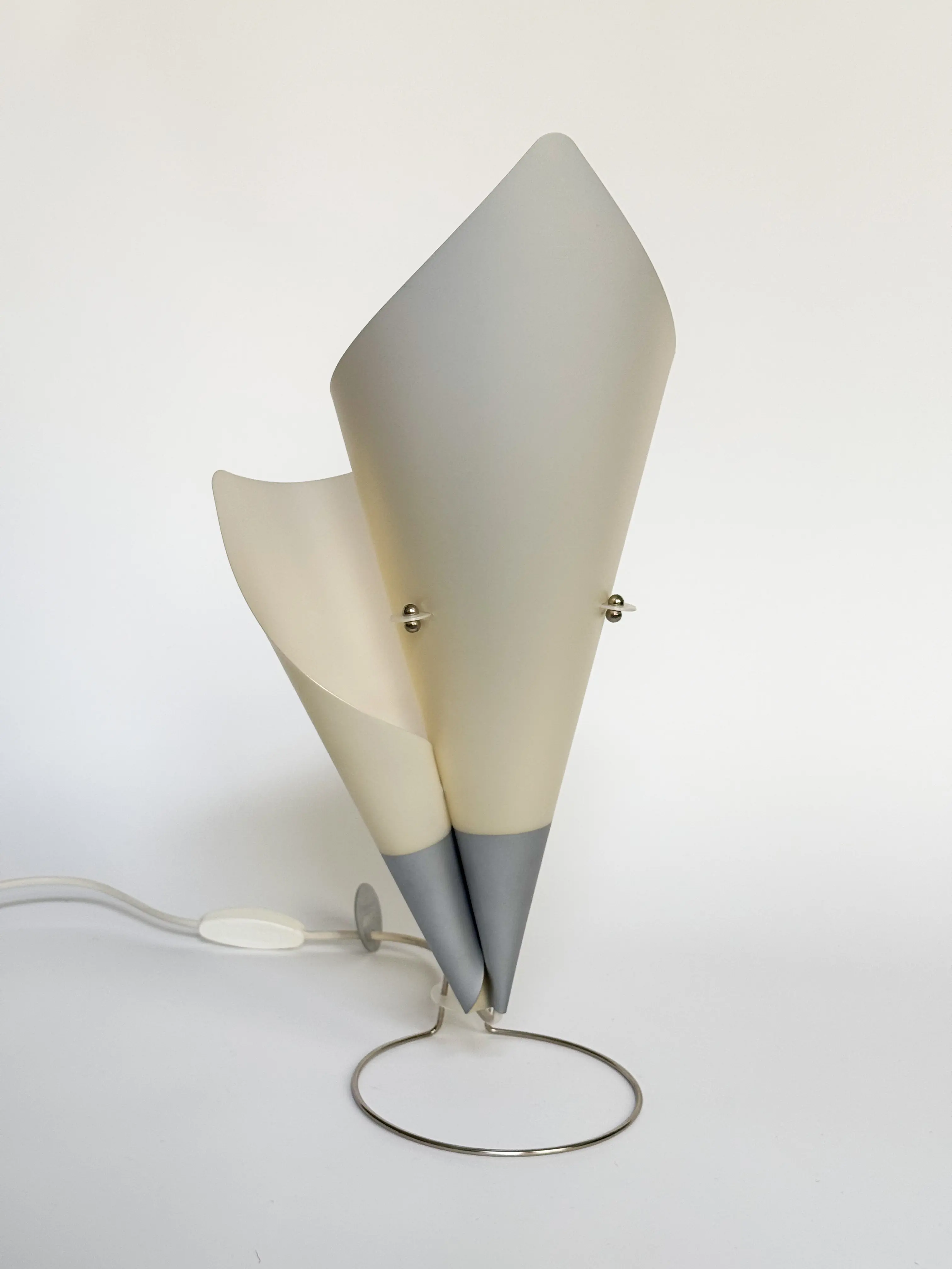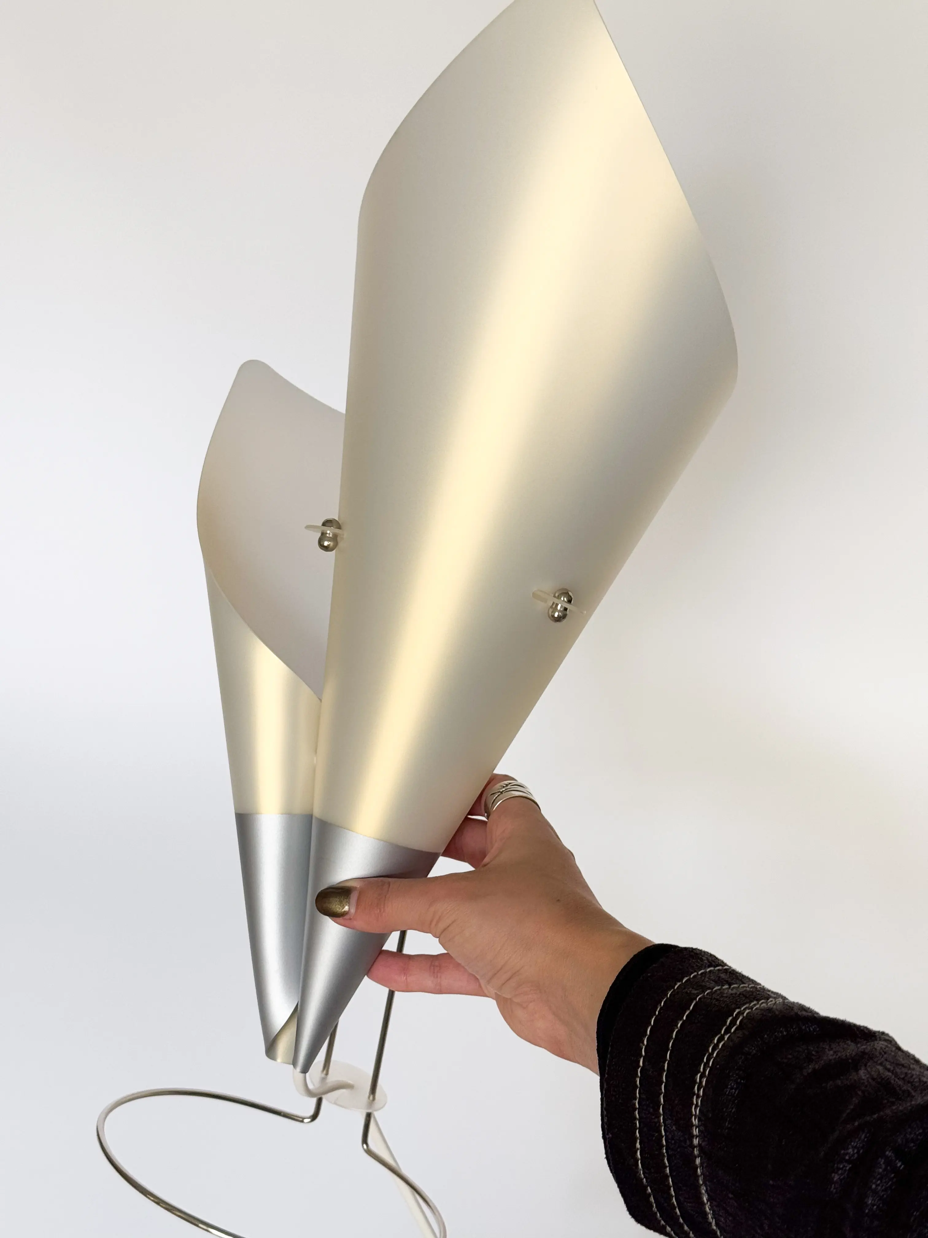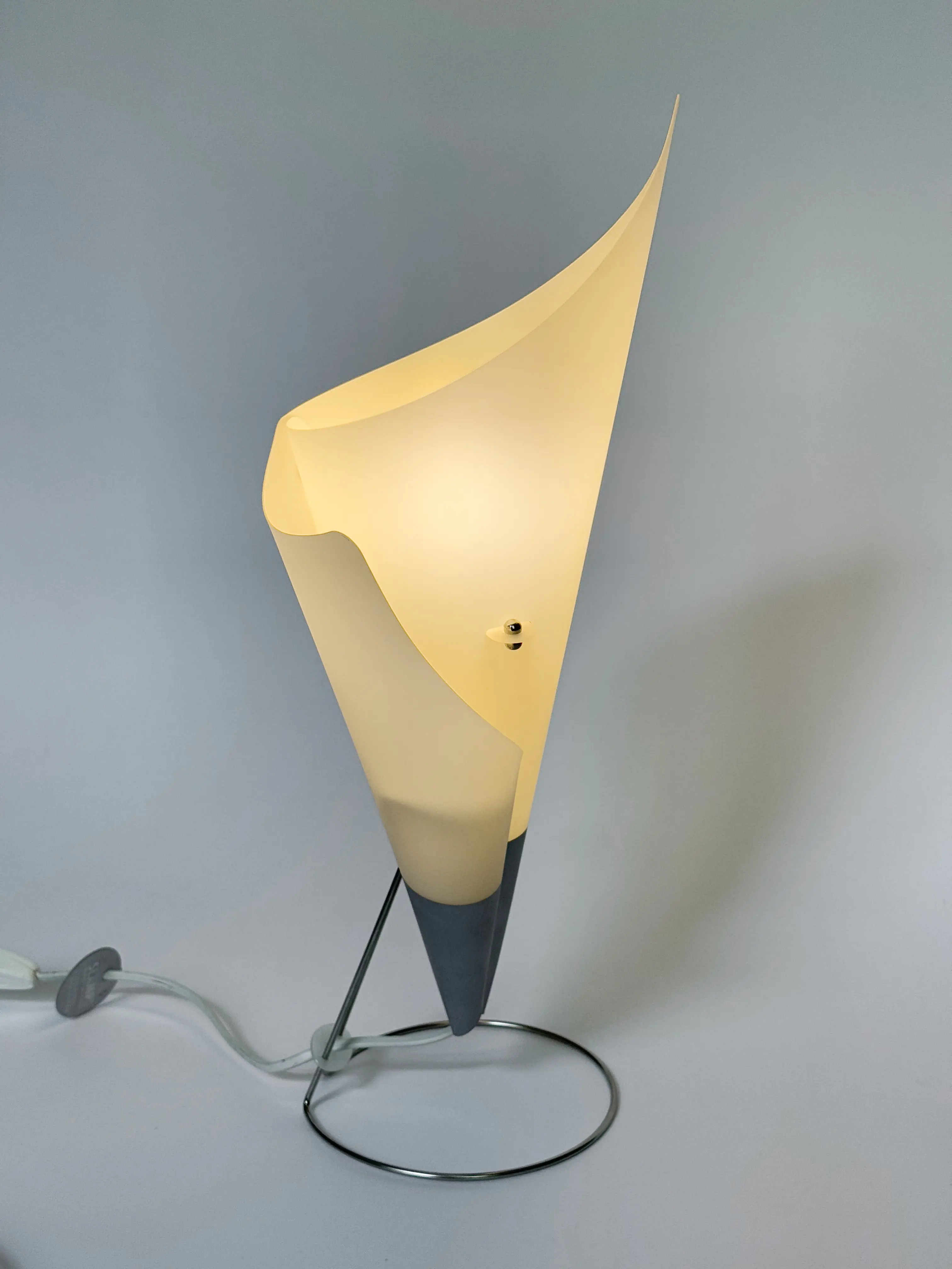 1990's Italian vintage lamp by Matteo Esposito for Slamp. Made in Italy. Light metallic frame and folded opalflex. Beautiful piercing-like details. The opalflex has a pearly finish, giving it a lustrous effect also when switched off. In great vintage condition, label attached. Has been cleaned, inspected and tested by Mendera. Another one available upon request.