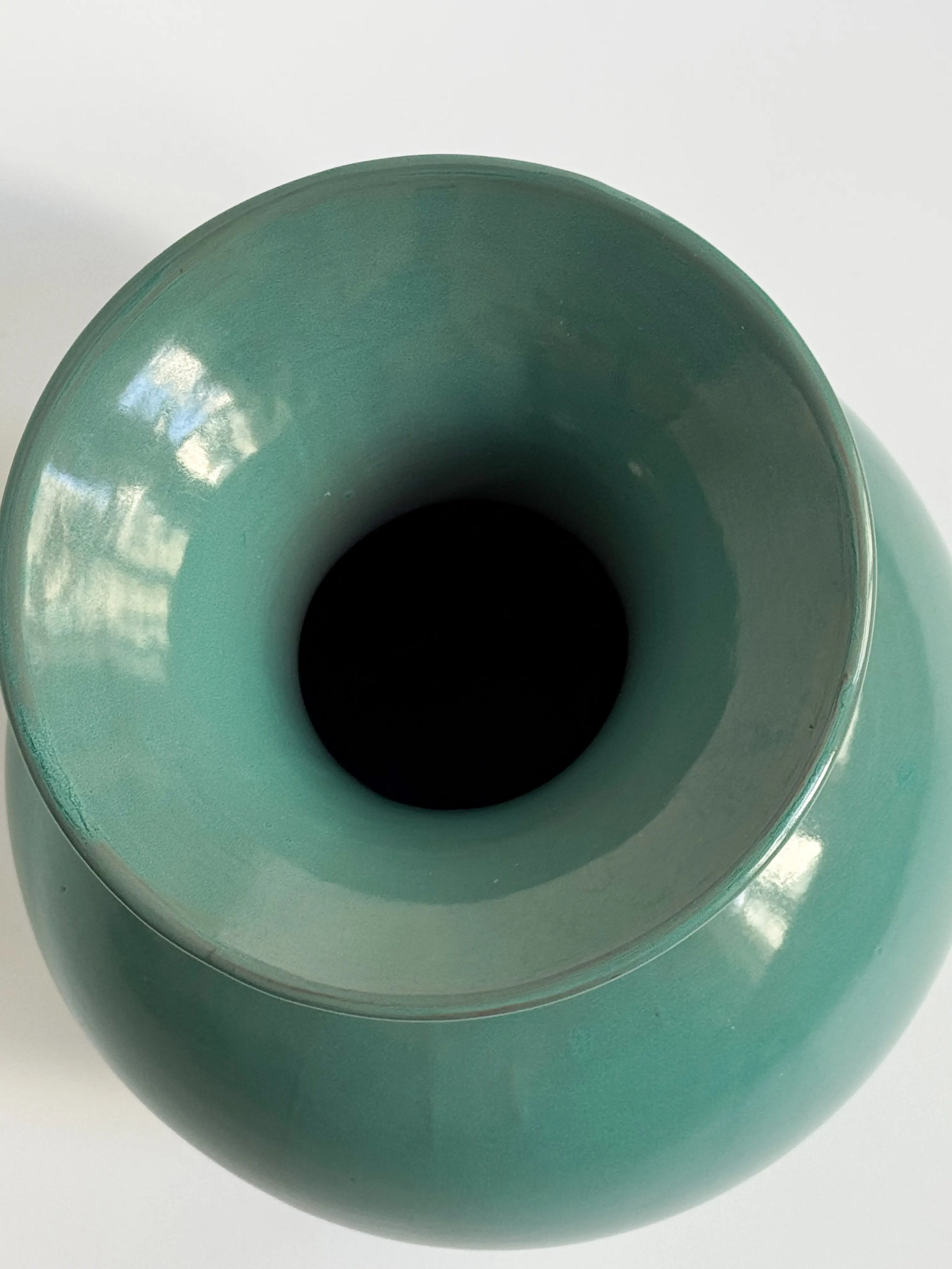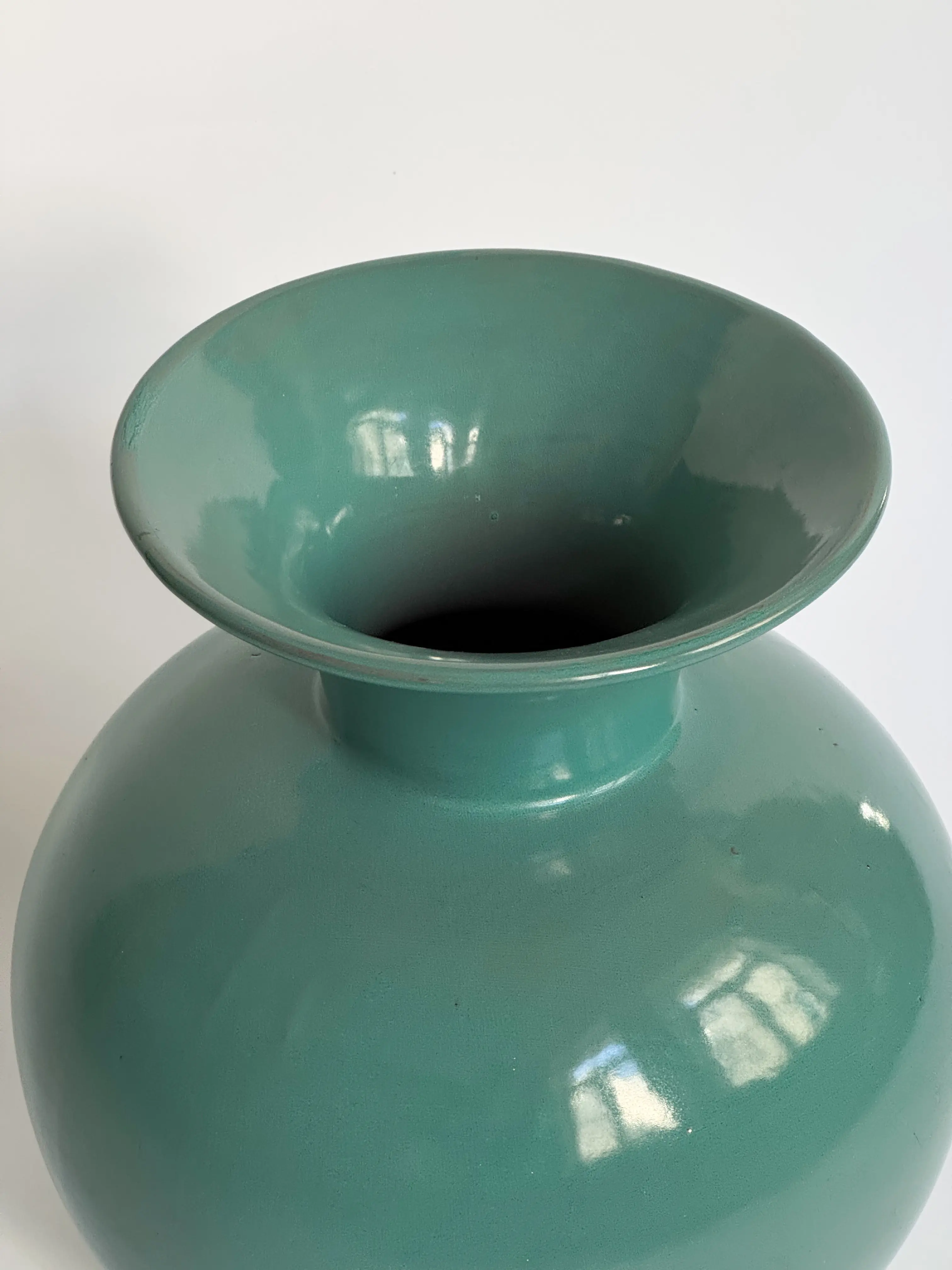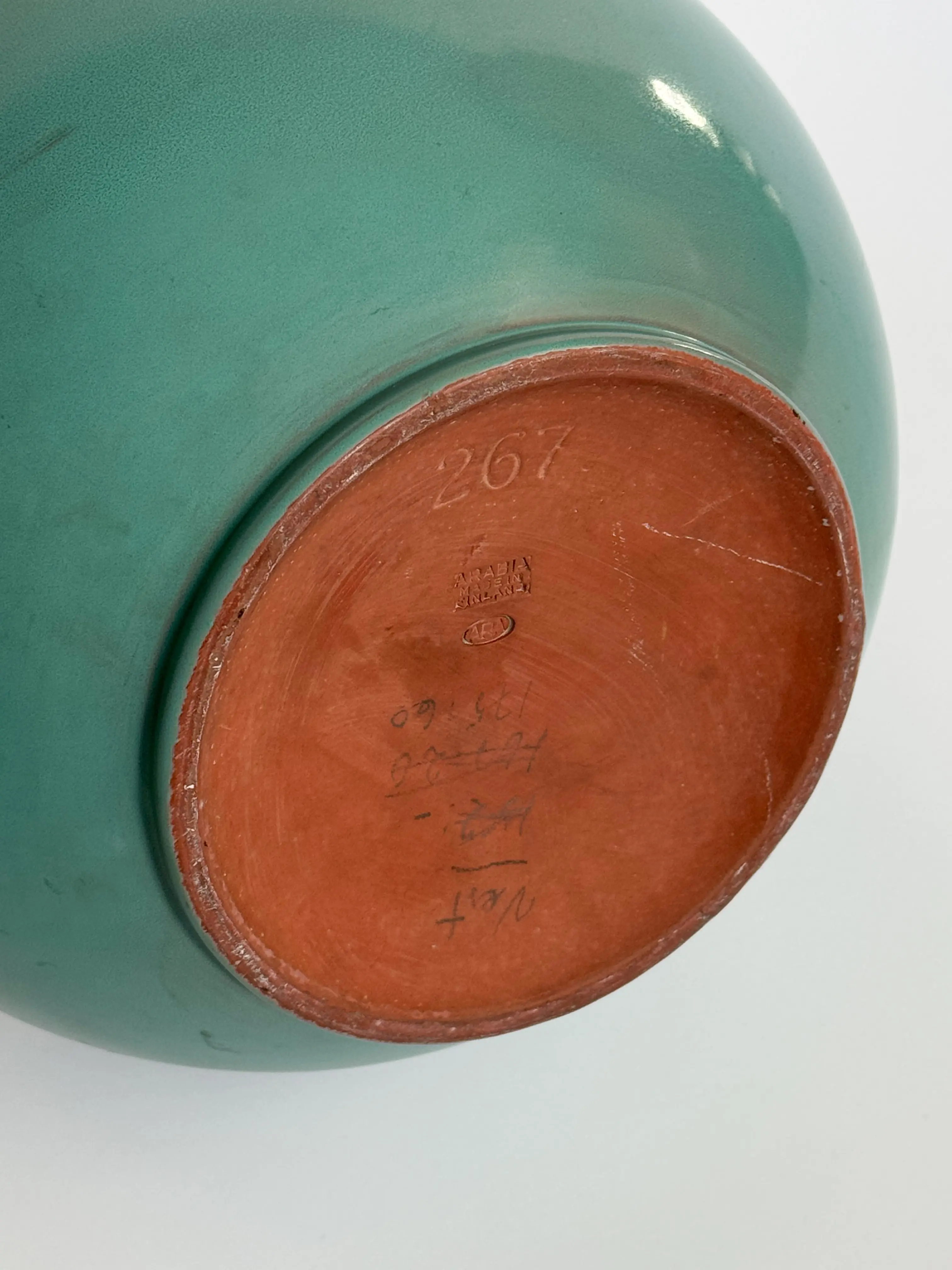 Large vintage ARA-vase by Arabia, made in Finland. Red clay in muted turquoise glazing. In great vintage condition. Has been cleaned and inspected by Mendera.