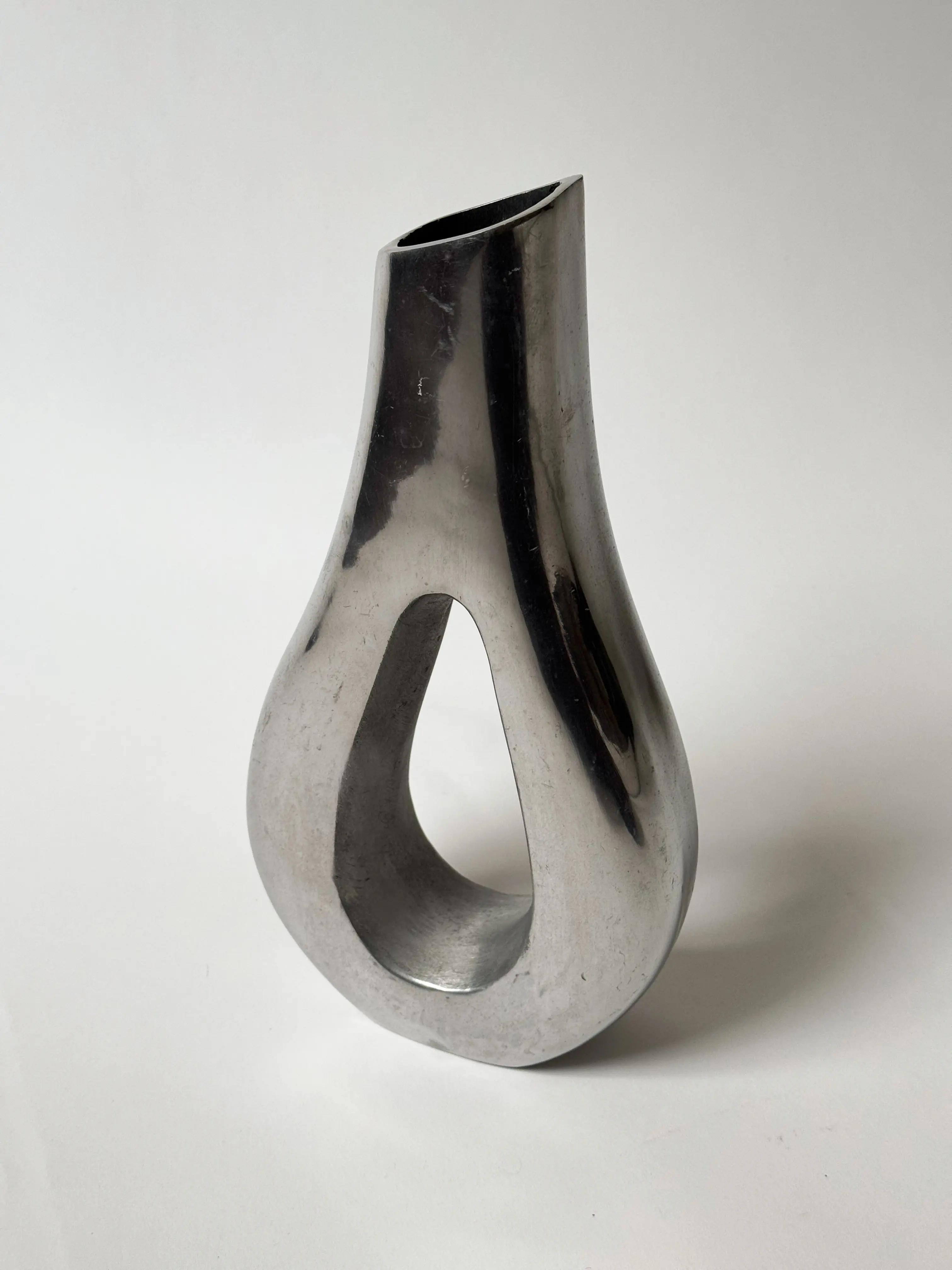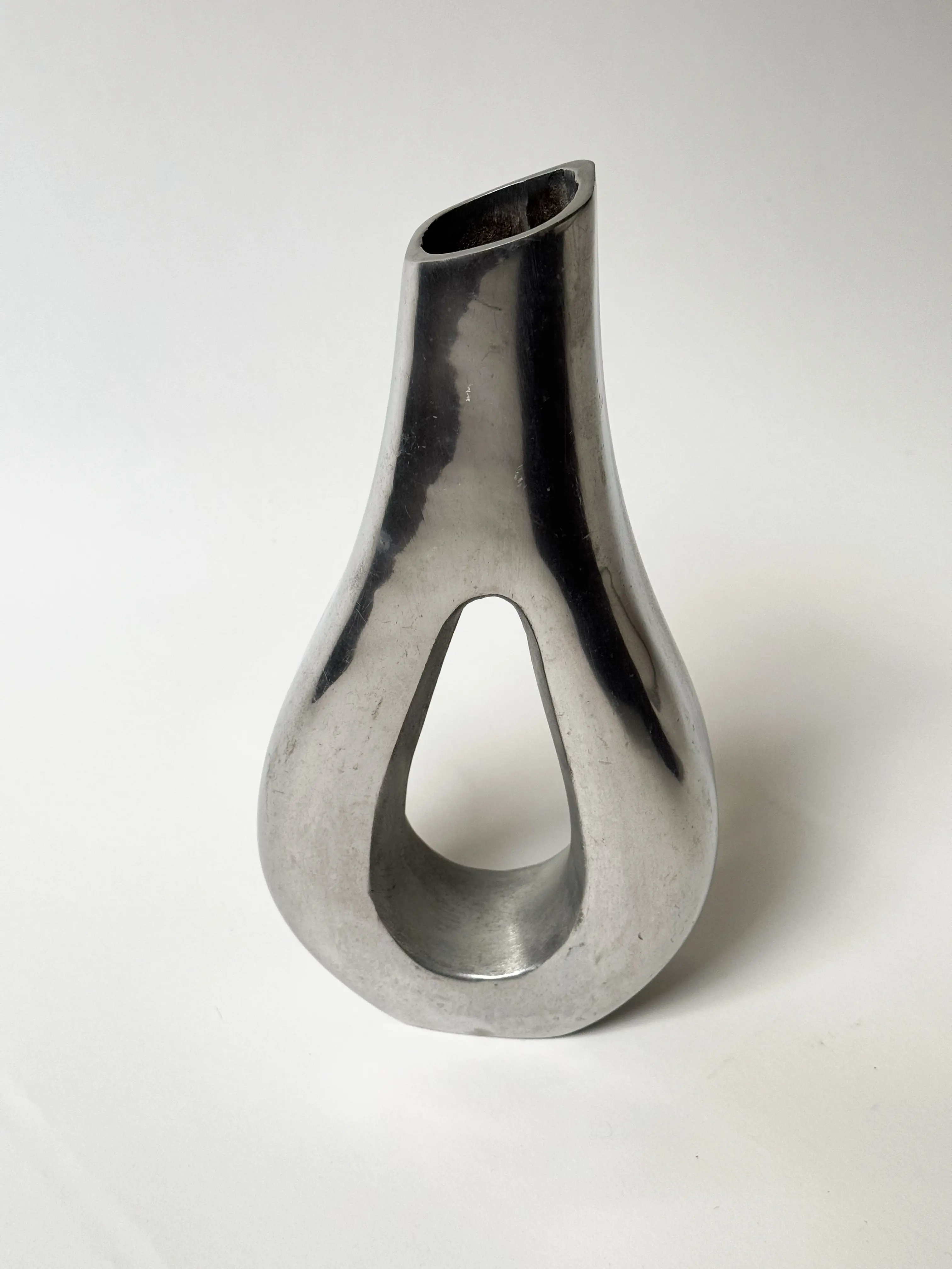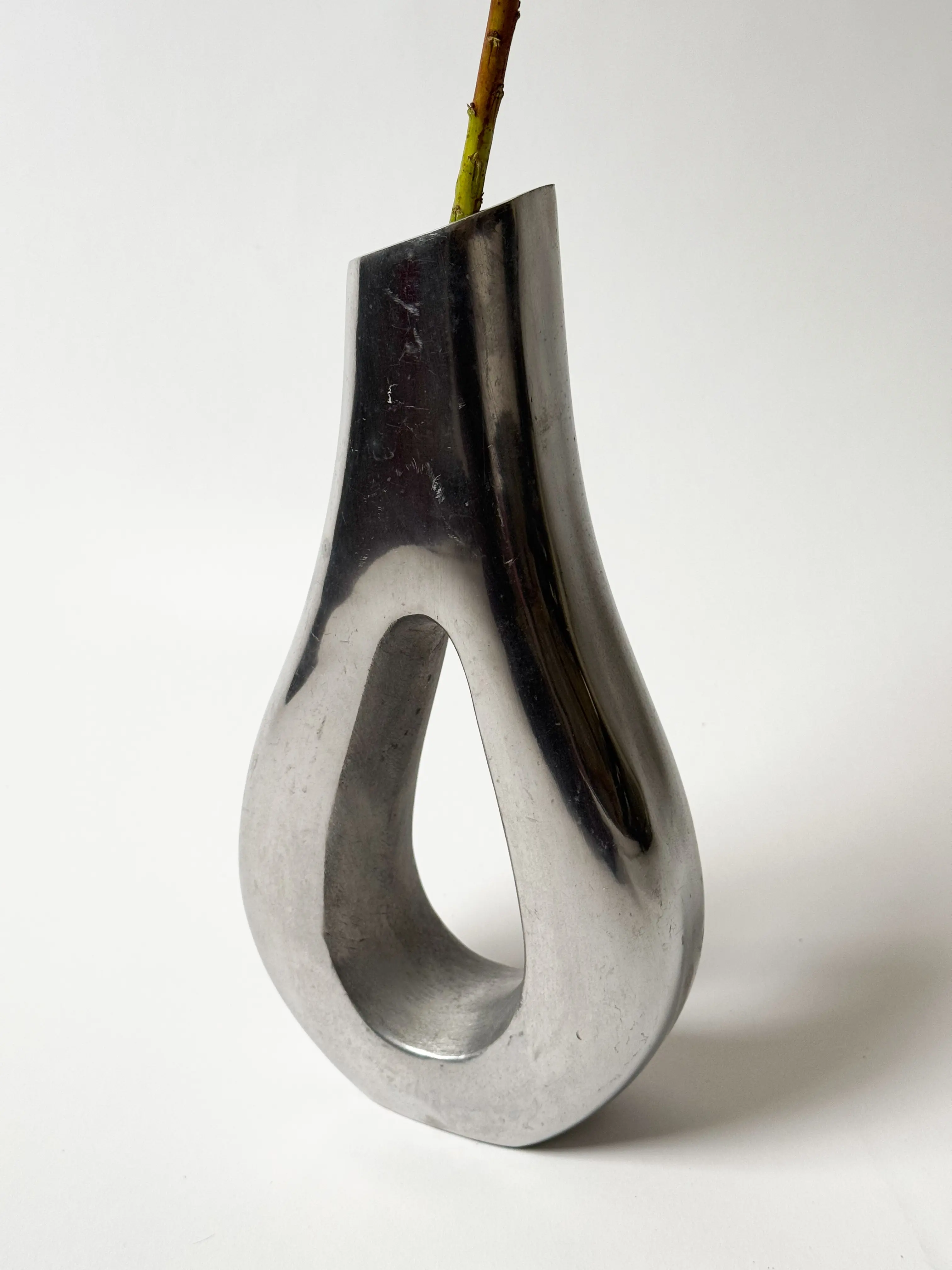 Metallic vintage vase in beautiful sculptural shape. Solid aluminium. In good overall vintage condition with some signs of wear. Has been cleaned and inspected by Mendera.