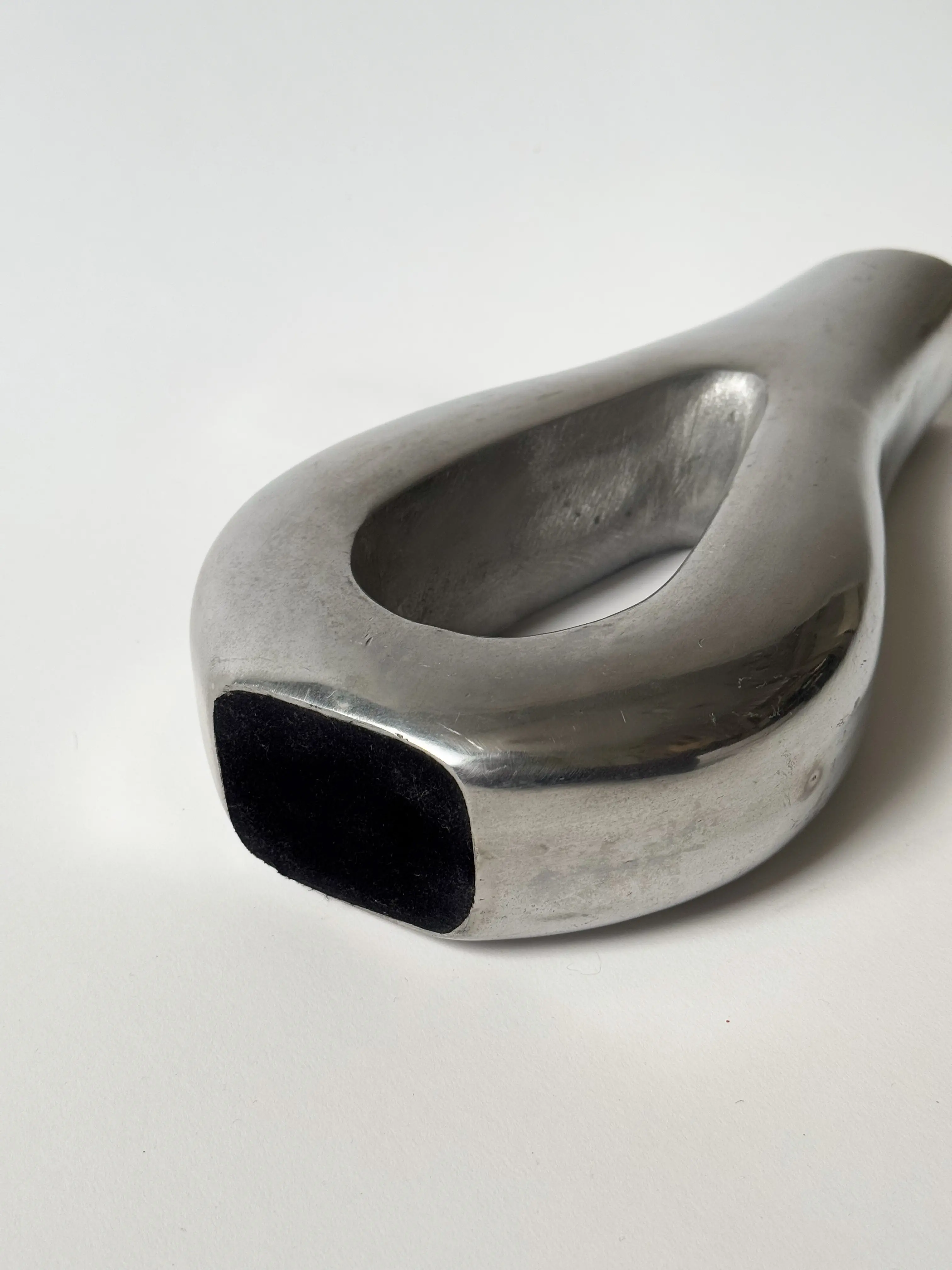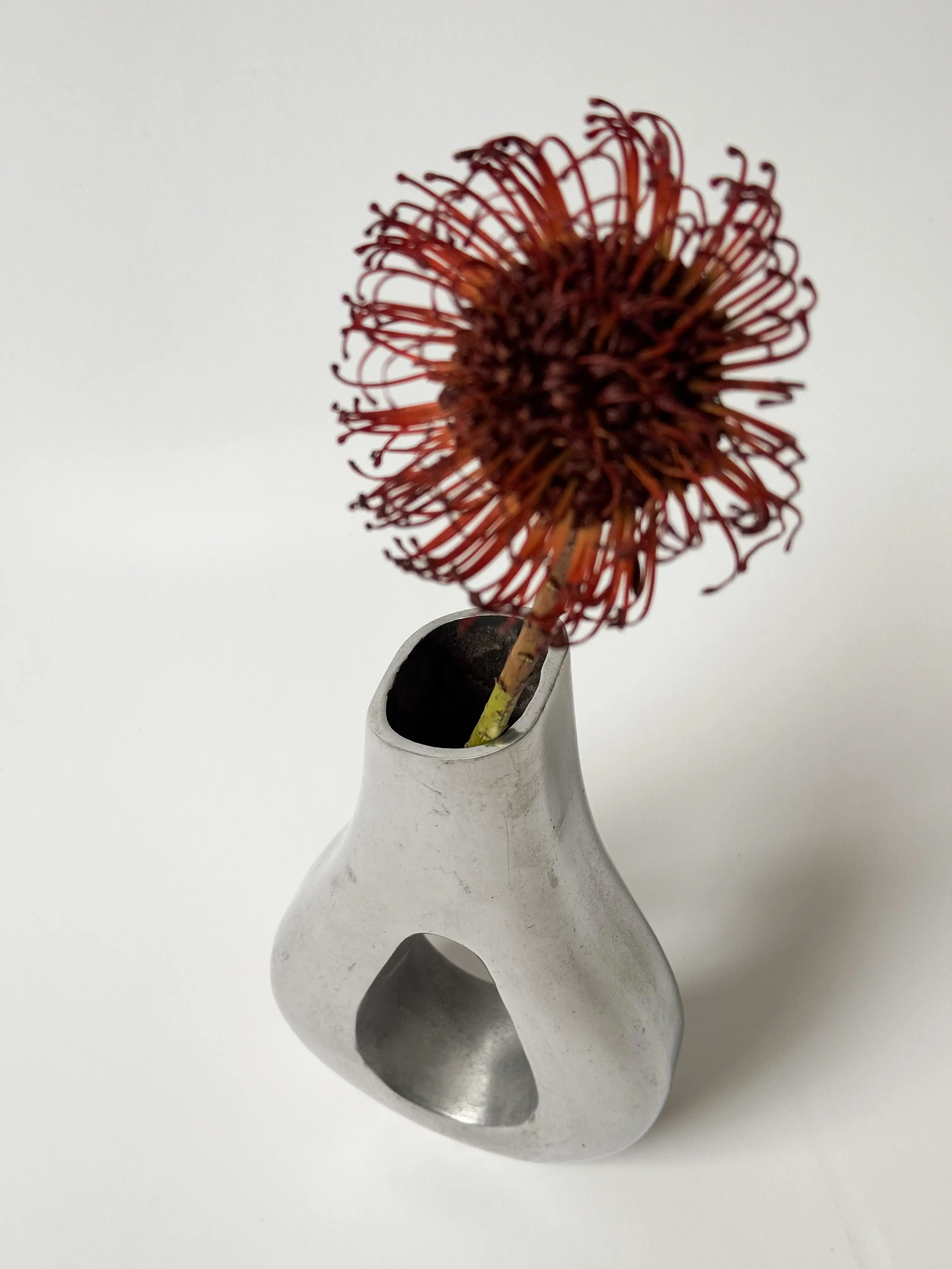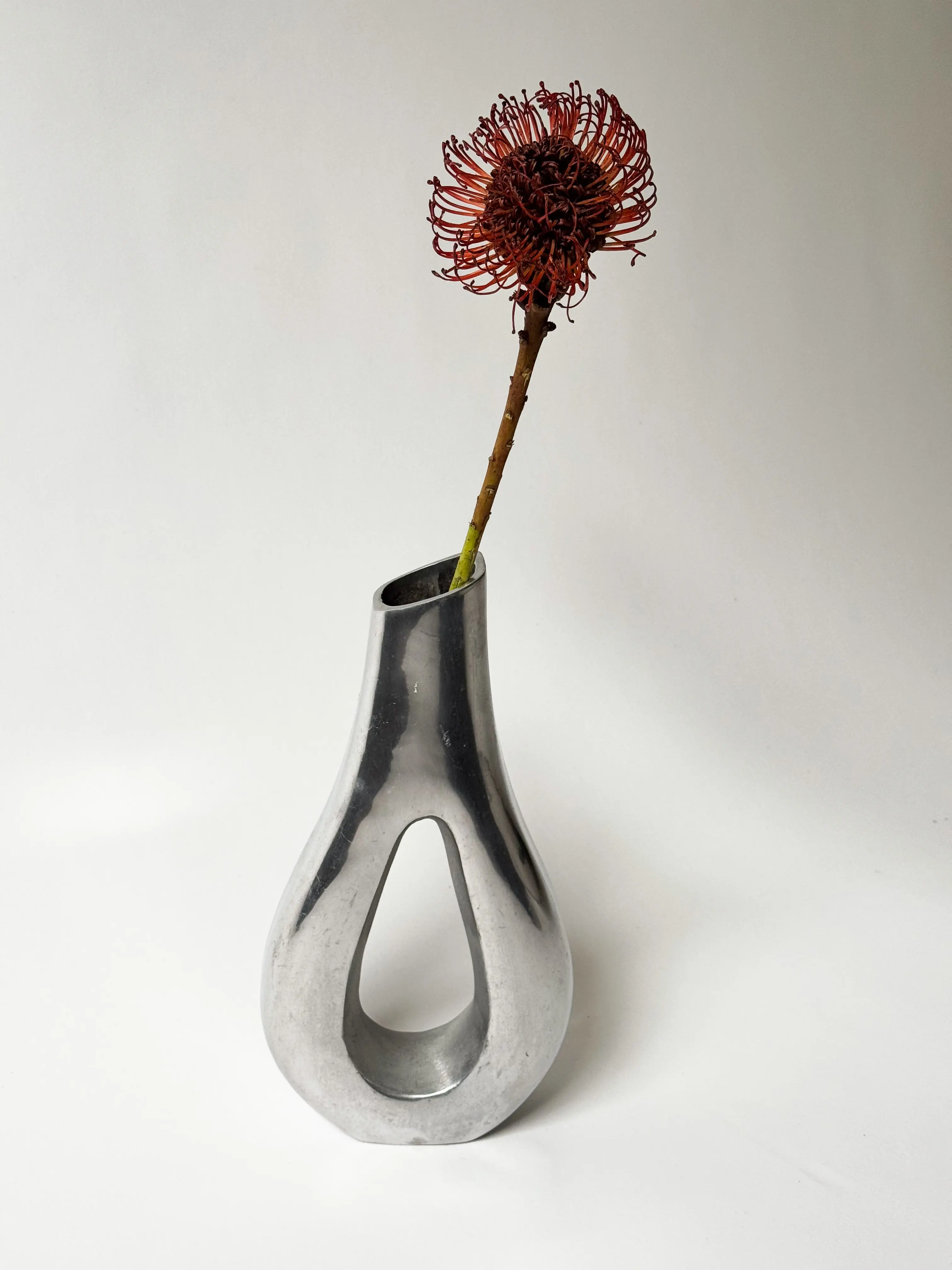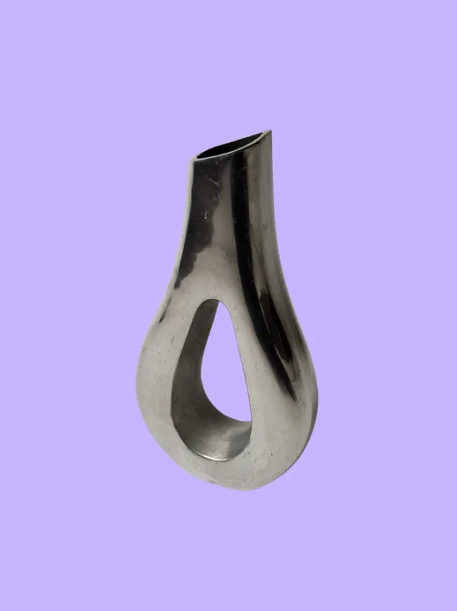 Metallic vintage vase in beautiful sculptural shape. Solid aluminium. In good overall vintage condition with some signs of wear. Has been cleaned and inspected by Mendera.