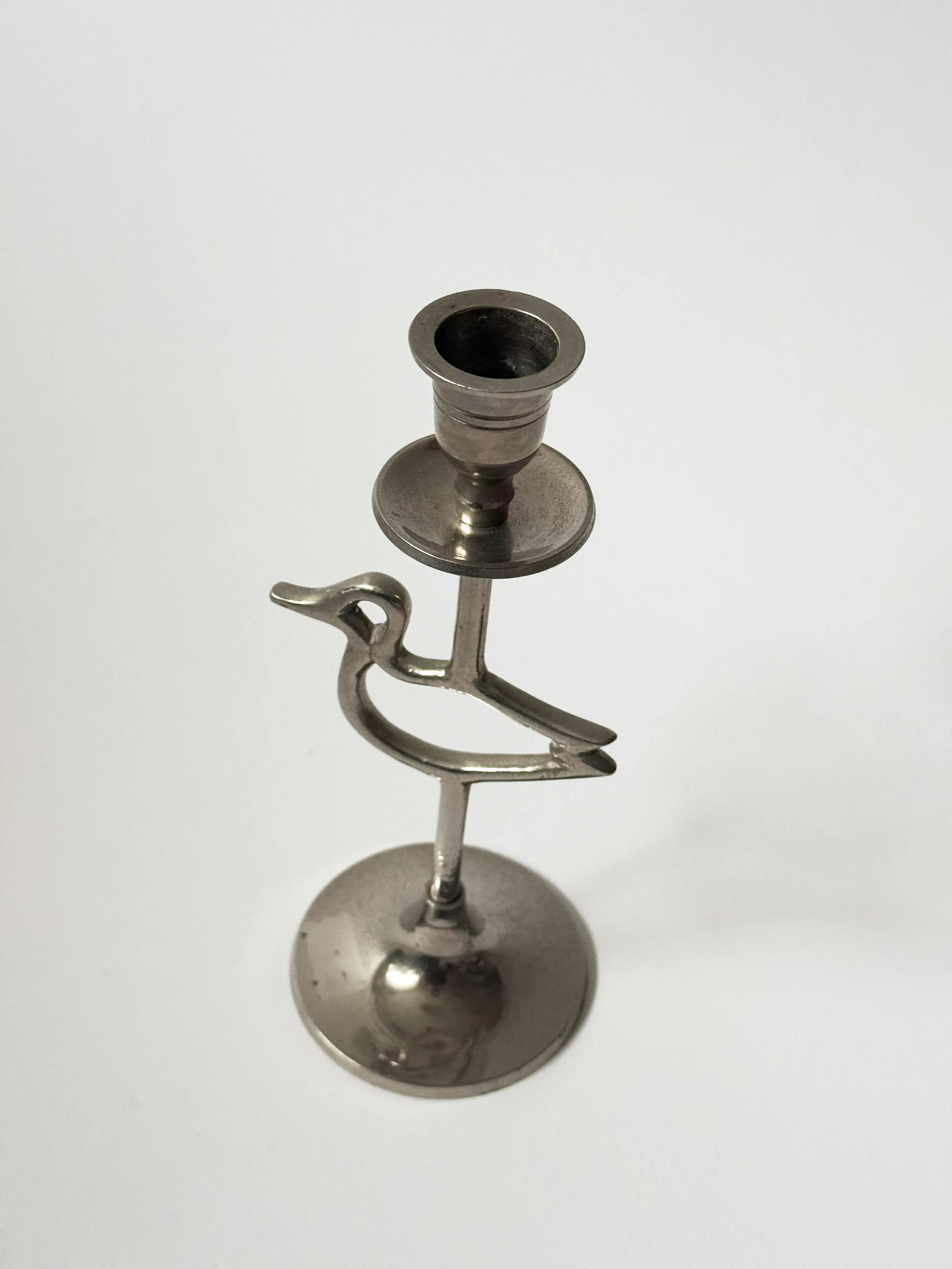 Metallic vintage candlestick with a duck motif. In good condition, with some signs of patina. Has been cleaned and inspected by Mendera.