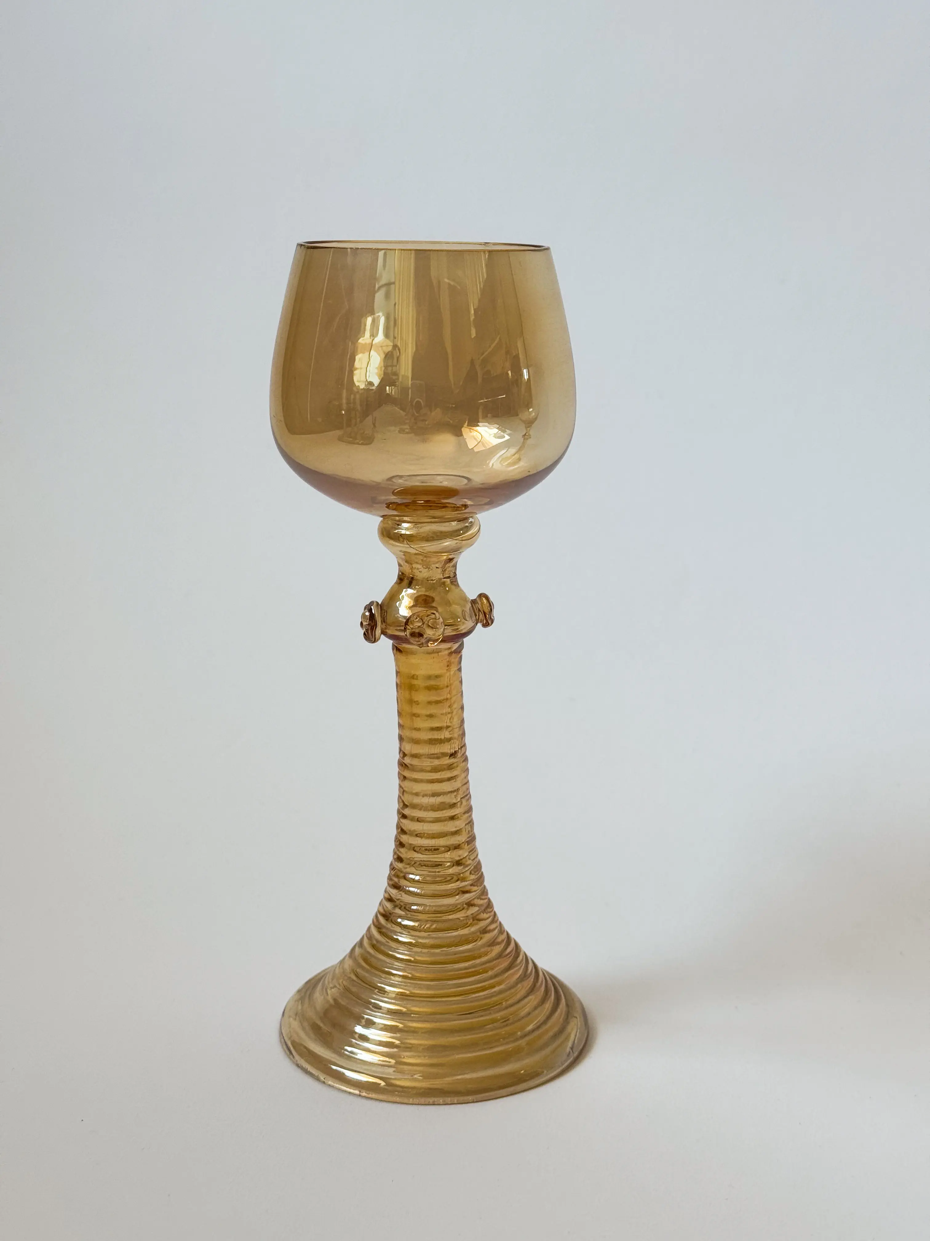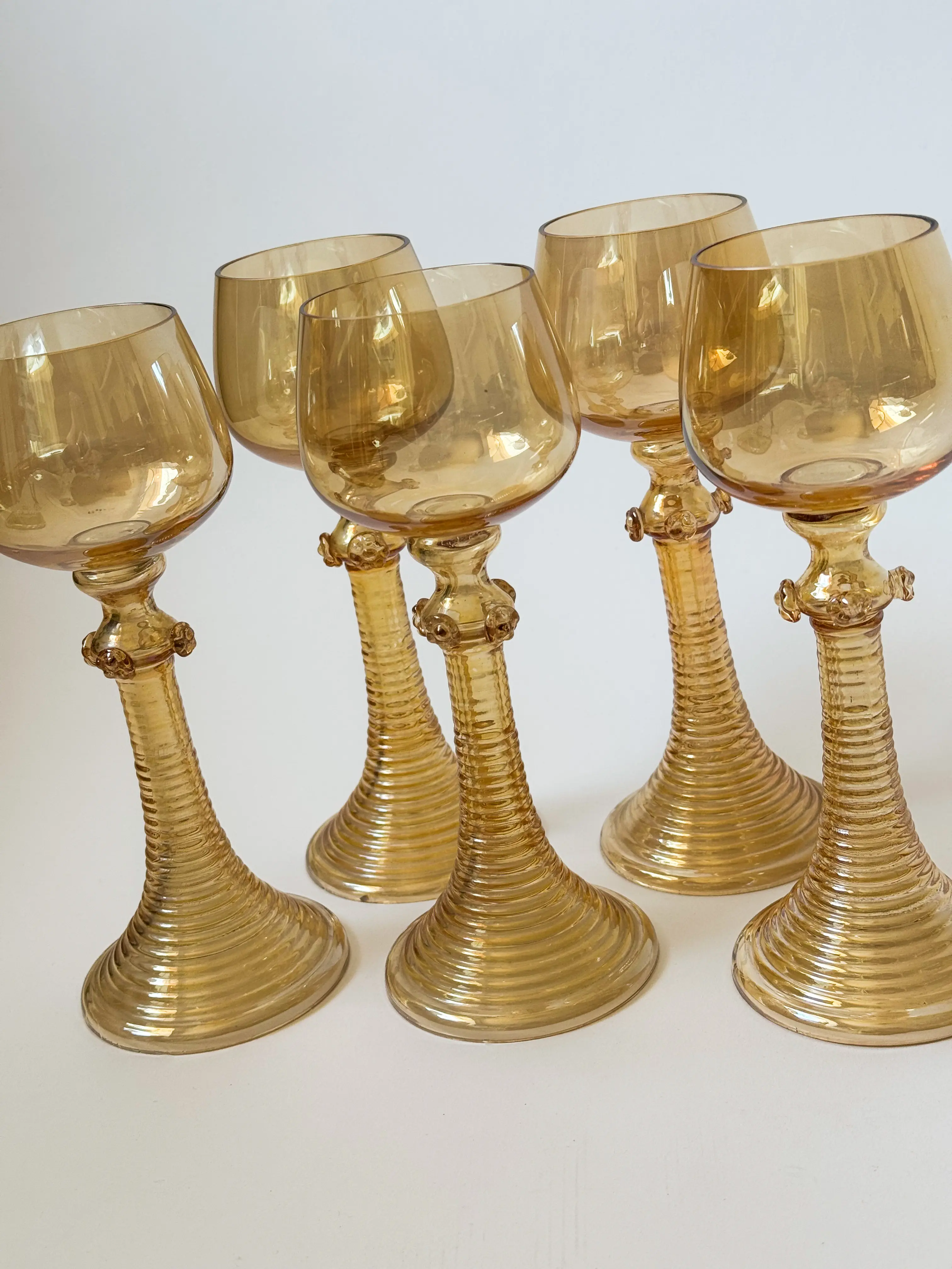 Handblown tall vintage wine glasses in peach lustre glass. Dating back to the 1930's. Beautiful ribbed stem with floral details. In great condition. Has been cleaned and inspected by Mendera. Sold as a set of 5.