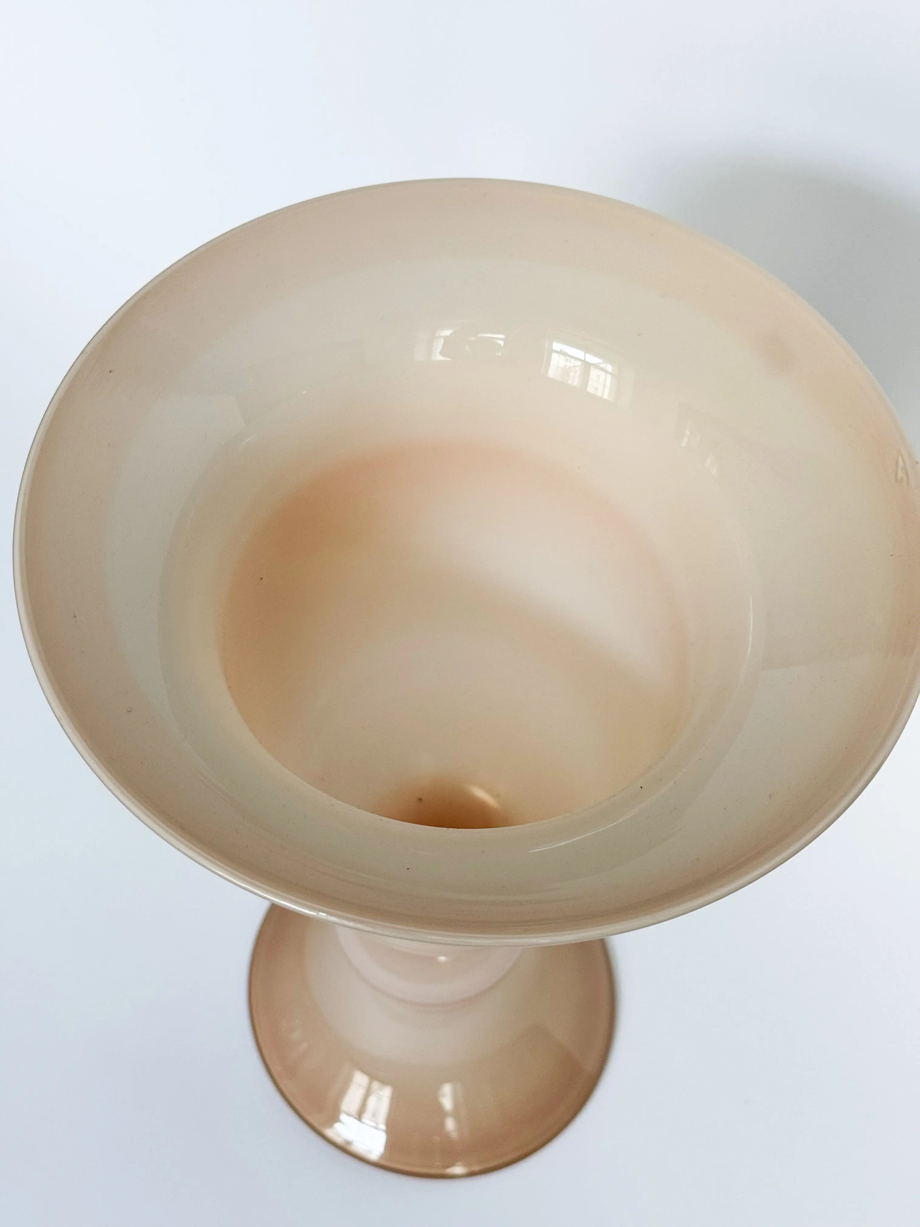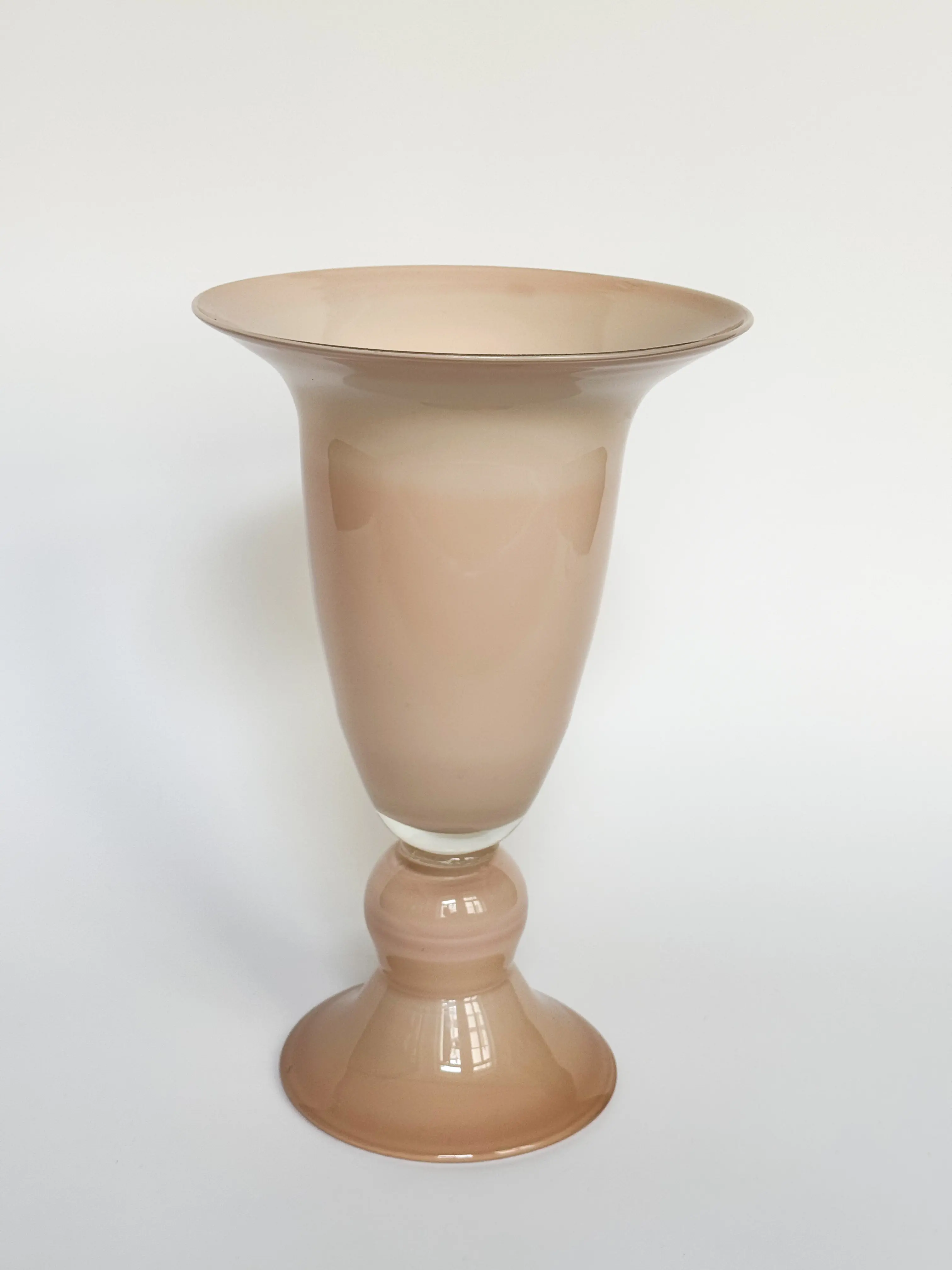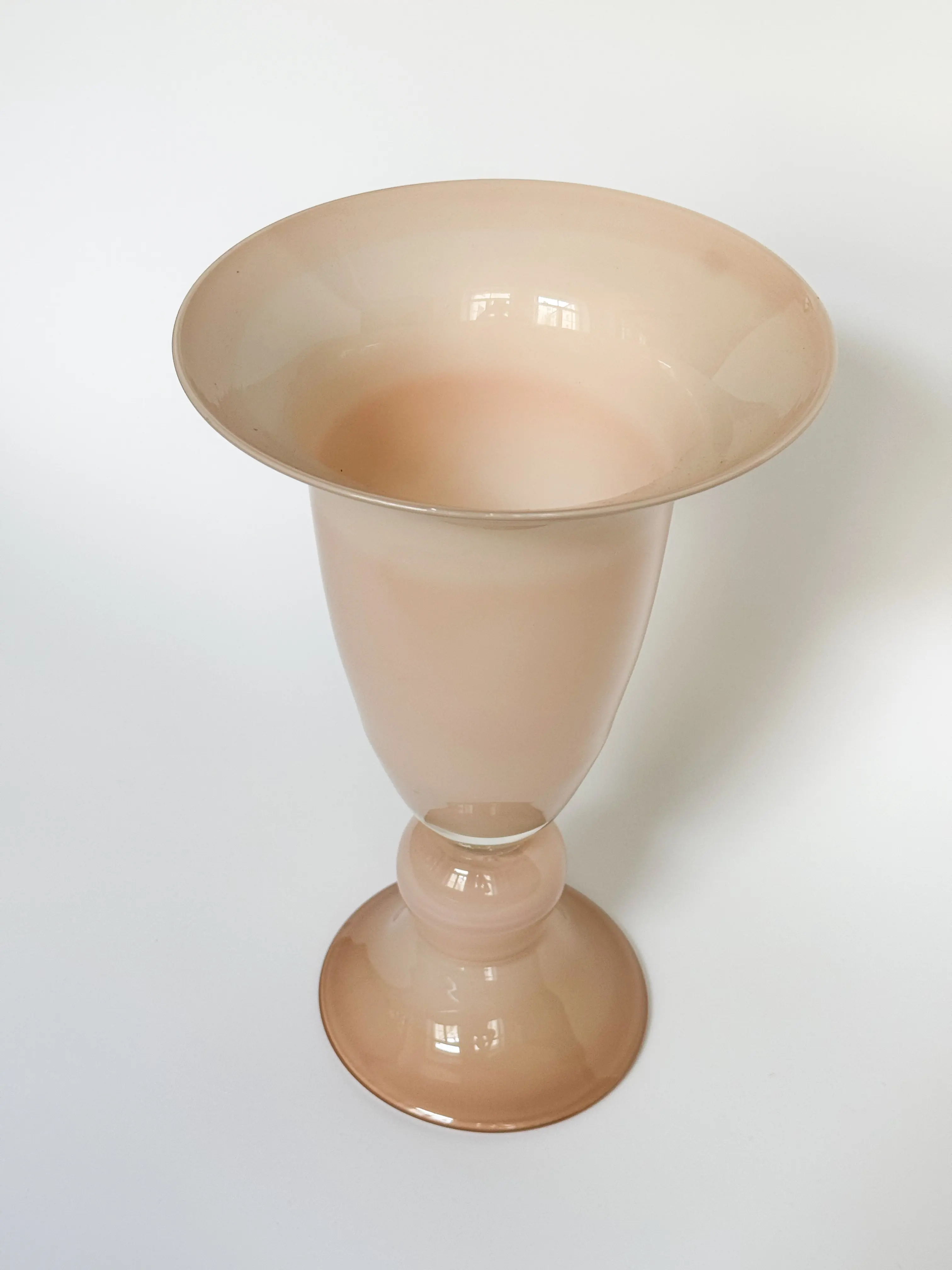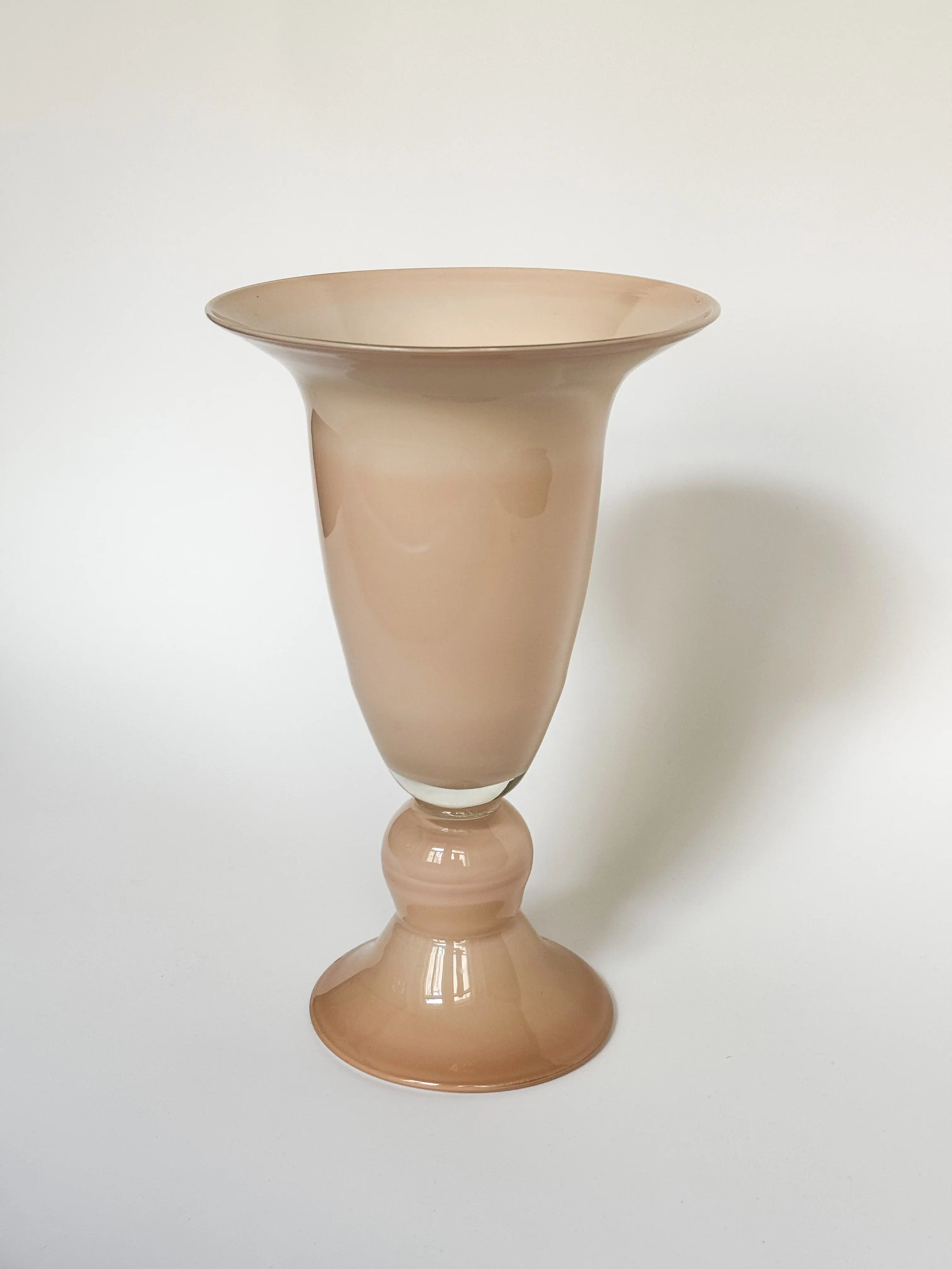 Tall vintage glass vase in a soft nude / powder pink shade. In great vintage condition. Has been cleaned and inspected by Mendera.