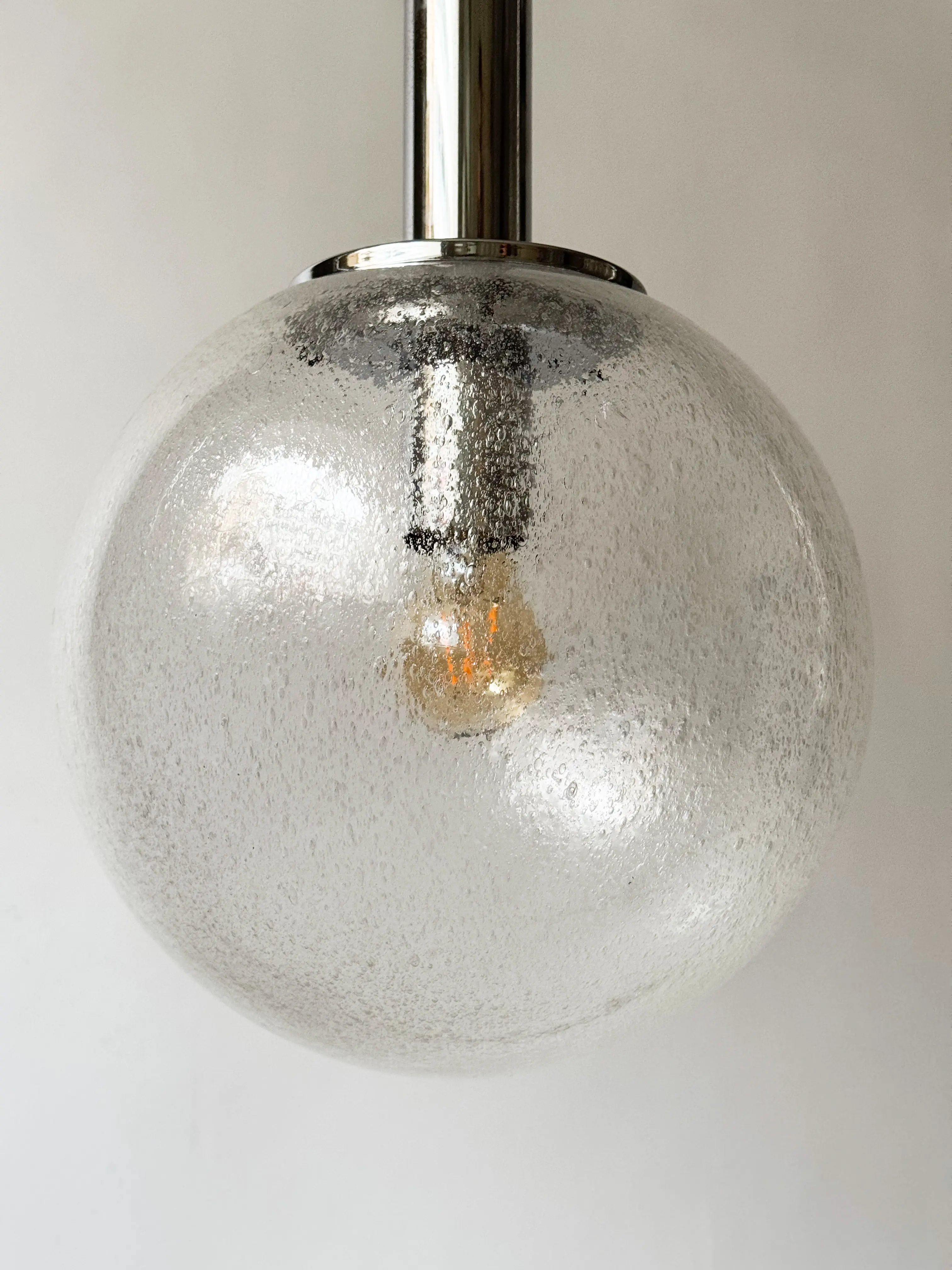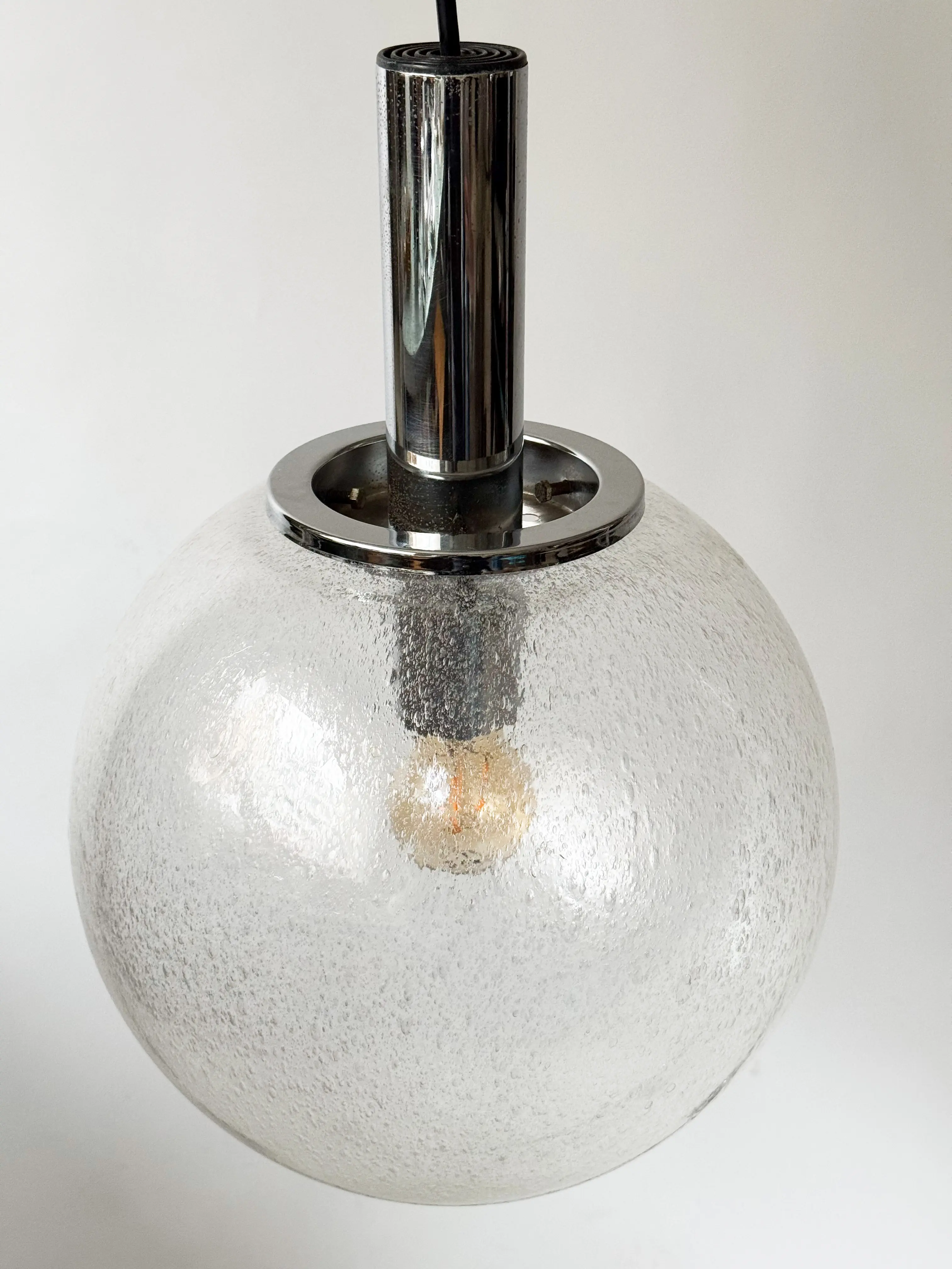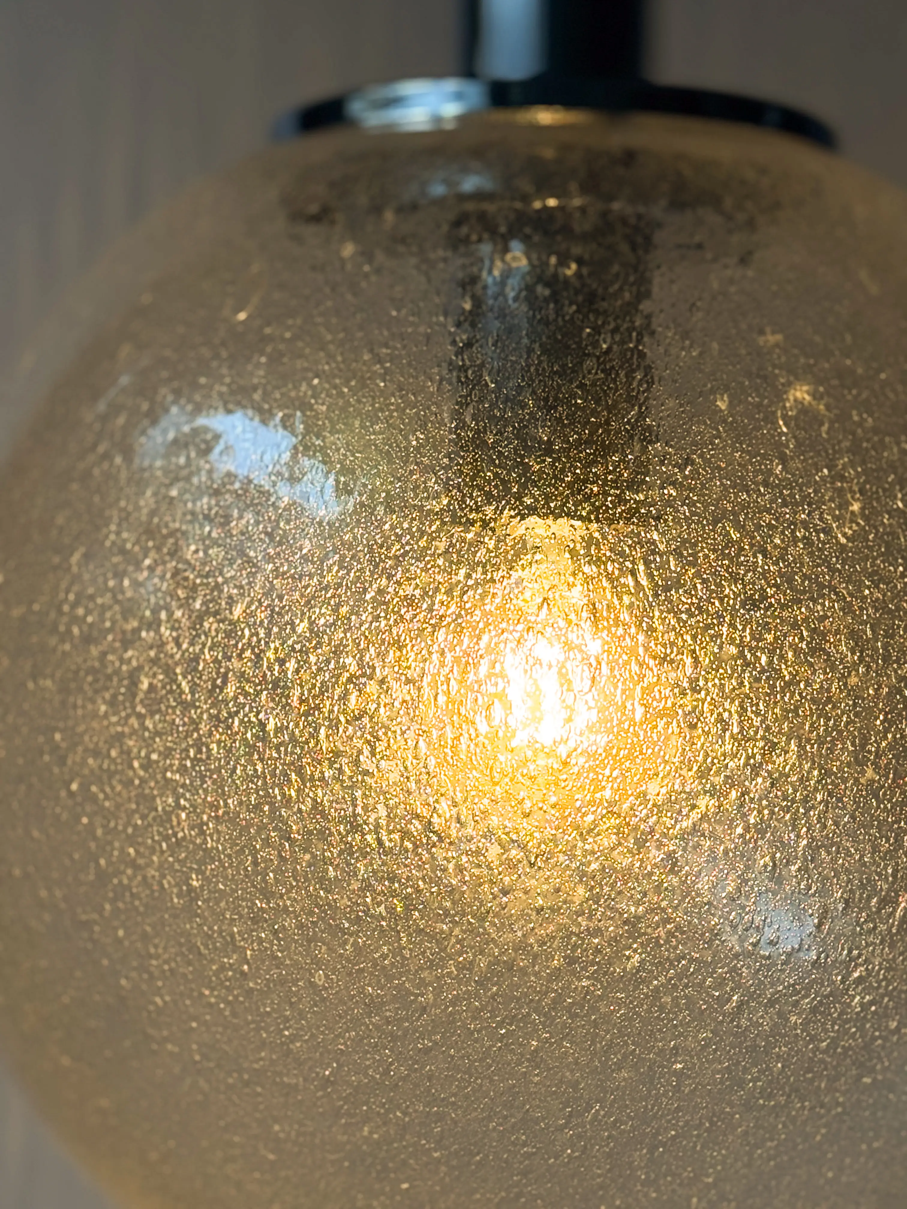 60s Targetti Sankey pendant lamp in handblown Murano glass, in pulegoso technique. Made in Italy. Chrome frame. The pulegoso glass gives a beautiful and cosy glow. In good overall condition. Has some patina on the metal structure and a tiny mark on the glass - see pictures. Has been cleaned, inspected and tested by Mendera.