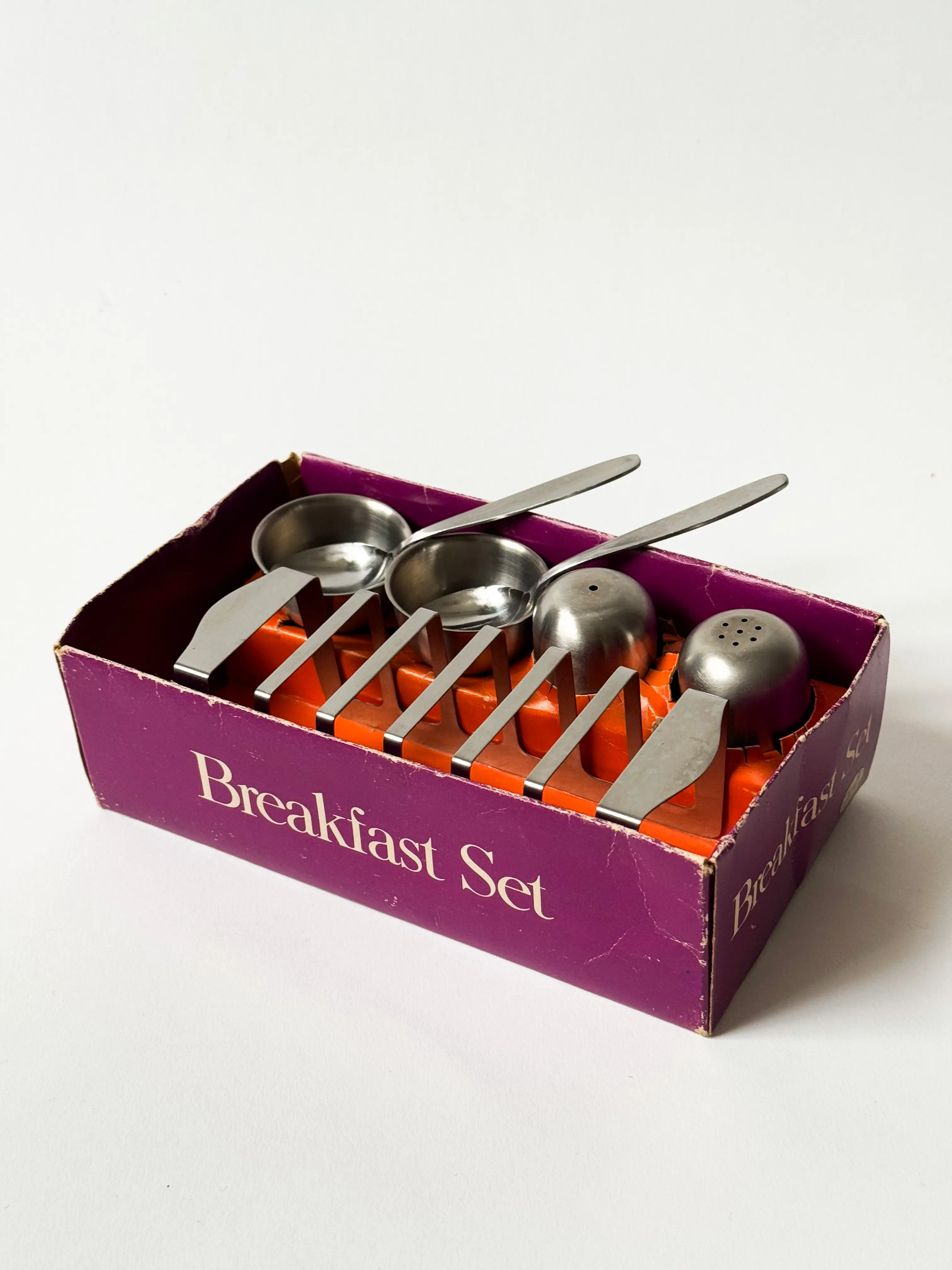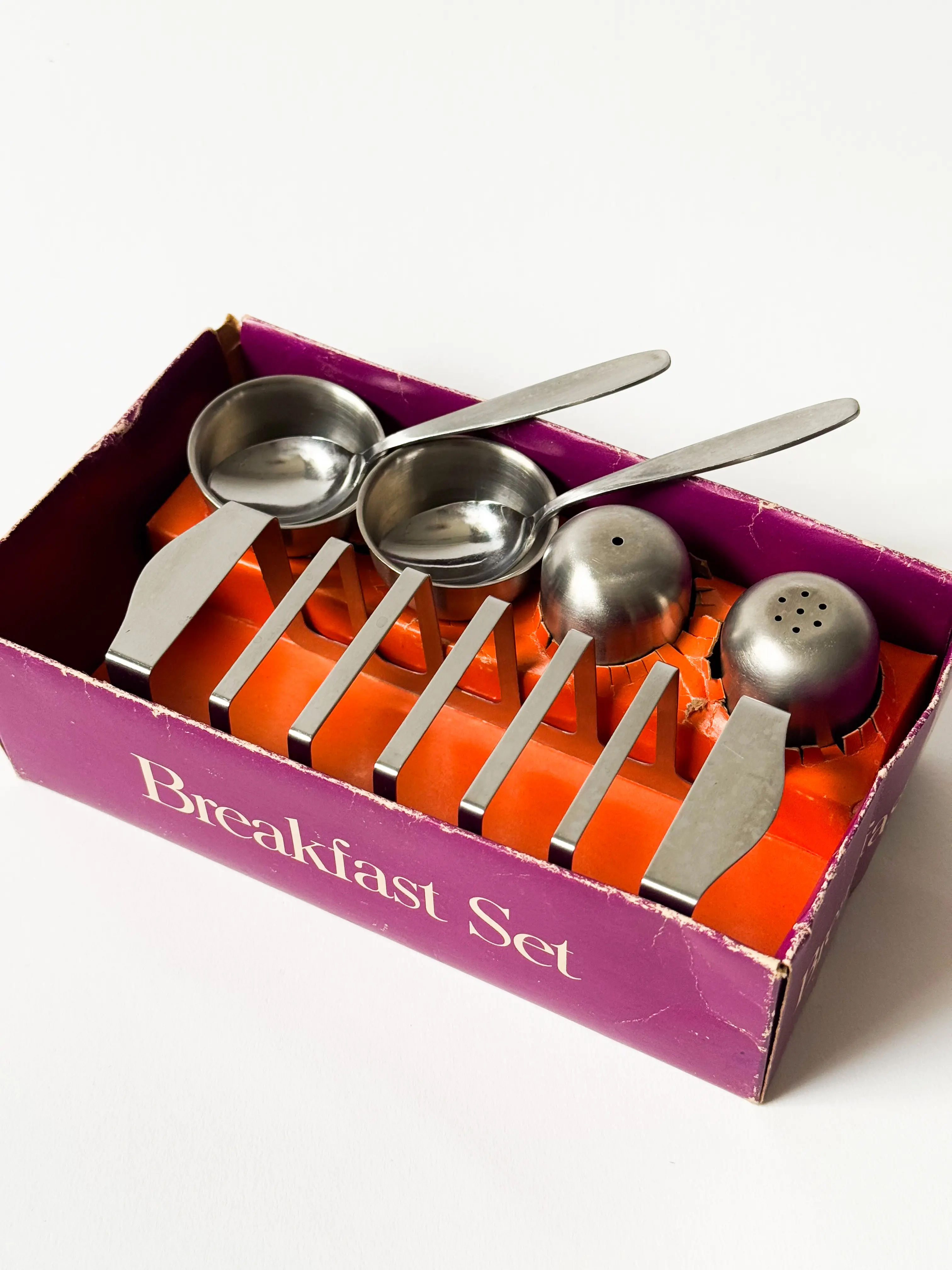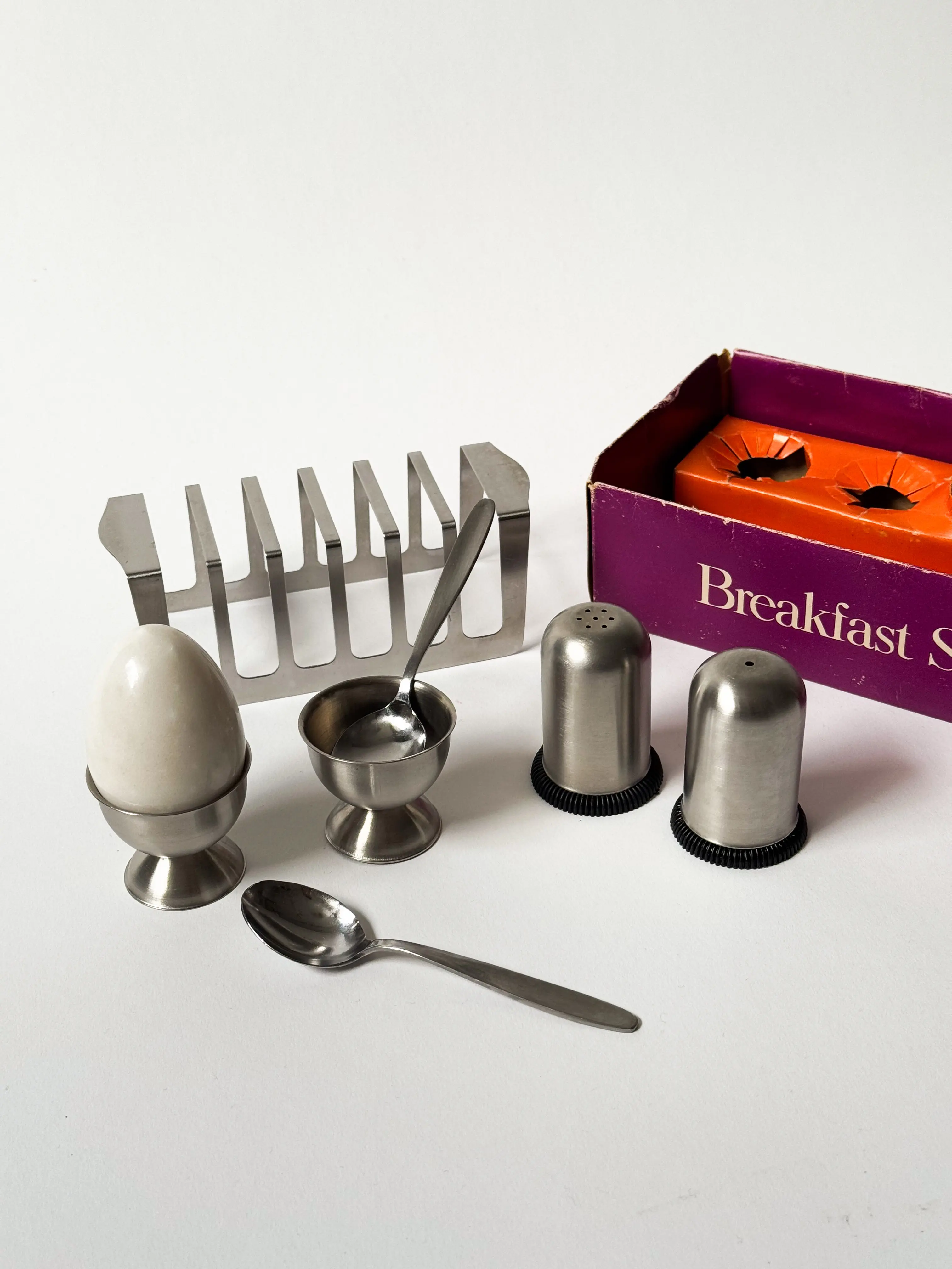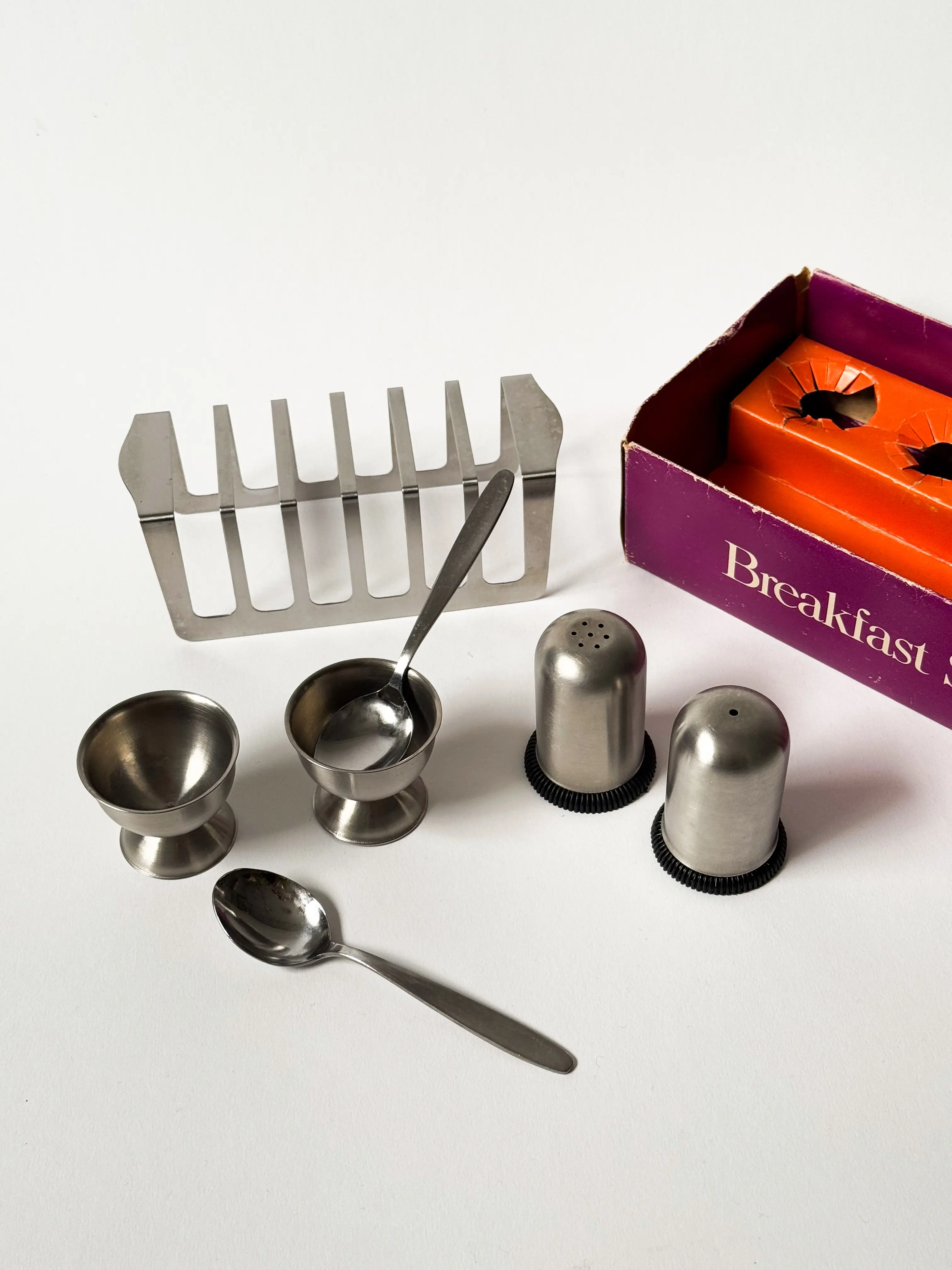 Vintage stainless steel breakfast set in original box. Includes: 1 x toast rack, 2 x egg cups, 2 x spoons and salt & pepper shakers. In good condition. Has been cleaned and inspected by Mendera.