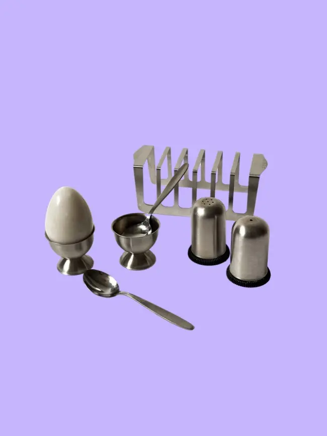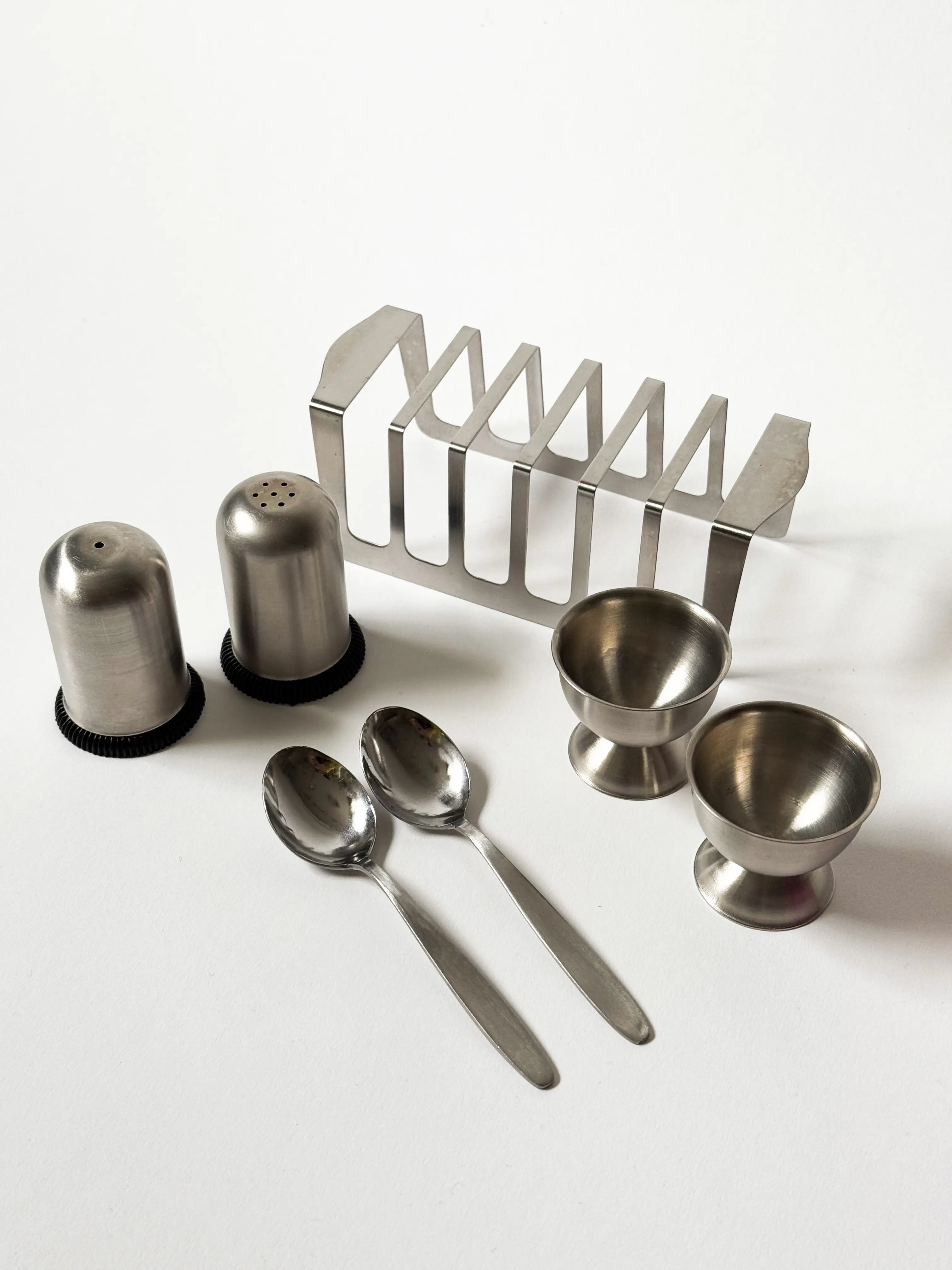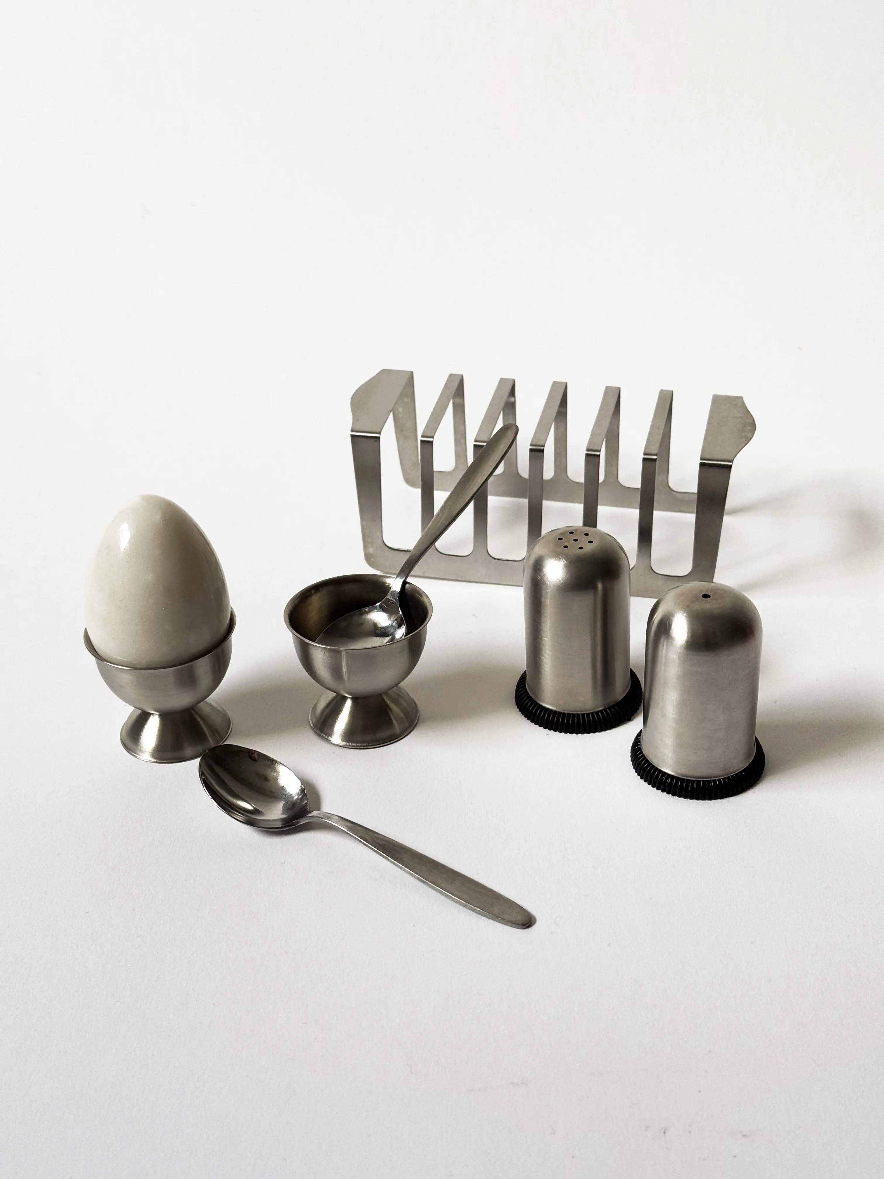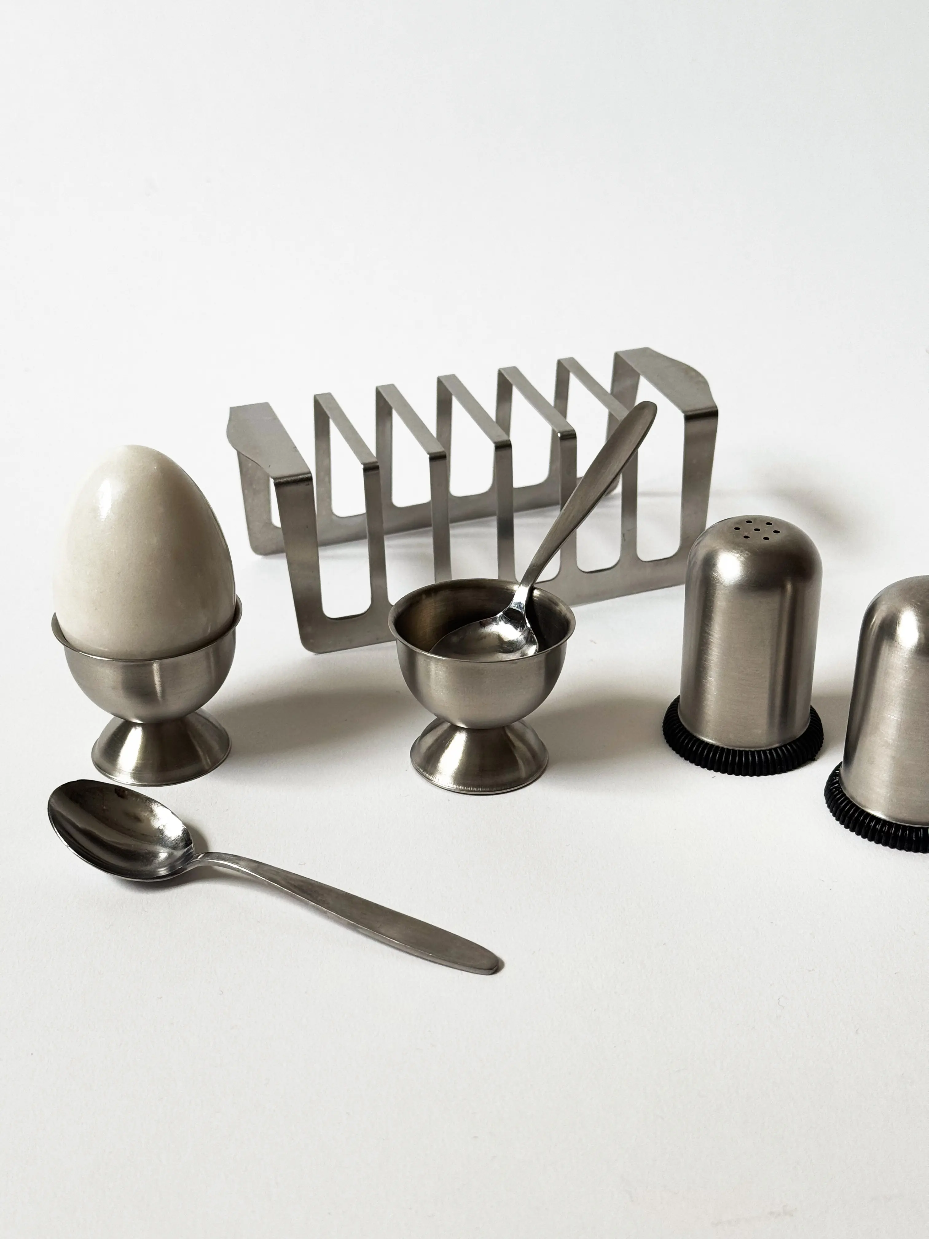 Vintage stainless steel breakfast set in original box. Includes: 1 x toast rack, 2 x egg cups, 2 x spoons and salt & pepper shakers. In good condition. Has been cleaned and inspected by Mendera.