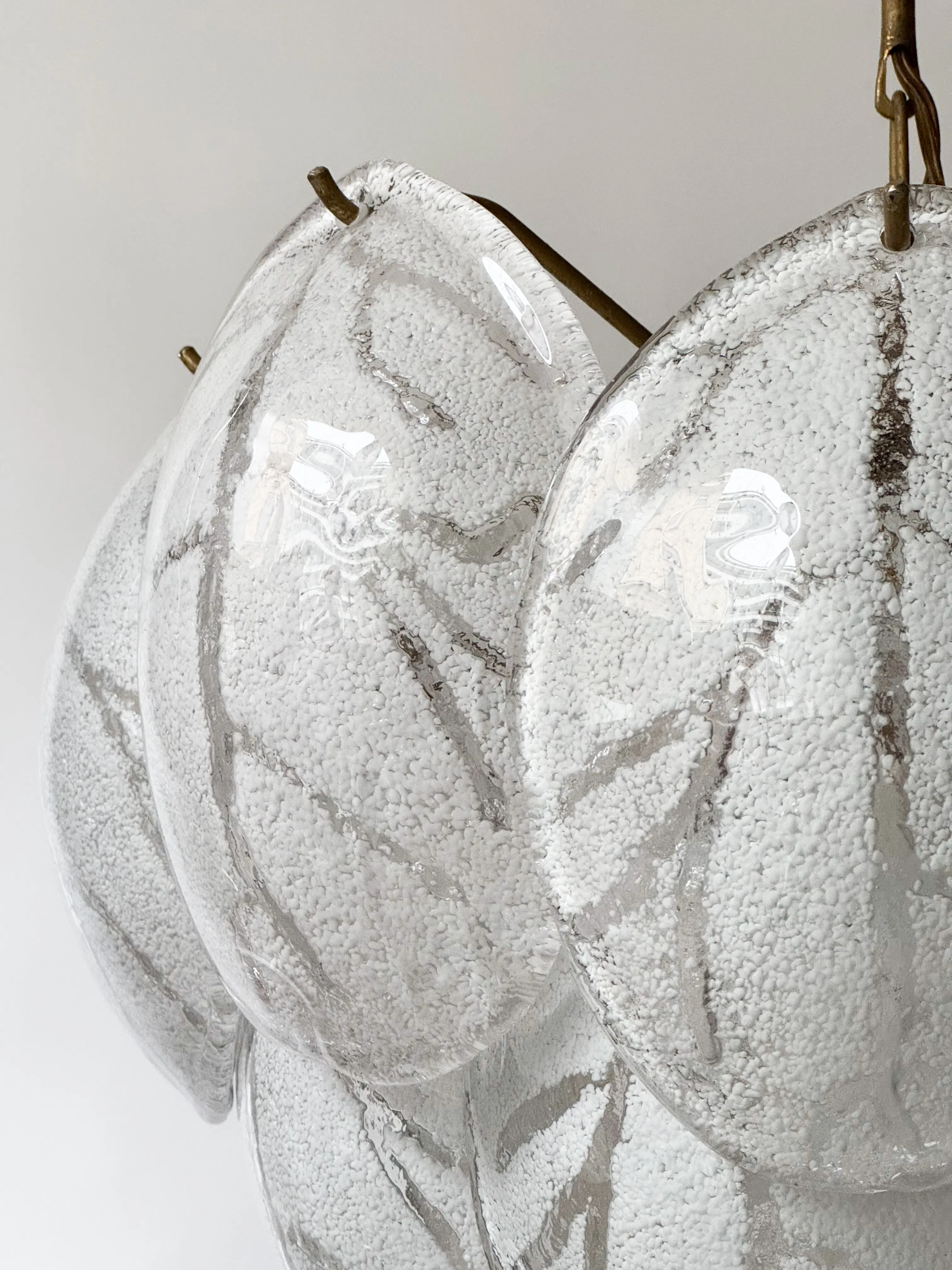 Murano chandelier from the 1970’s Italy. Consisting of 18 thick handblown glass leafs on a golden metal frame. 6 light sources in total, giving lots of light to the space. The frosted glass leafs filters the light beautifully. The size of each glass leaf is ca 21 x 18cm. In very good vintage condition, all glass leafs intact. Some normal signs of wear on the metal frame. Has been cleaned, inspected and tested by Mendera.