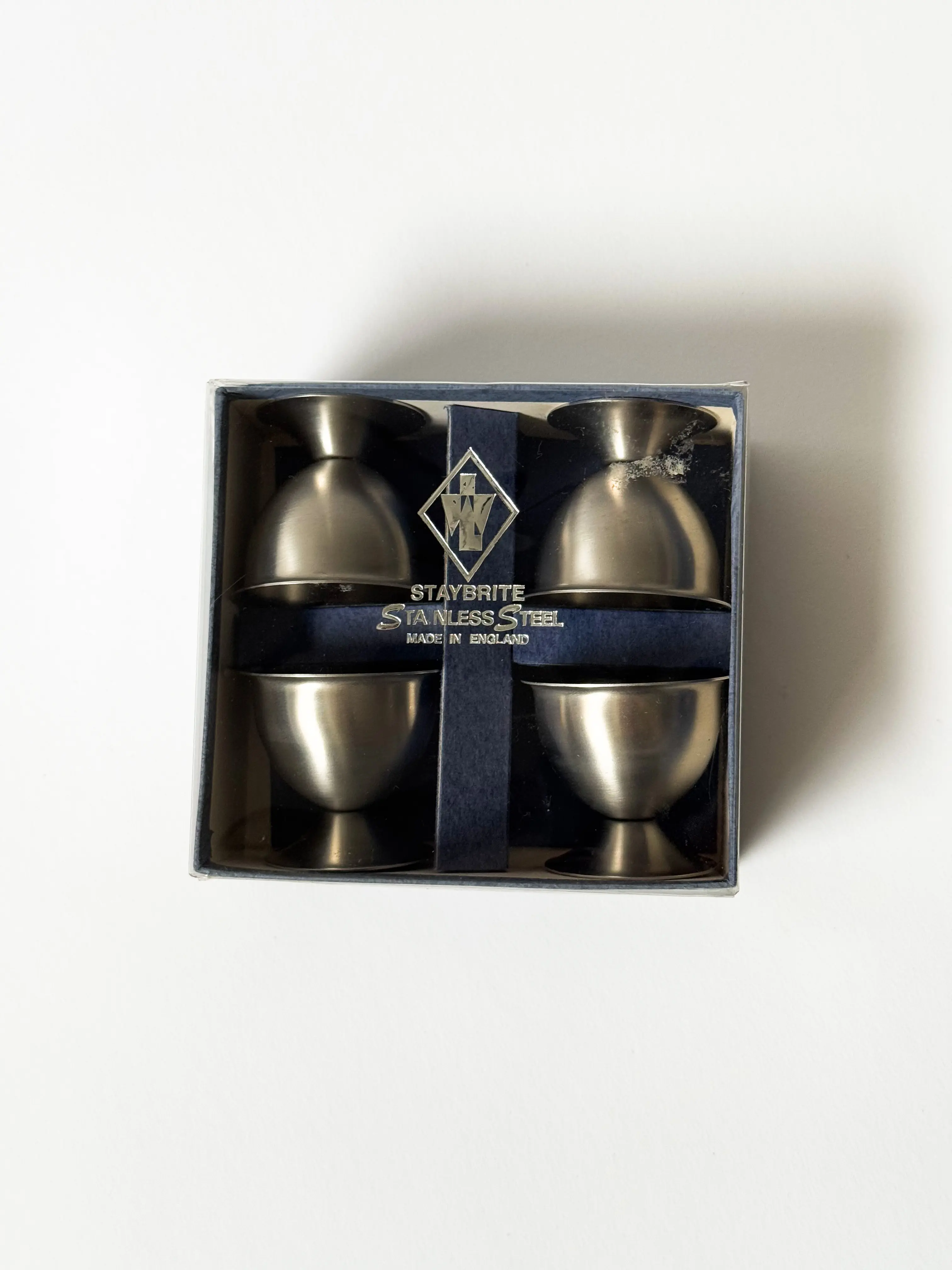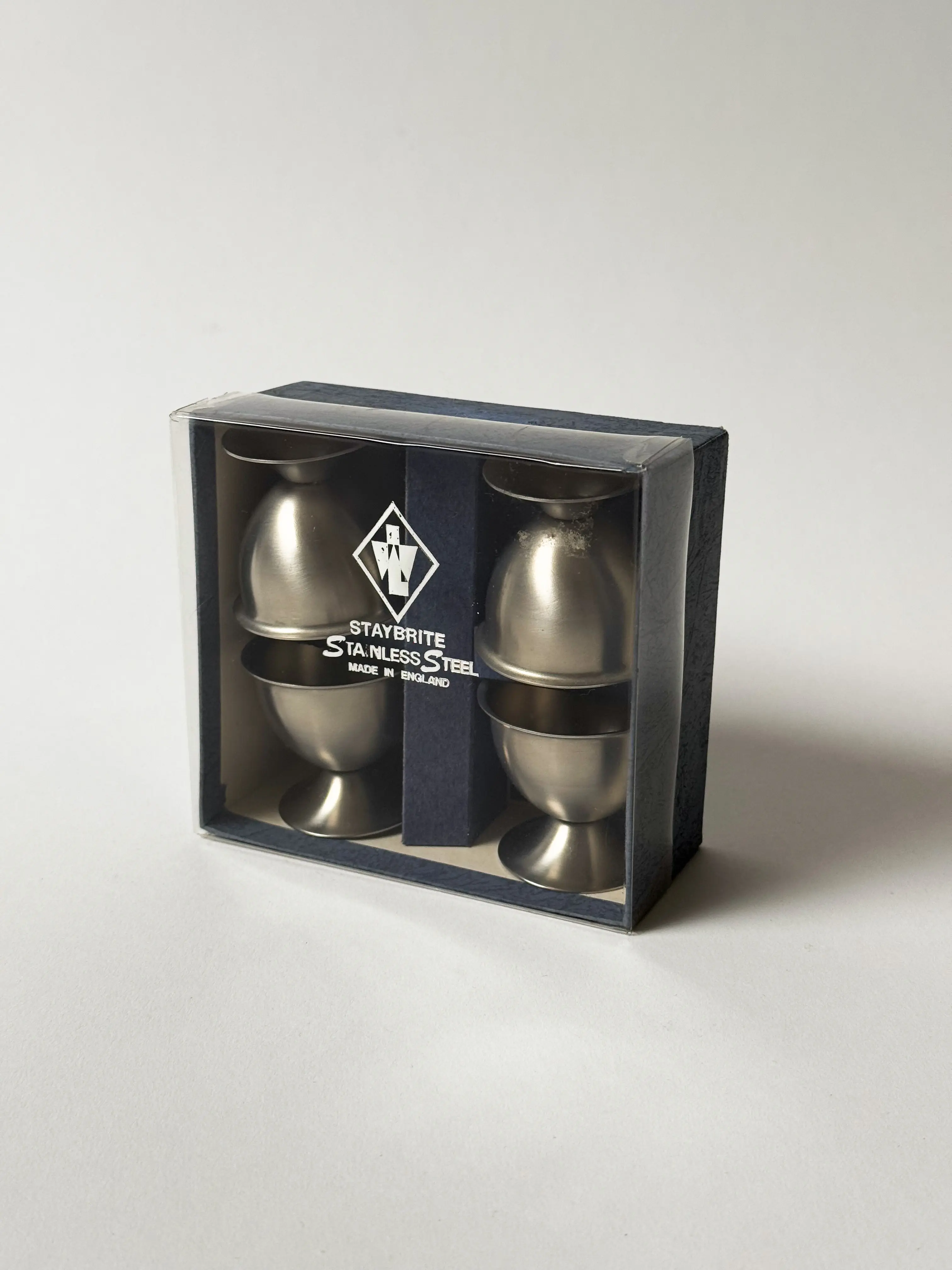Vintage Staybrite stainless steel egg cups in original box. Made in England. Set of 4. In great (unused) condition. Have been cleaned and inspected by Mendera.