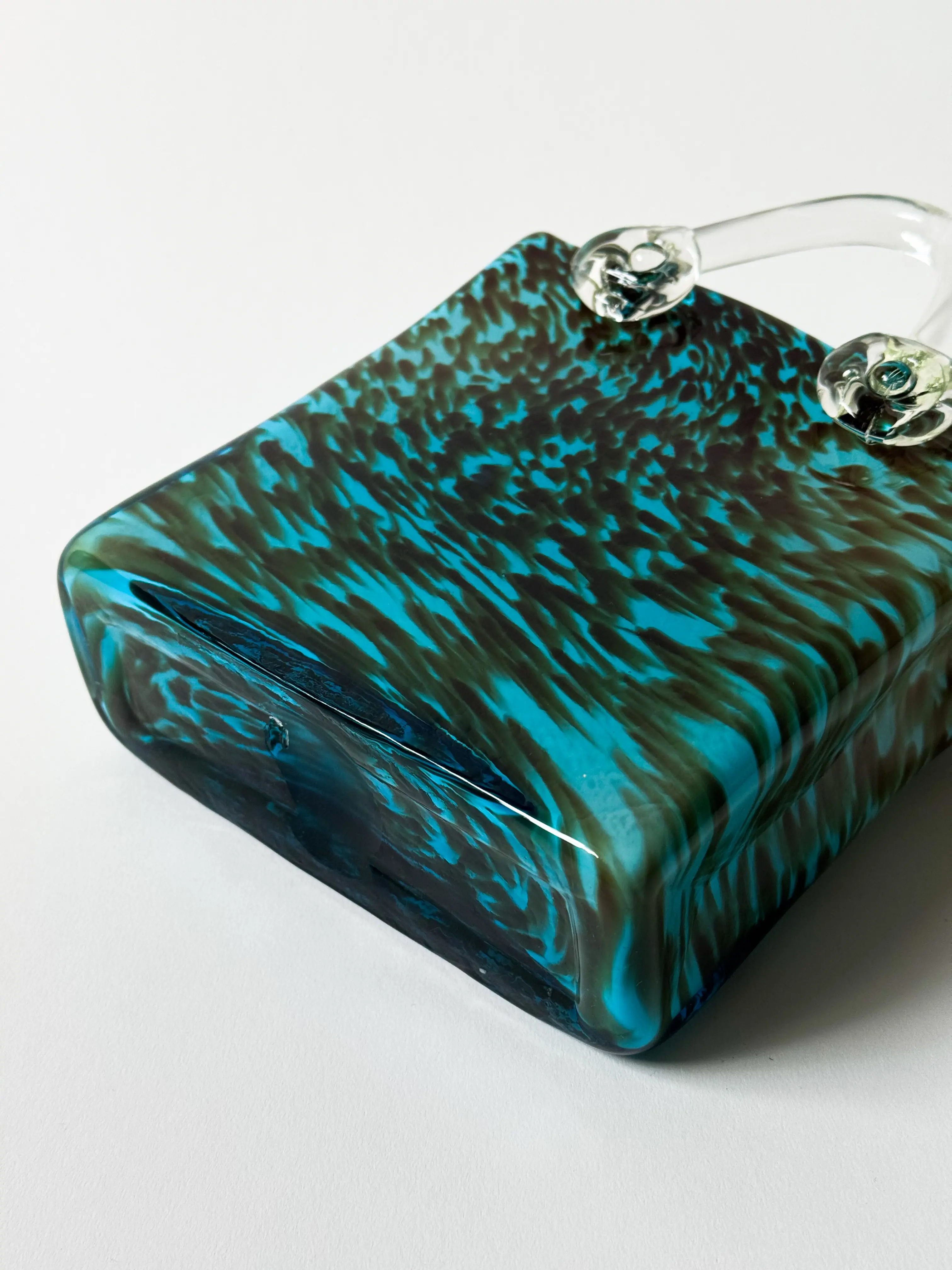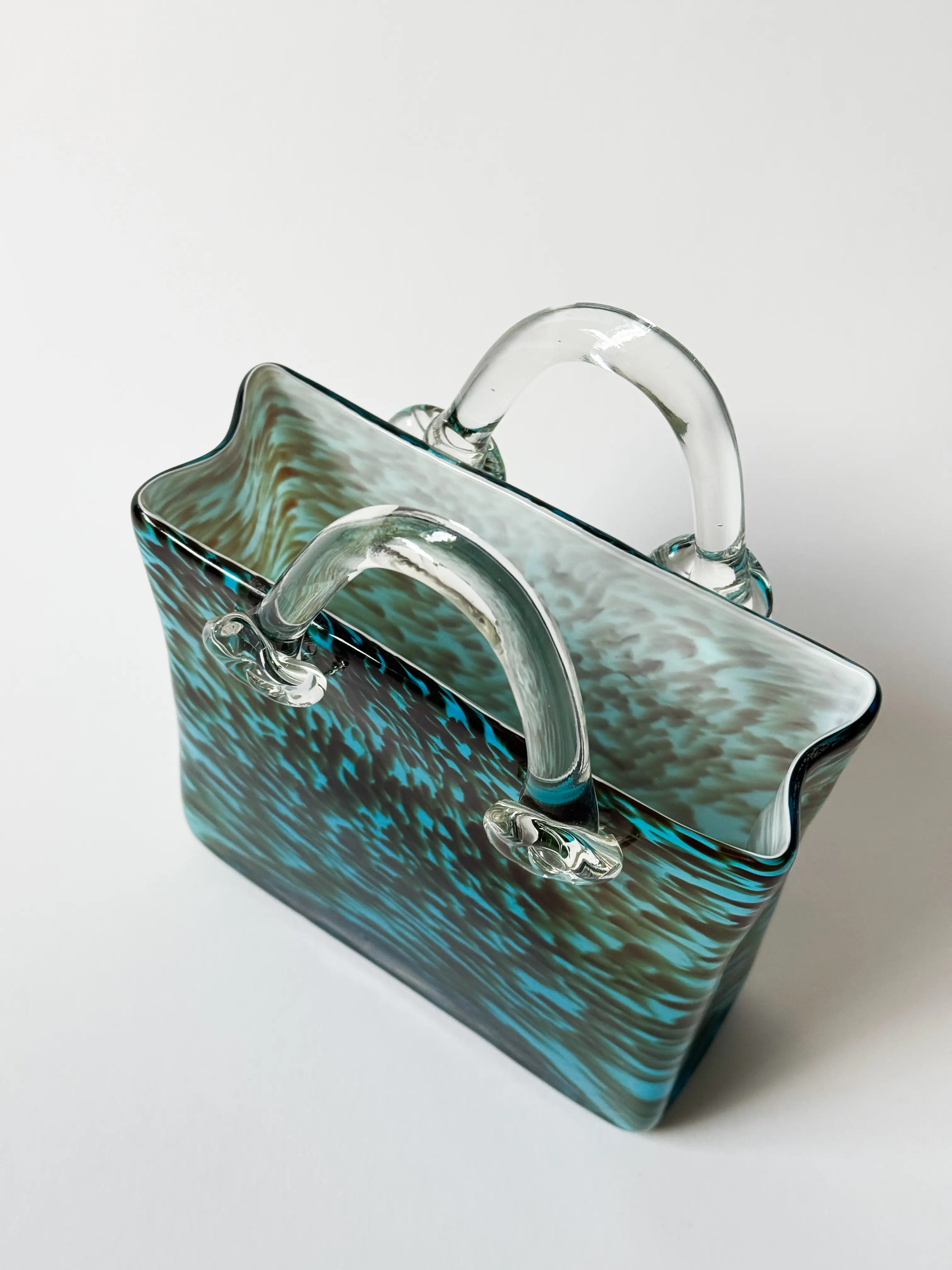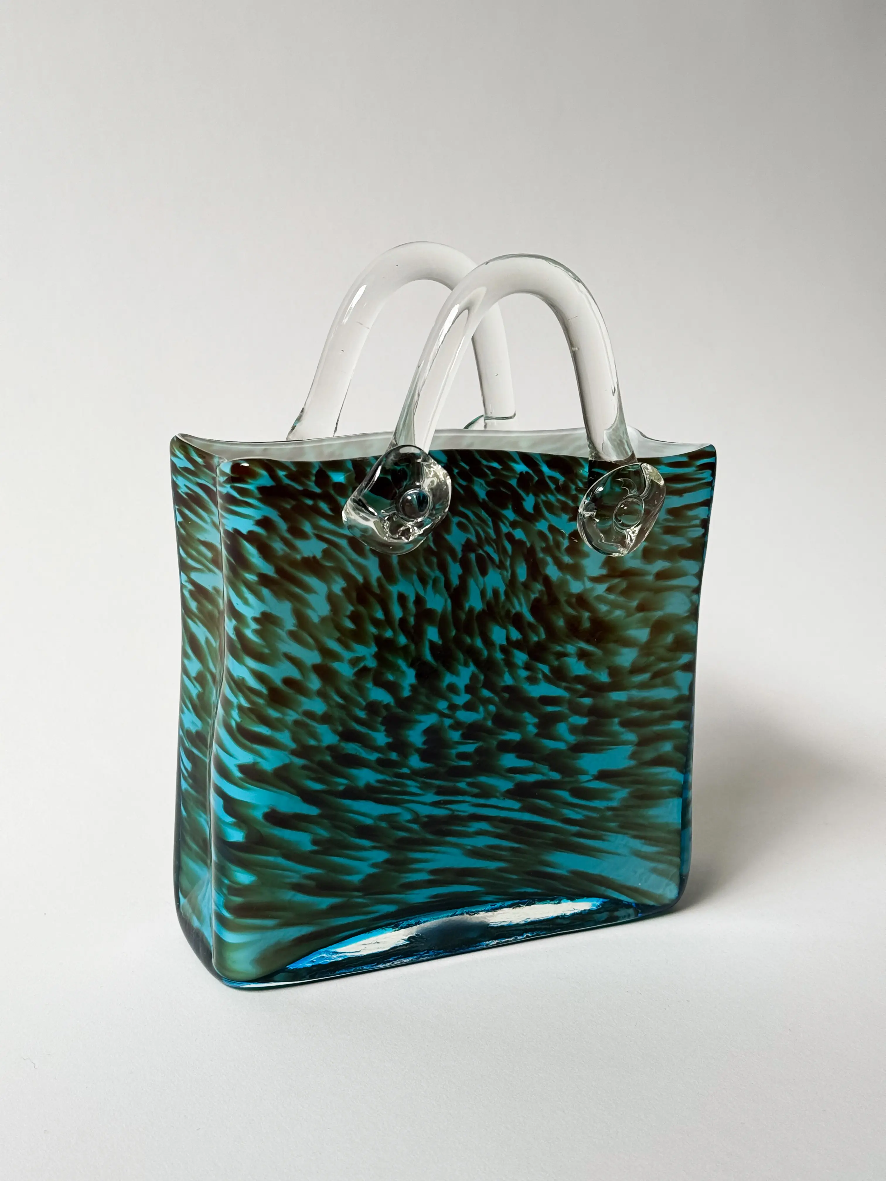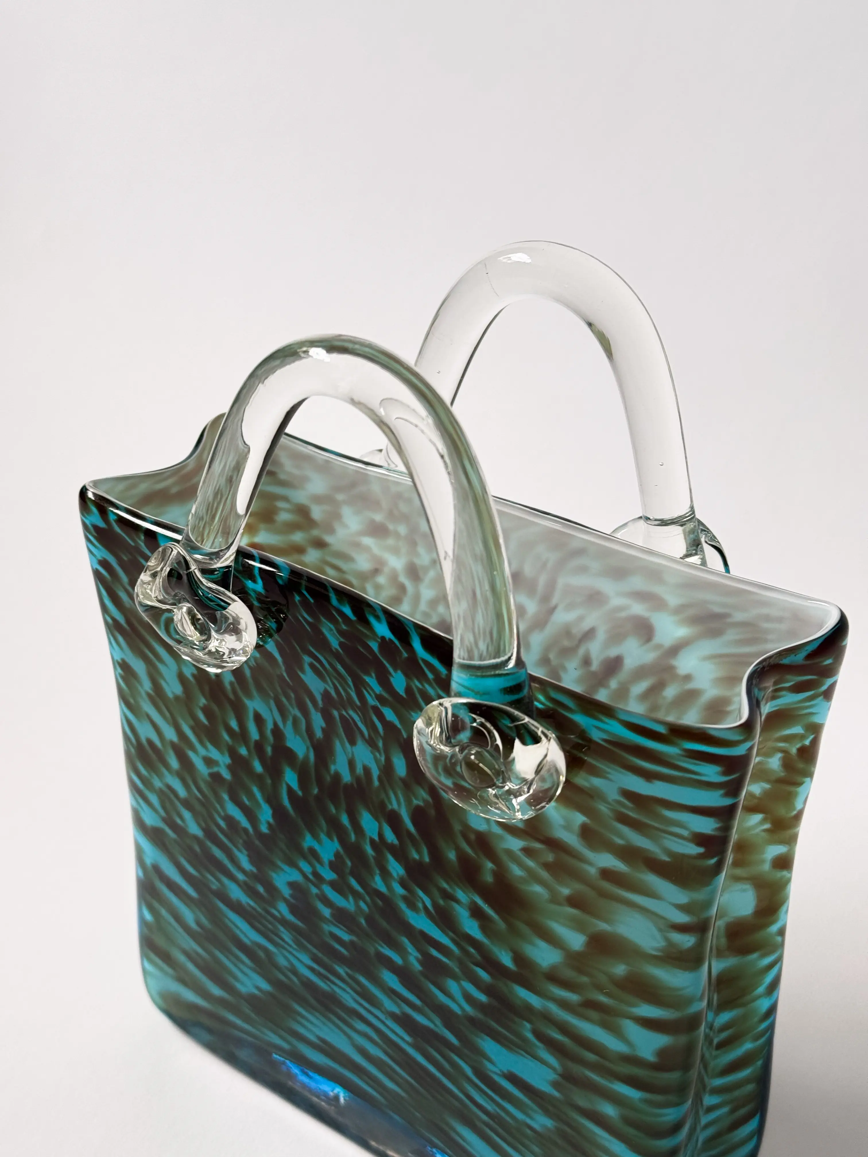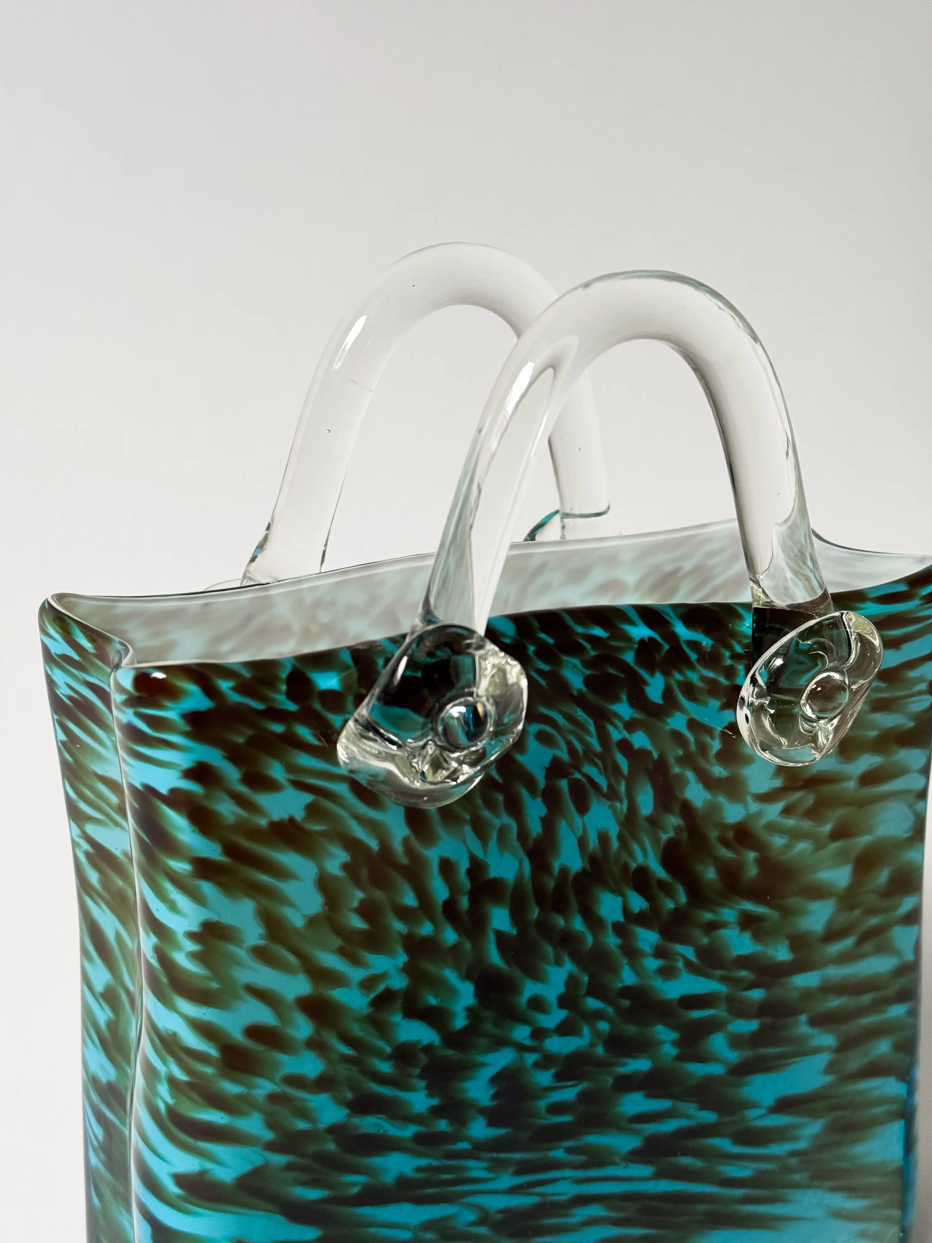 Unique vintage handbag vase in handblown glass. Turquoise, brown and clear glass. Mint condition. Has been cleaned and inspected by Mendera.