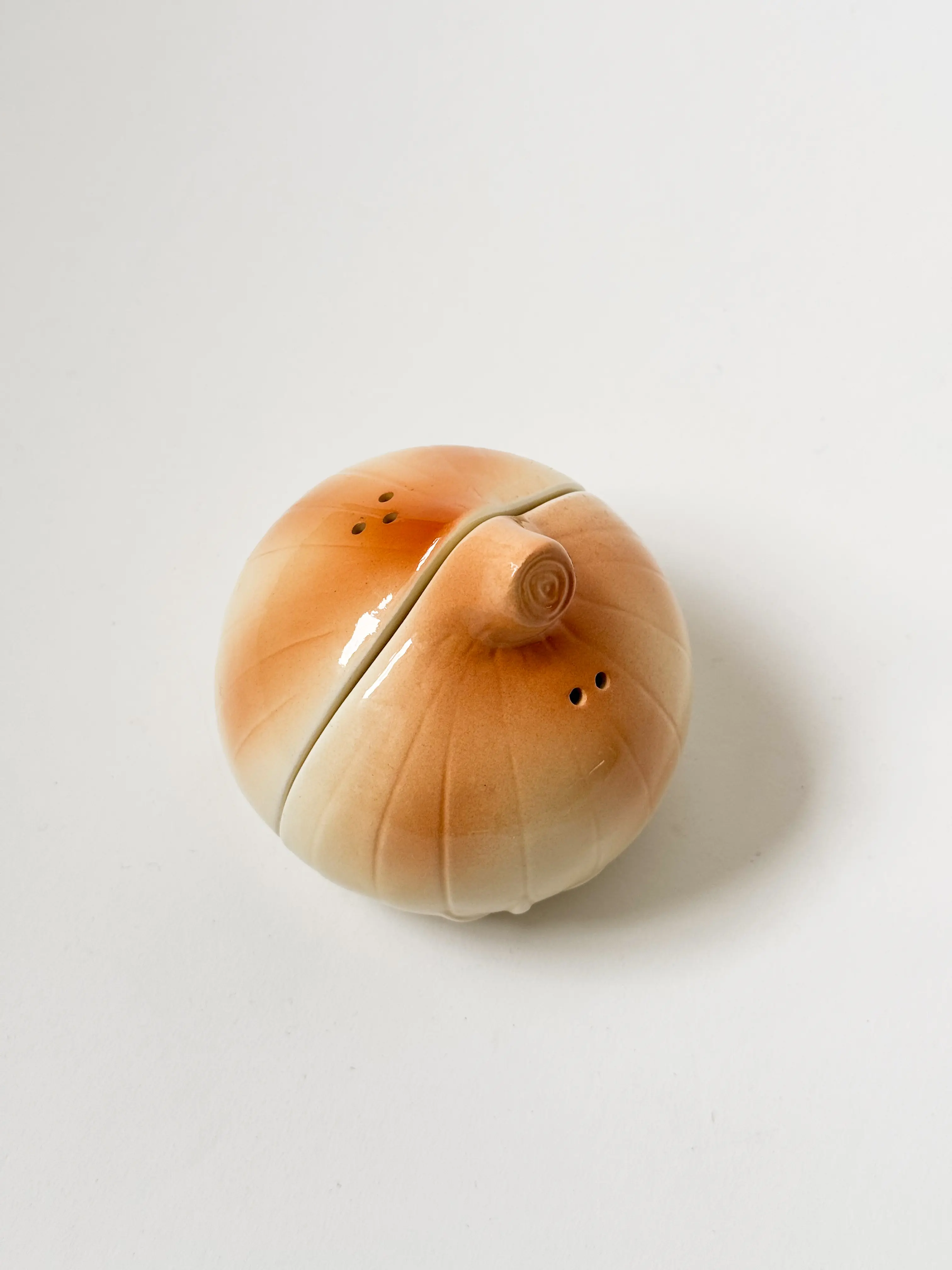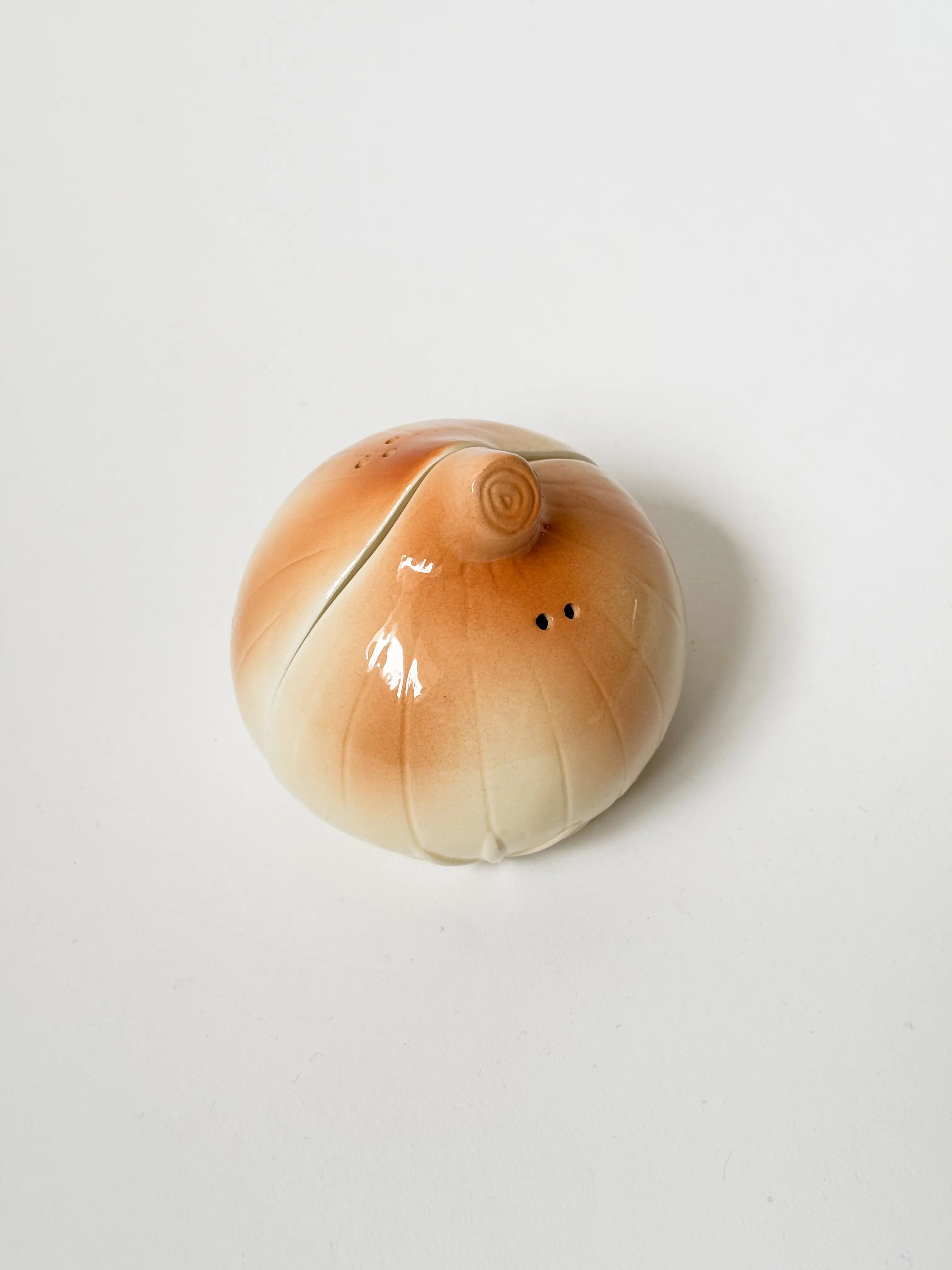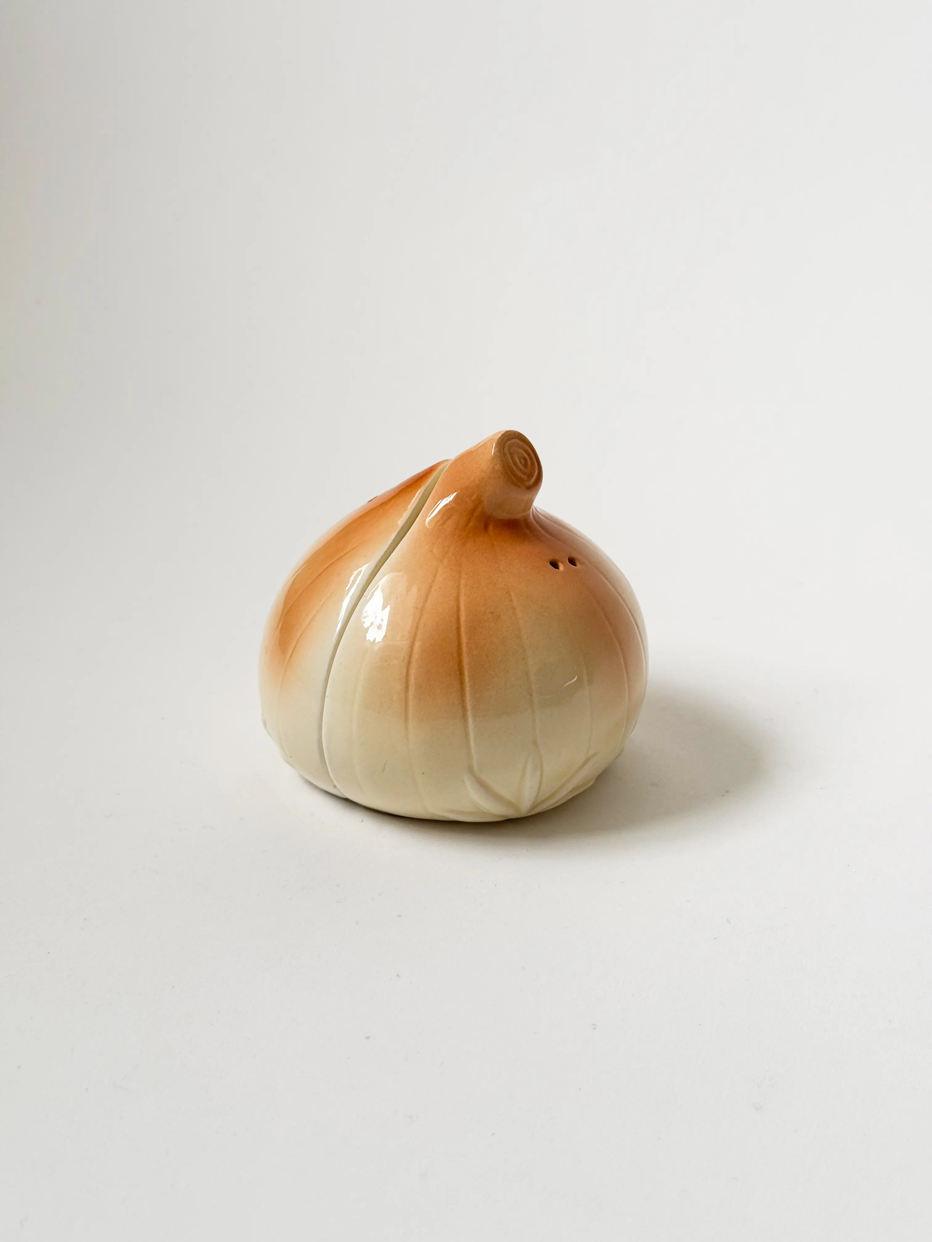 Mid-century onion shaped salt & pepper shakers. Handpainted ceramic, England. Refill from bottom. In excellent condition. Has been cleaned and inspected by Mendera.