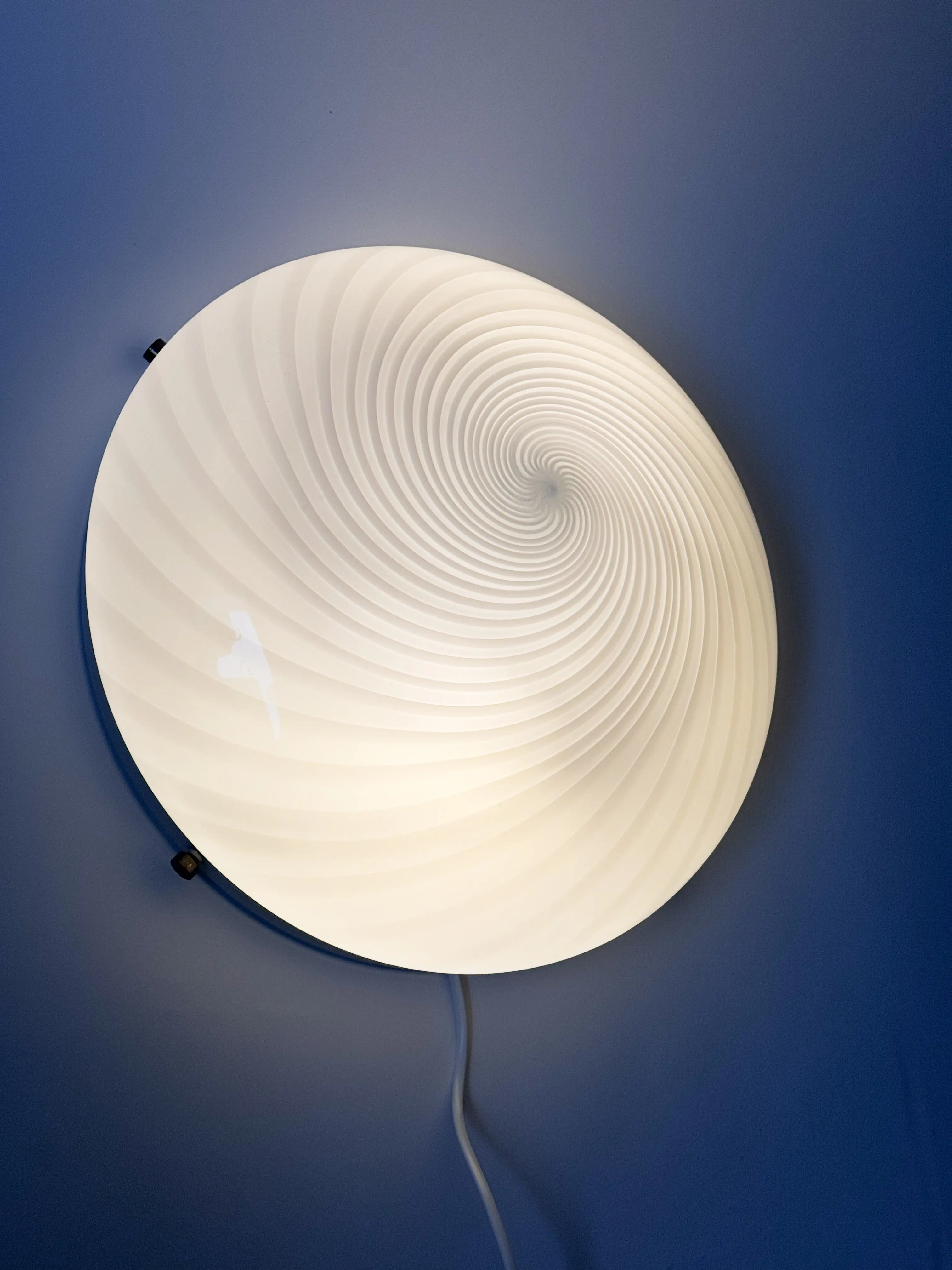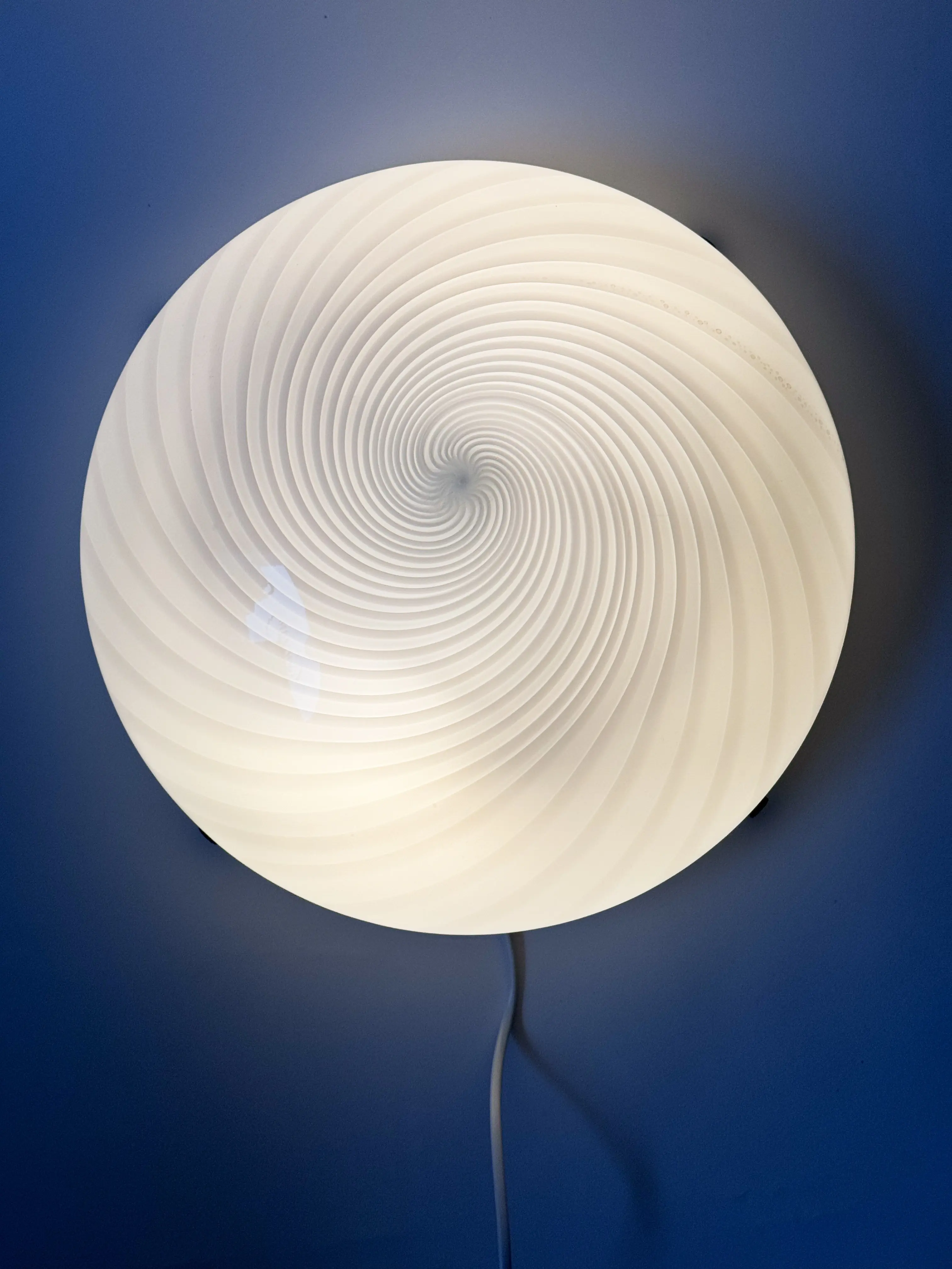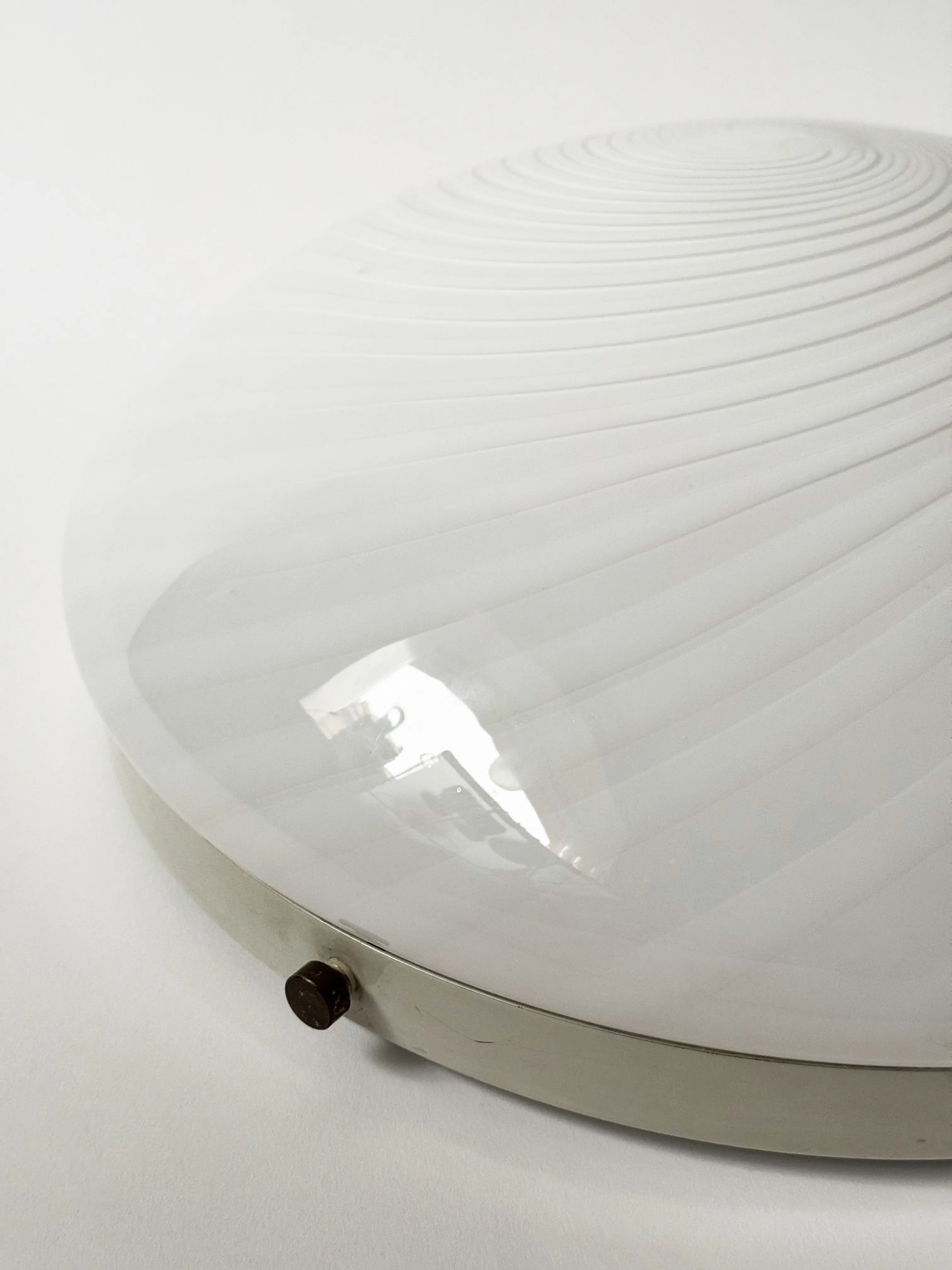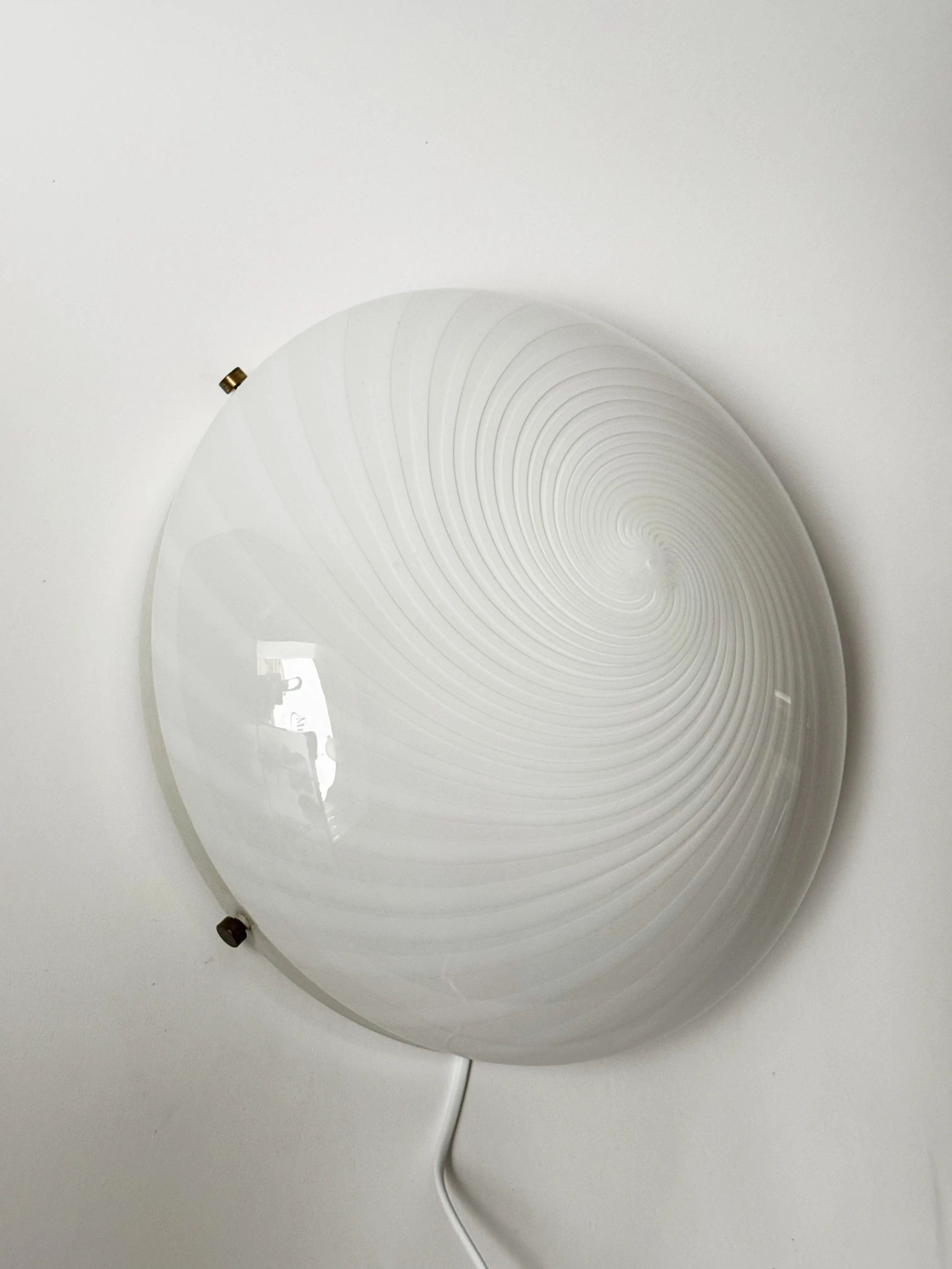 Large vintage Murano ceiling / wall lamp in handblown glass, made in Italy. Beautiful swirl pattern in opaque and translucent milky white glass. White metal frame. Two E27 light sources inside. PLEASE NOTE: the lamp will be customised after purchase to desired purpose: either wall or ceiling use (included in price). In great vintage condition. Has been cleaned and inspected by Mendera.