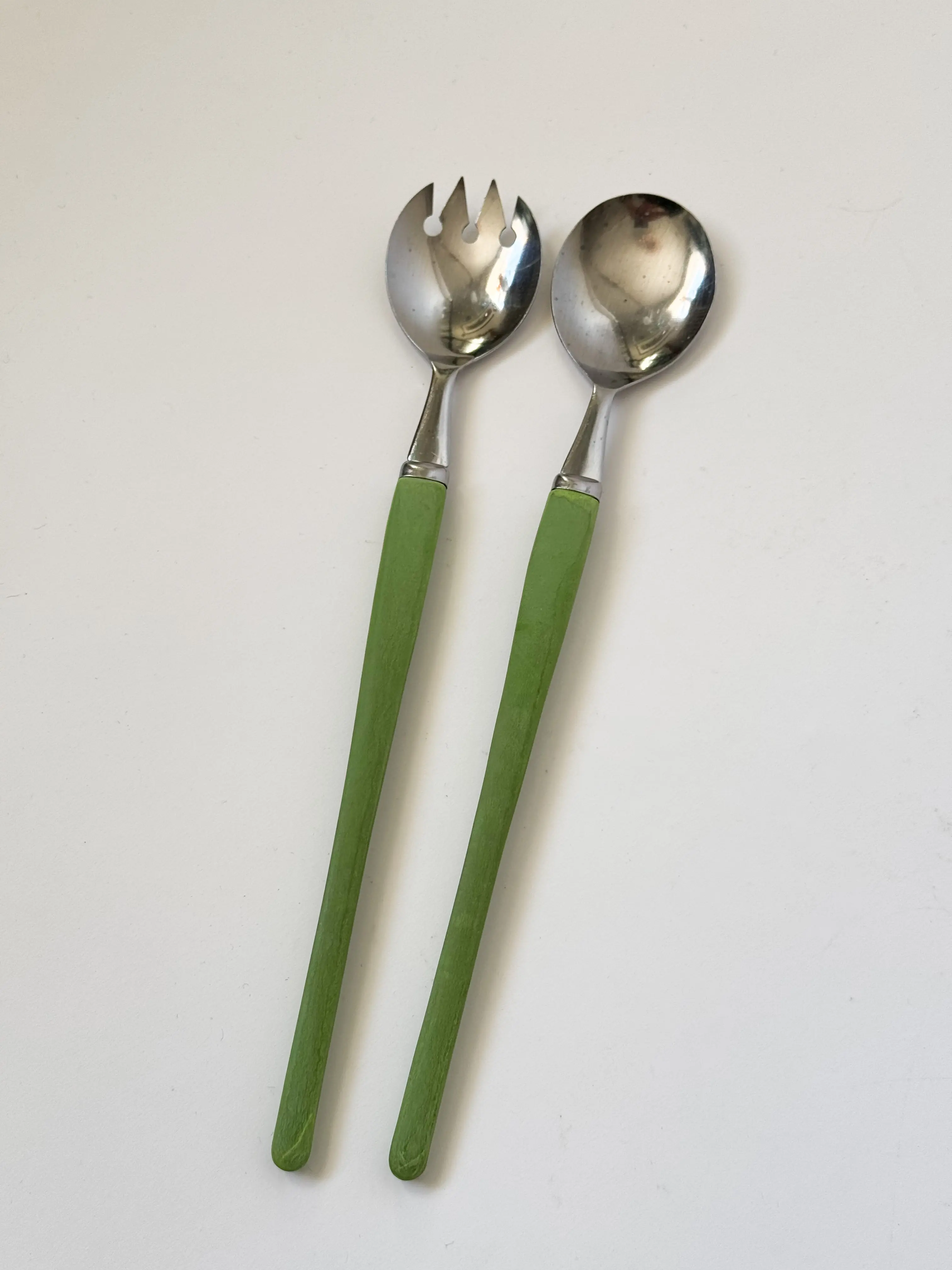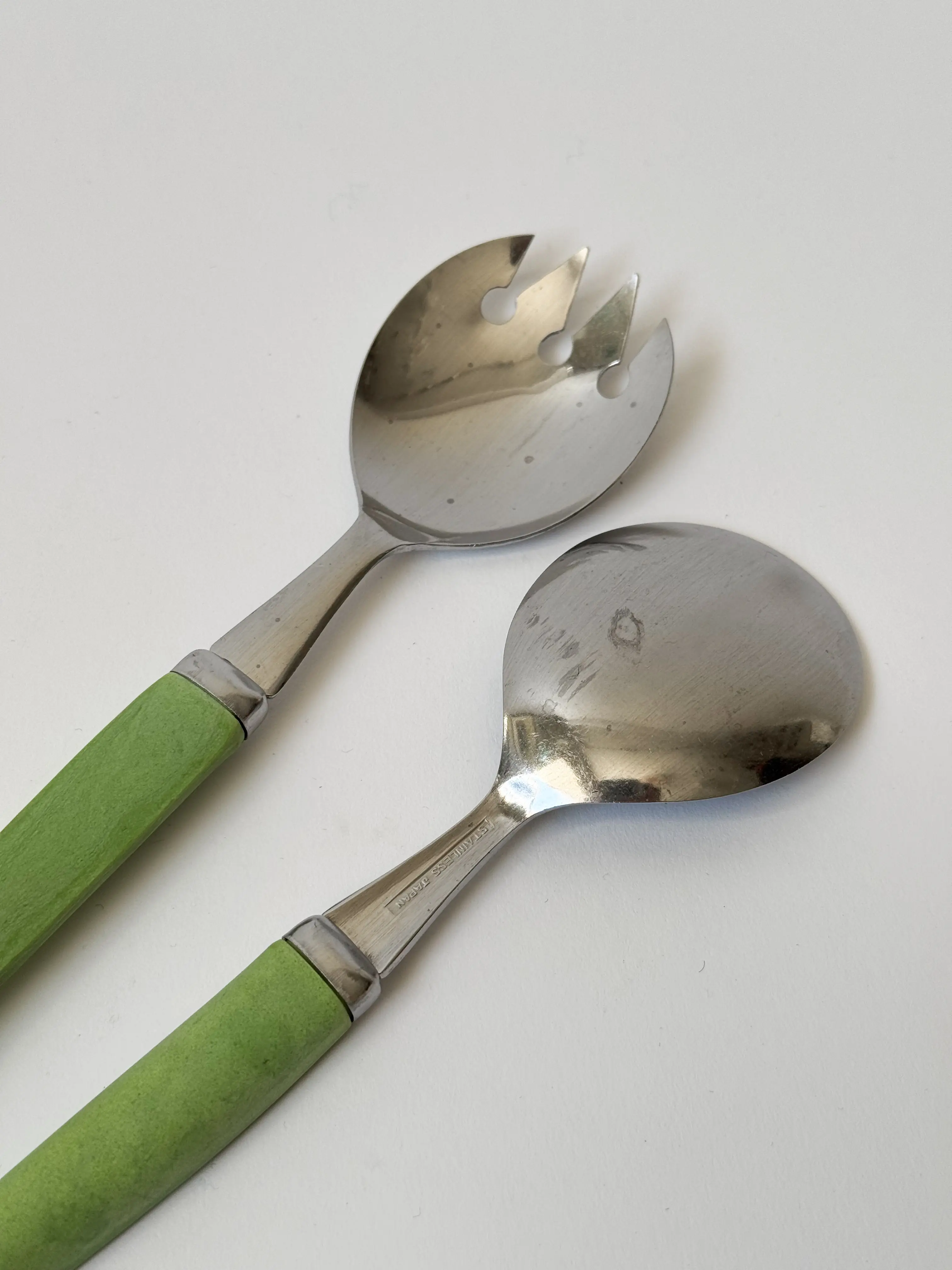 Green vintage salad servers in stainless steel, made in Japan. In overall good vintage condition with some patina. Have been cleaned and inspected by Mendera.