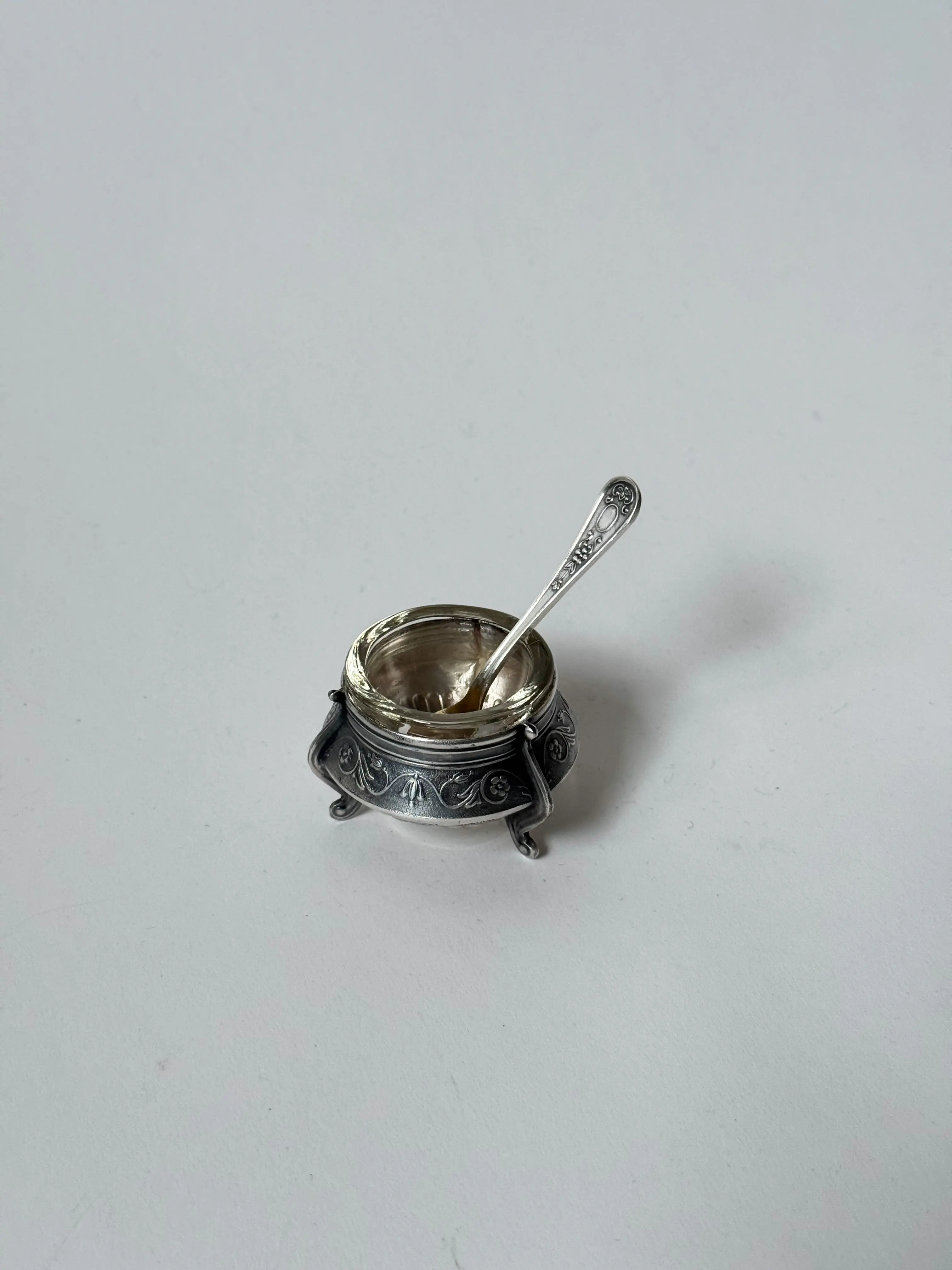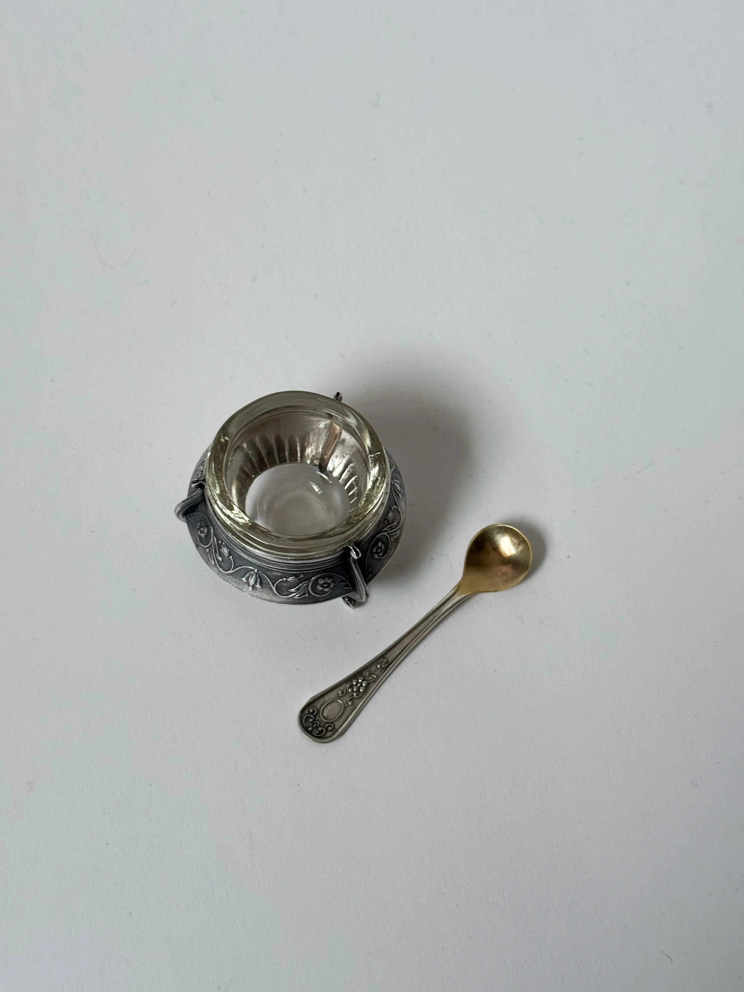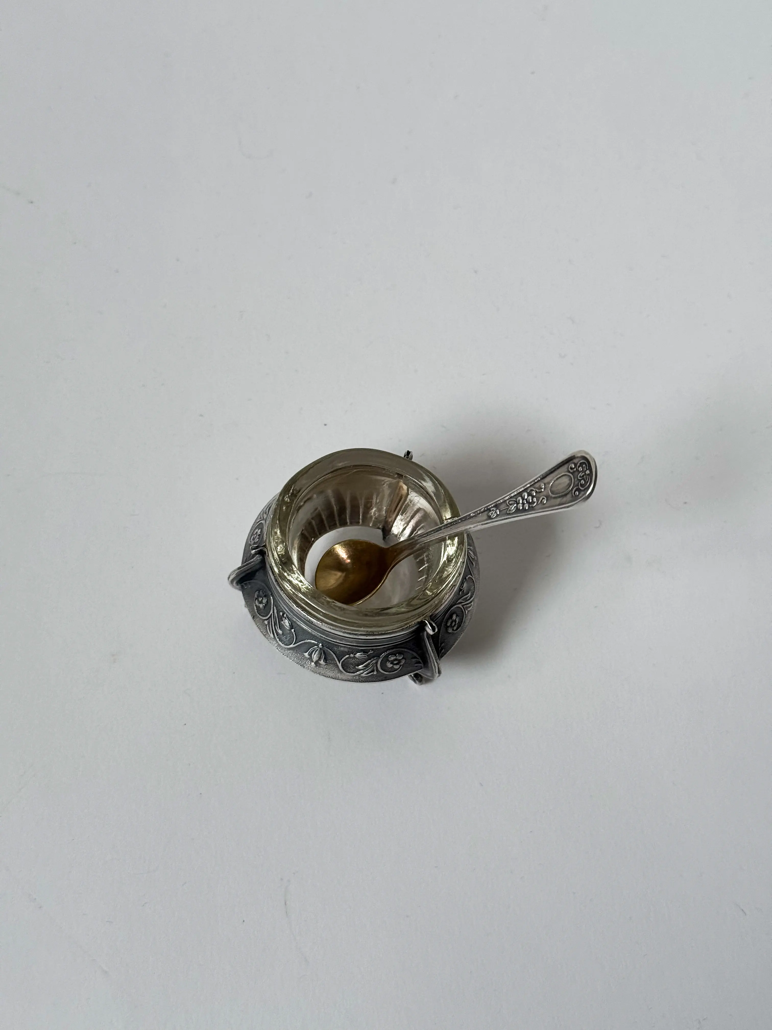 Super cute vintage salt cup and spoon in silver plated metal. Small glass cup inside. In great condition. Has been cleaned and inspected by Mendera.