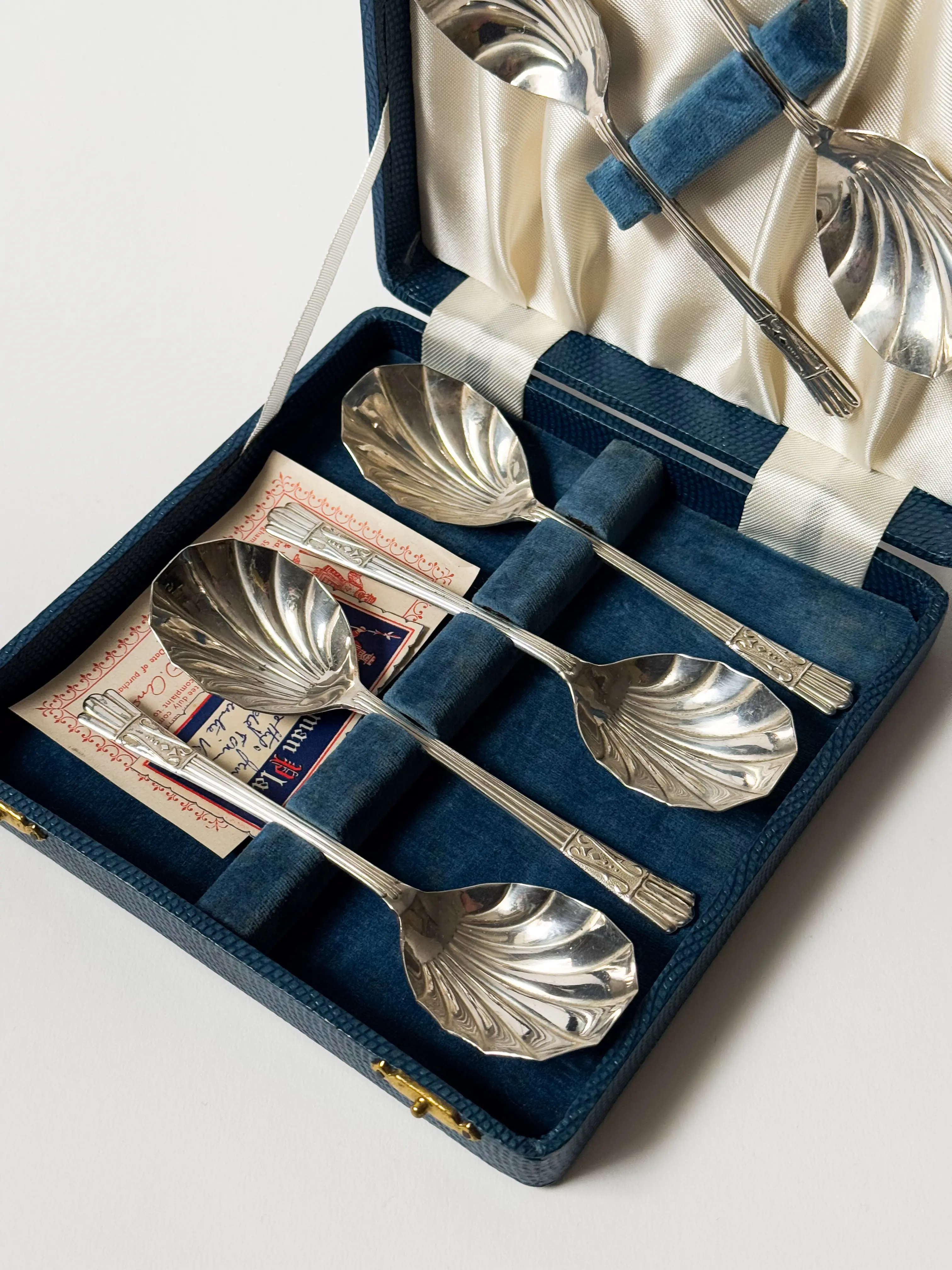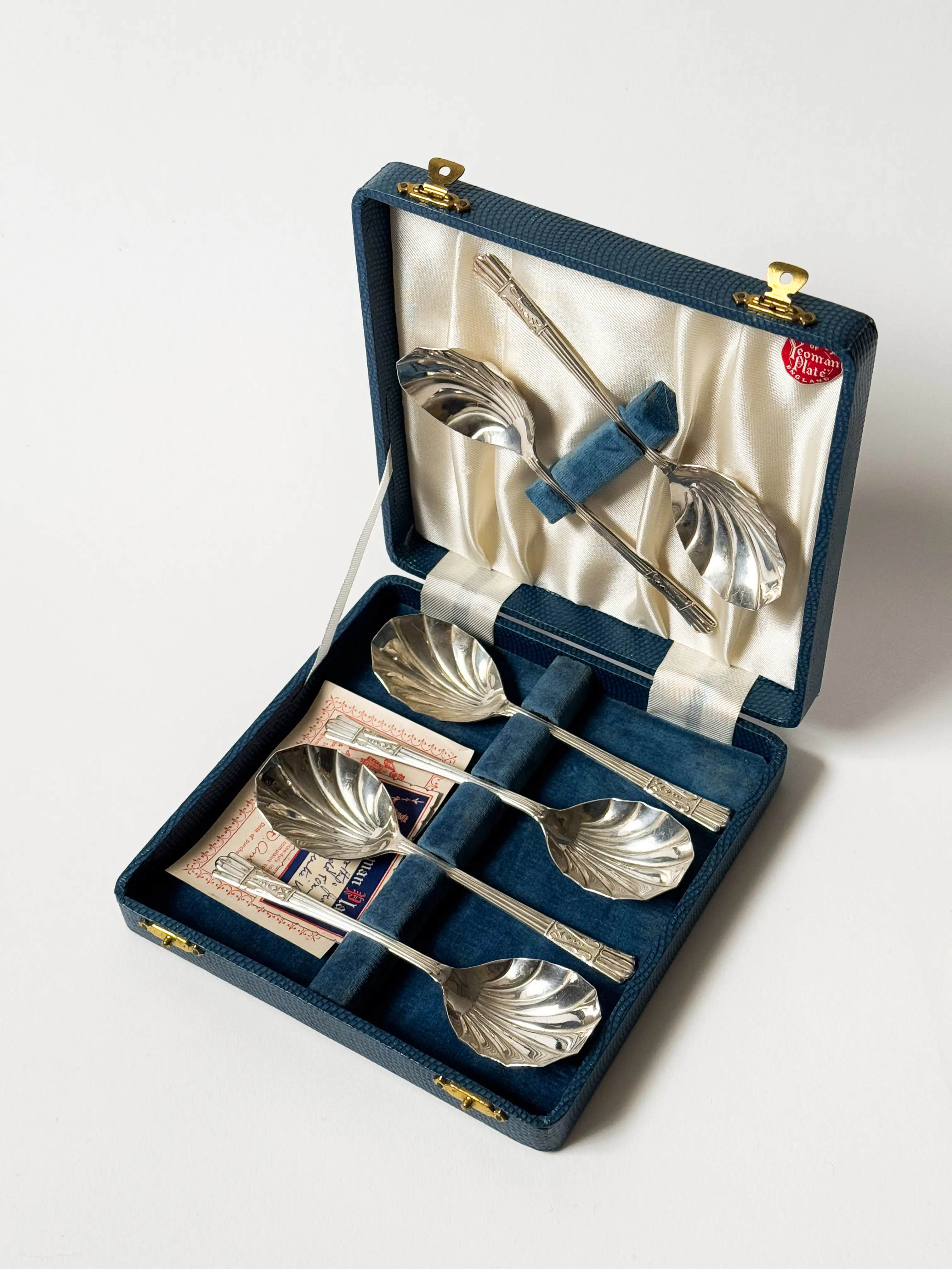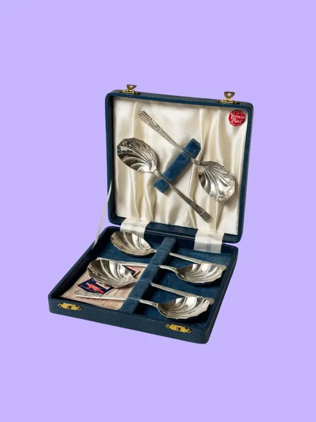 Vintage fruit / dessert spoons in original box with the guarantee card inside. Made in England. Beautiful shell shape. Each spoon hallmarked. Stunning gift set, great condition. Has been cleaned and inspected by Mendera.