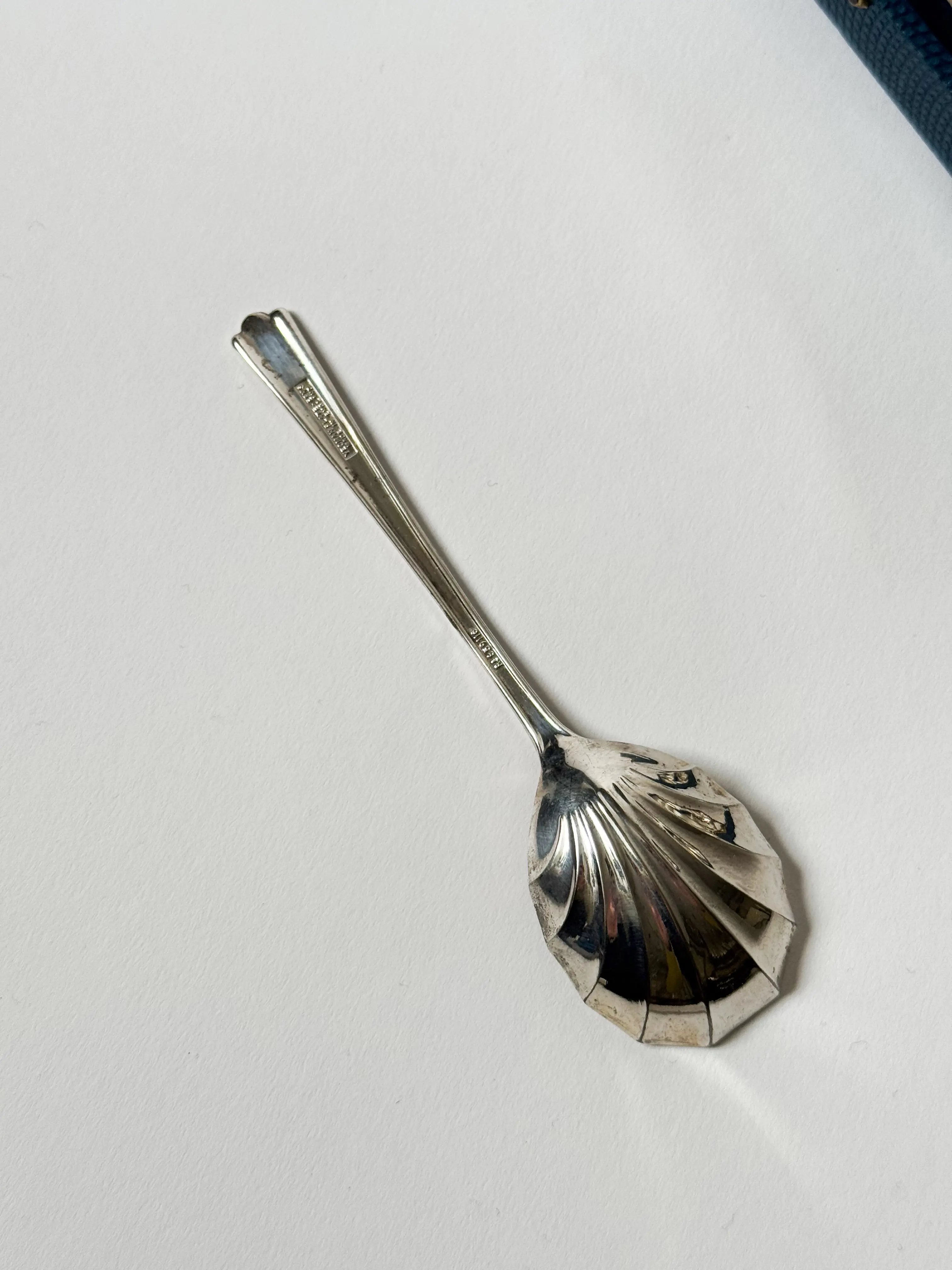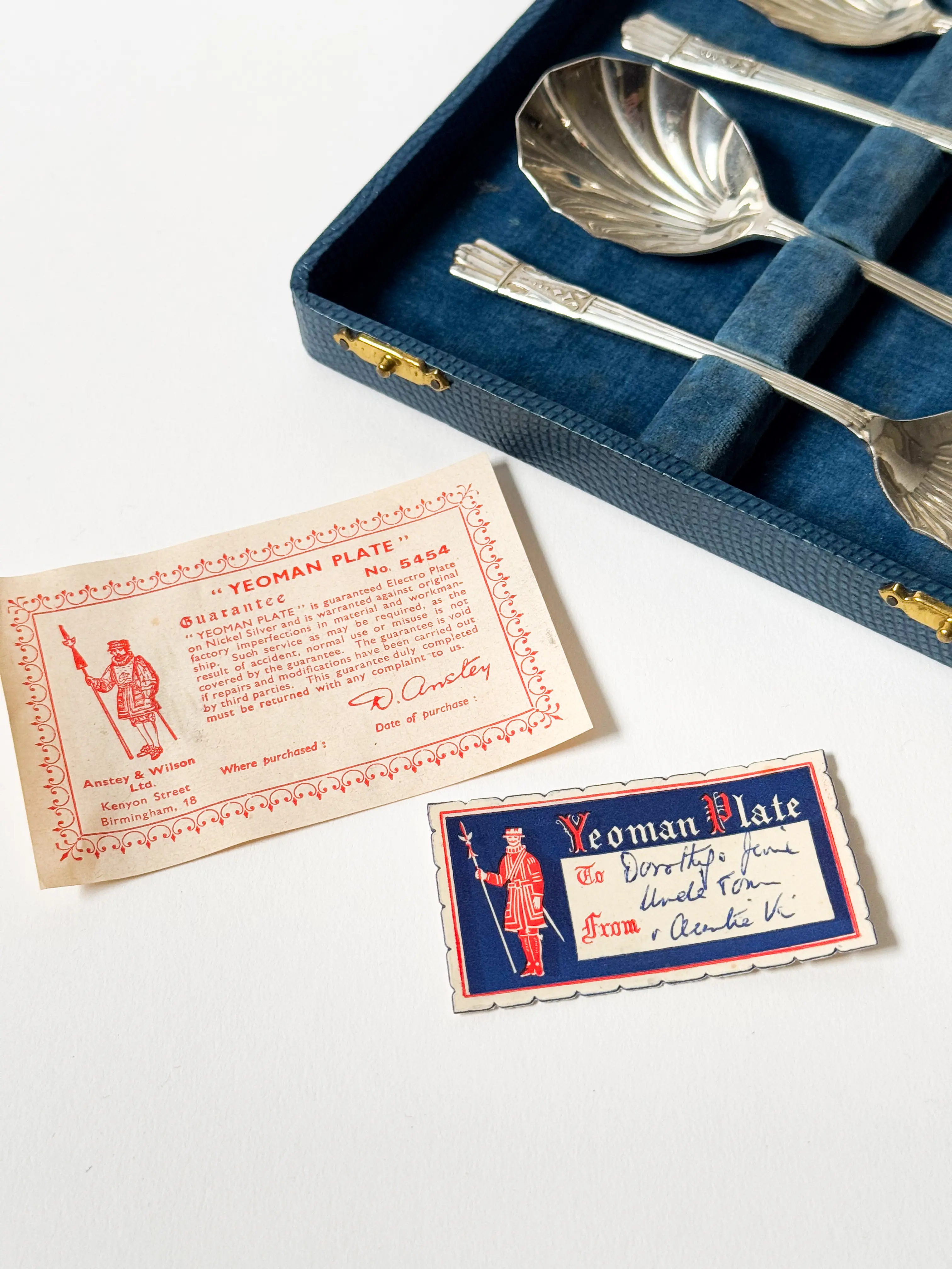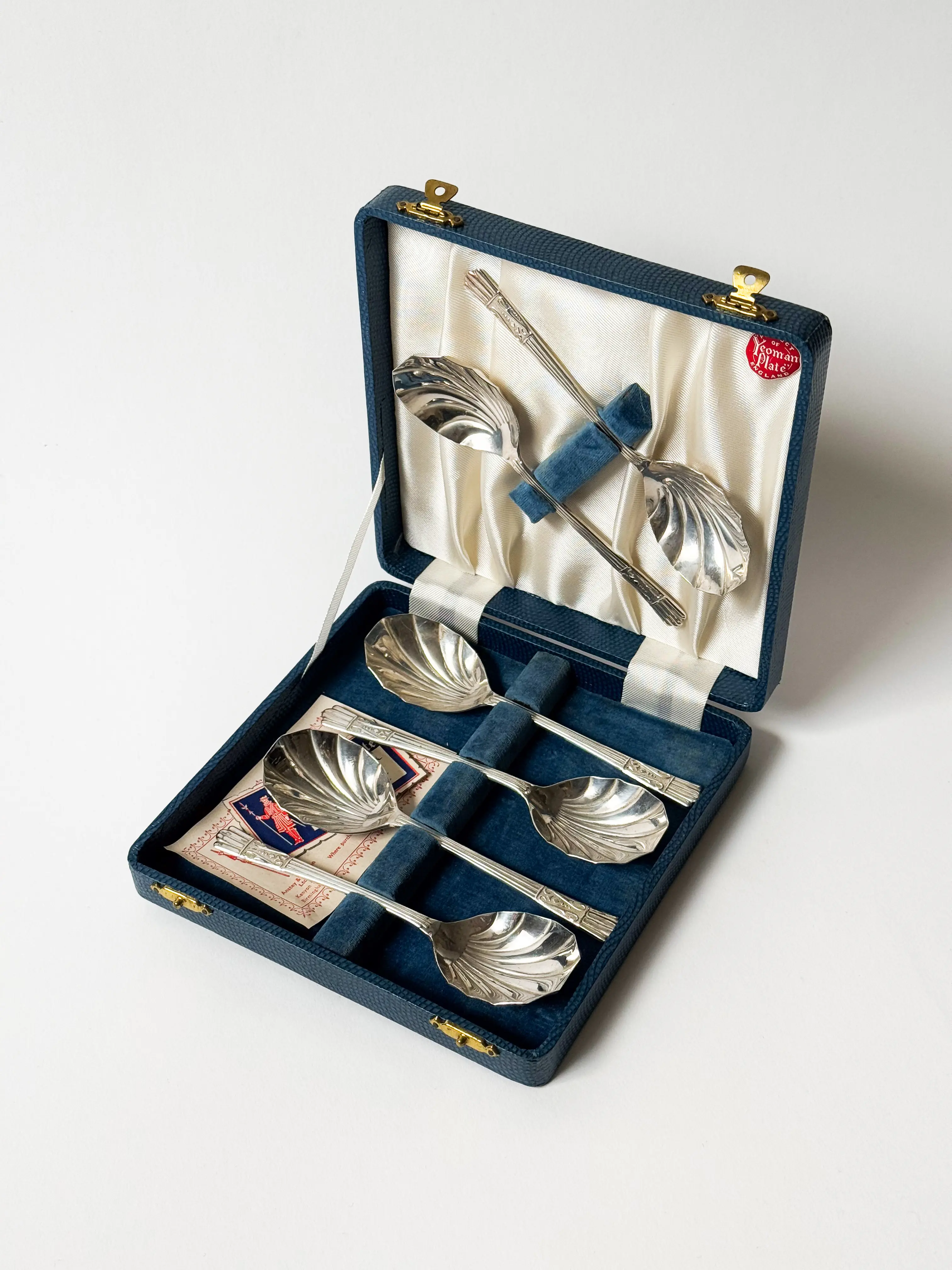 Vintage fruit / dessert spoons in original box with the guarantee card inside. Made in England. Beautiful shell shape. Each spoon hallmarked. Stunning gift set, great condition. Has been cleaned and inspected by Mendera.